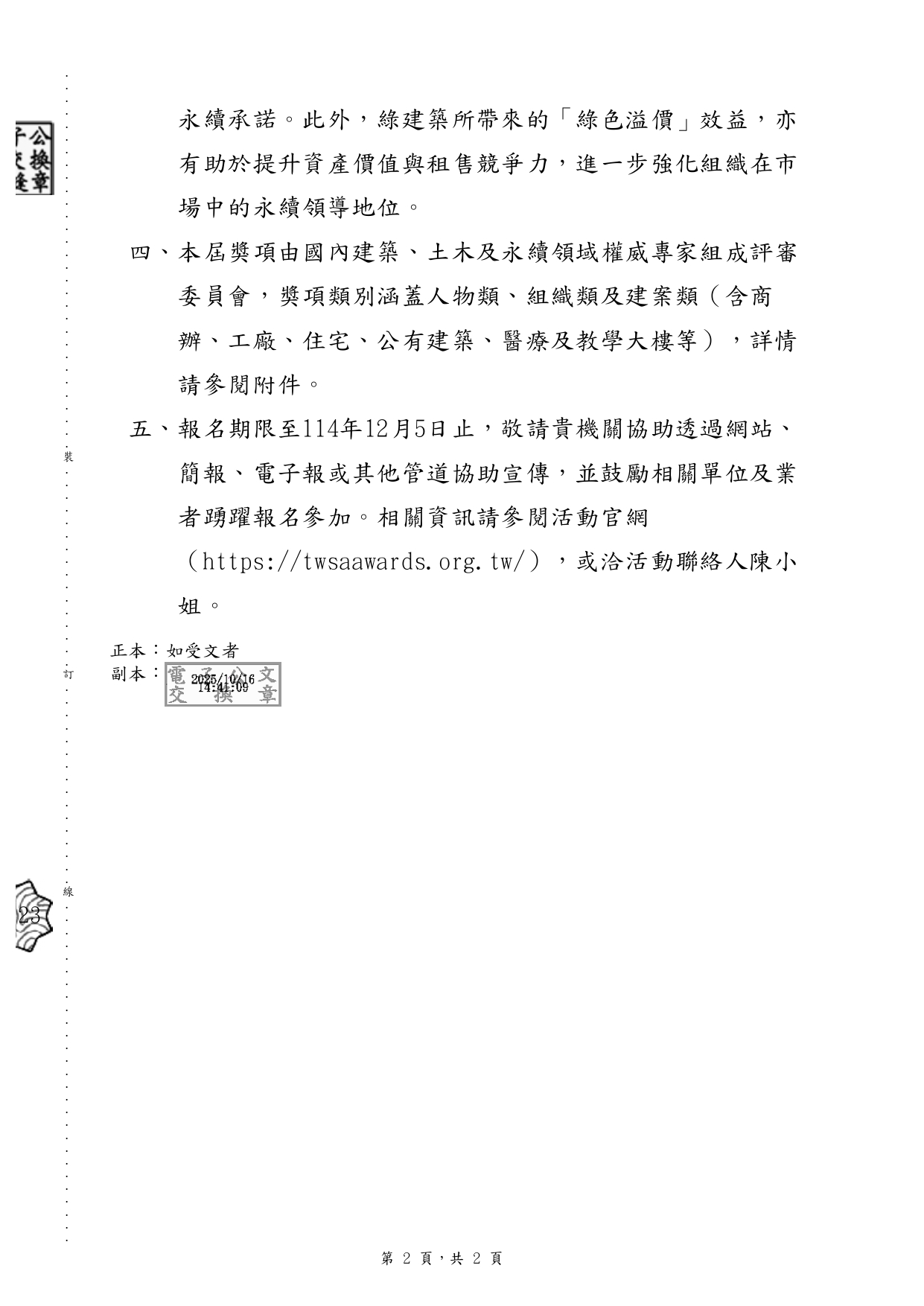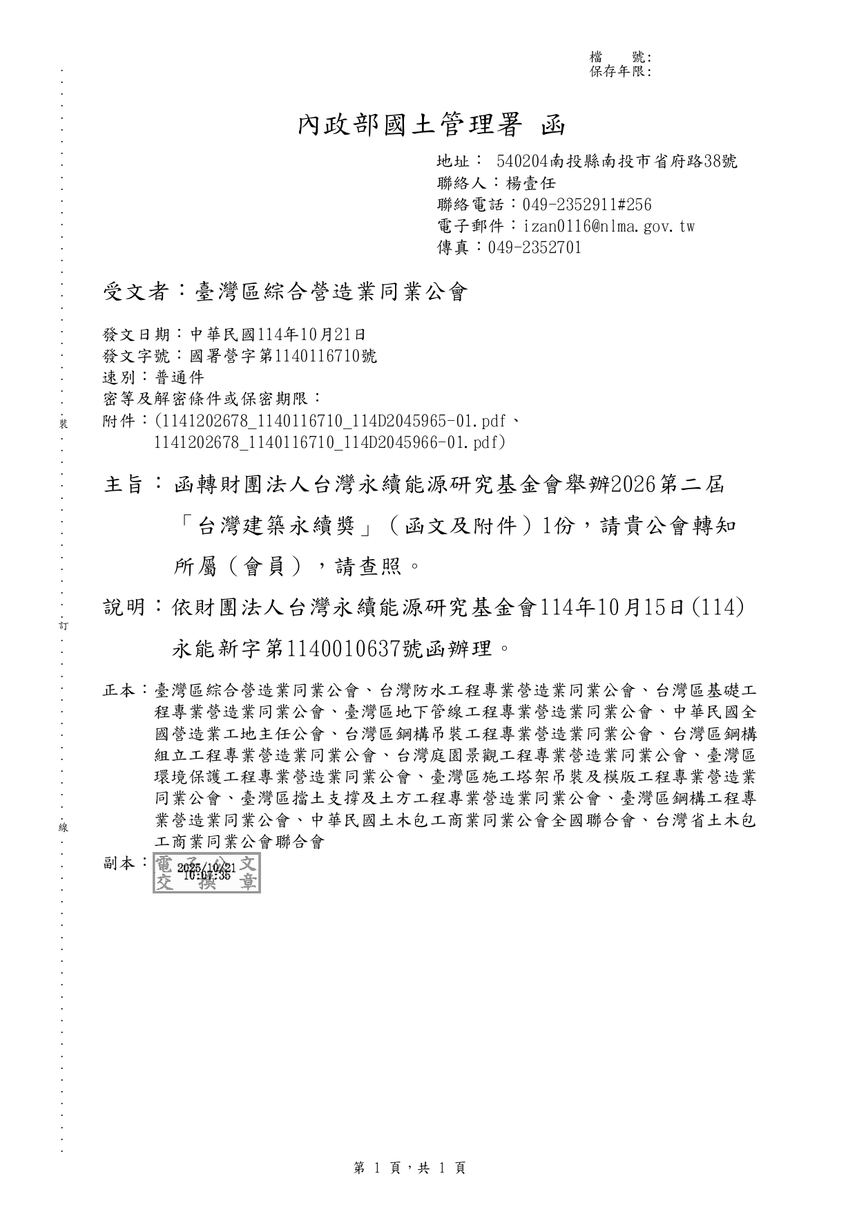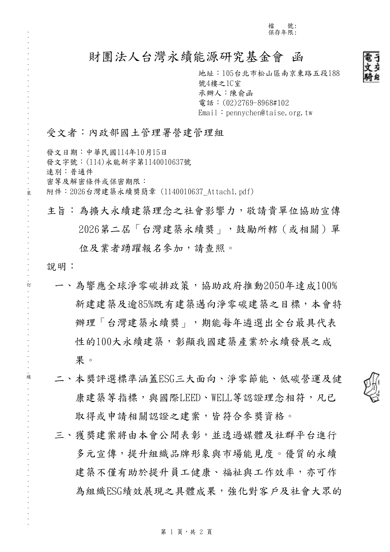 財團法人台灣永續能源研究基金會舉辦2026第二屆「台灣建築永續獎」(函文及附件)1份 2025-10-22 內政部國土管理署 114.10.21 國署營字第1140116710號函 函轉財團法人台灣永續能源研究基金會舉辦2026第二屆「台灣建築永續獎」(函文及附件)1份, 報名期限至114年12月5日止。相關資訊請參閱活動官網(https://twsaawards.org.tw/)
