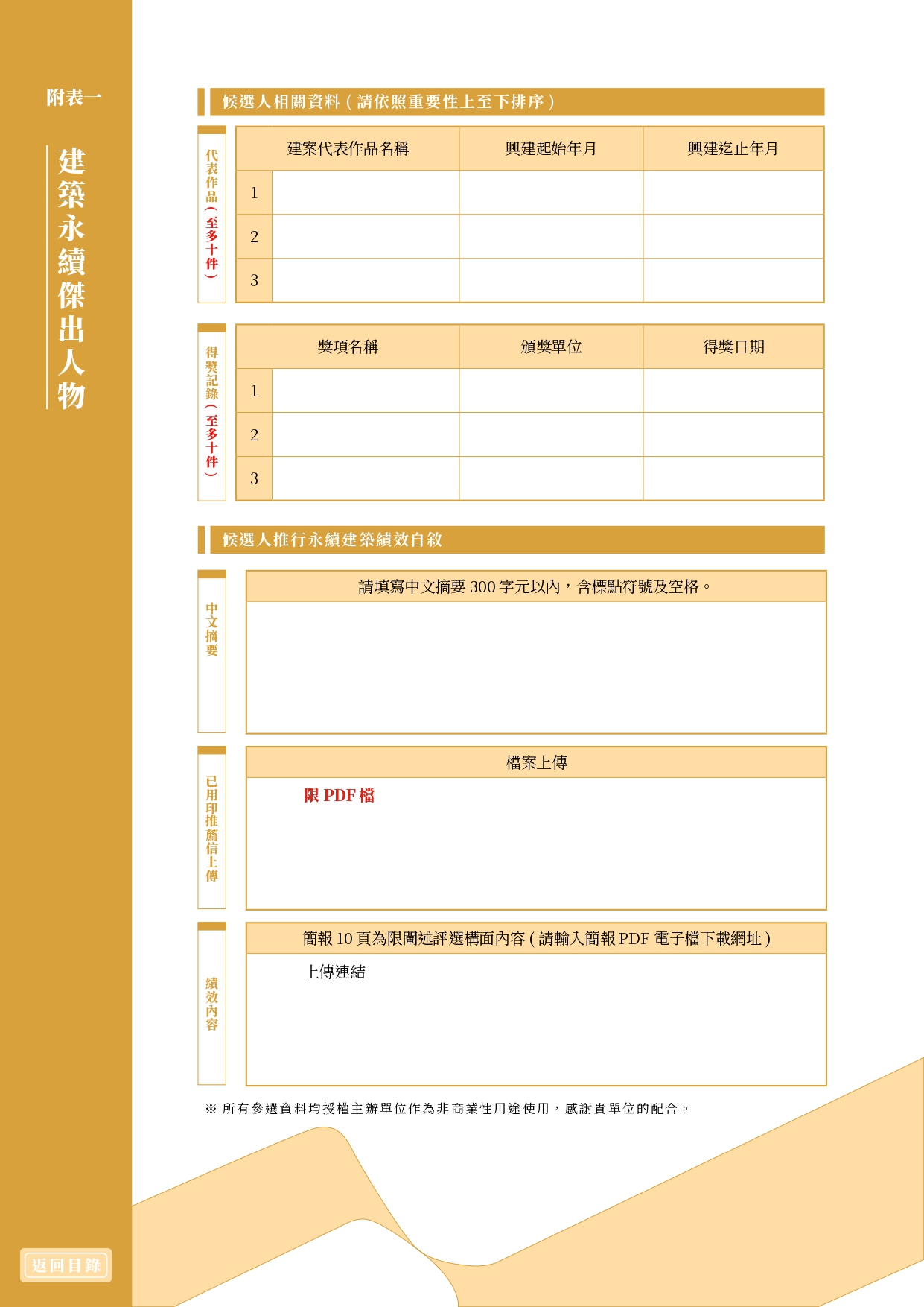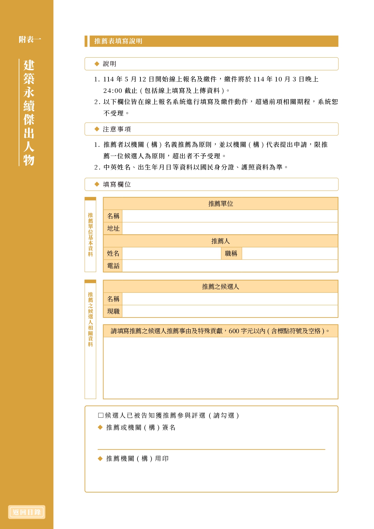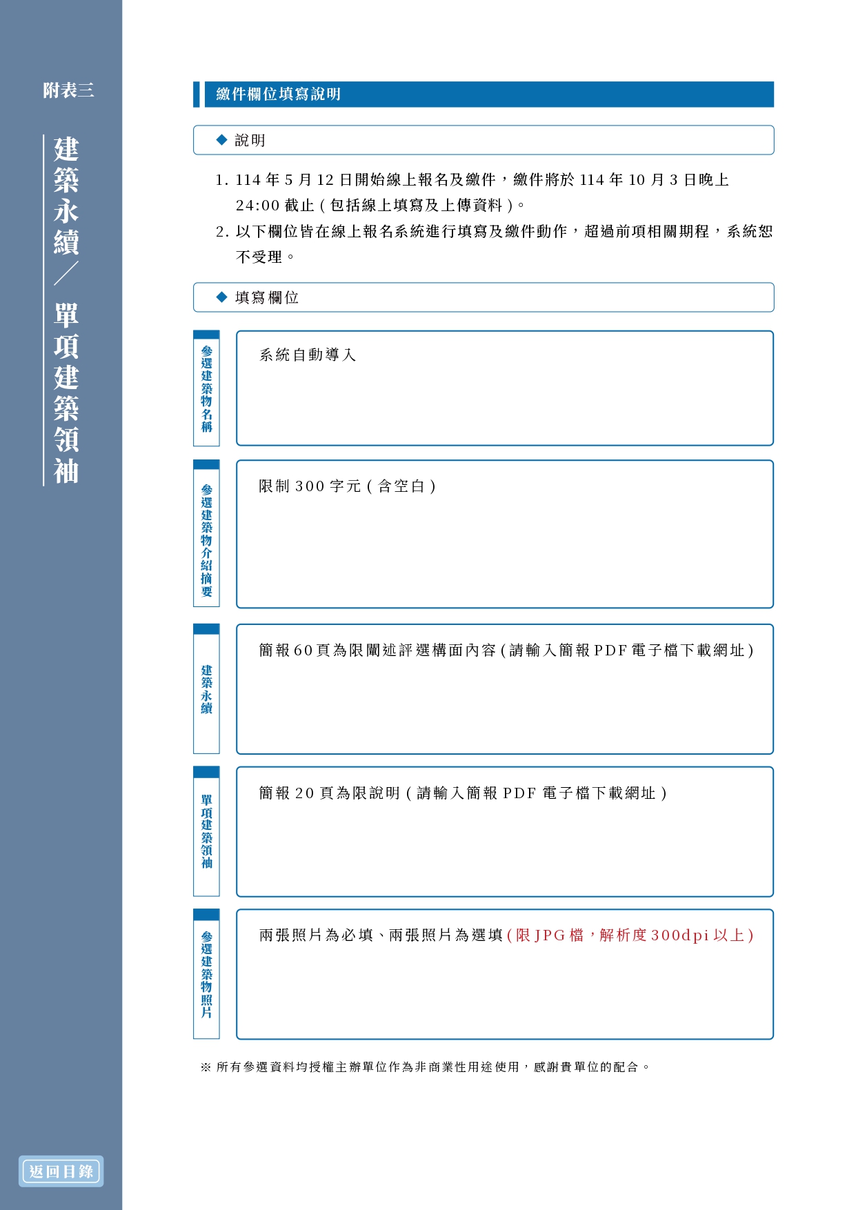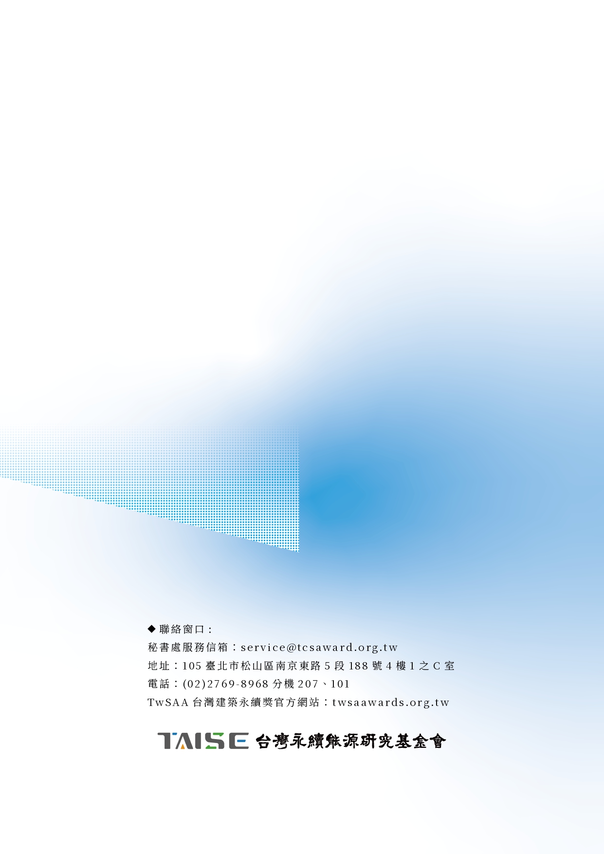 財團法人台灣永續能源研究基金會舉辦2026第二屆「台灣建築永續獎」(函文及附件)1份 2025-10-22 內政部國土管理署 114.10.21 國署營字第1140116710號函 函轉財團法人台灣永續能源研究基金會舉辦2026第二屆「台灣建築永續獎」(函文及附件)1份, 報名期限至114年12月5日止。相關資訊請參閱活動官網(https://twsaawards.org.tw/)