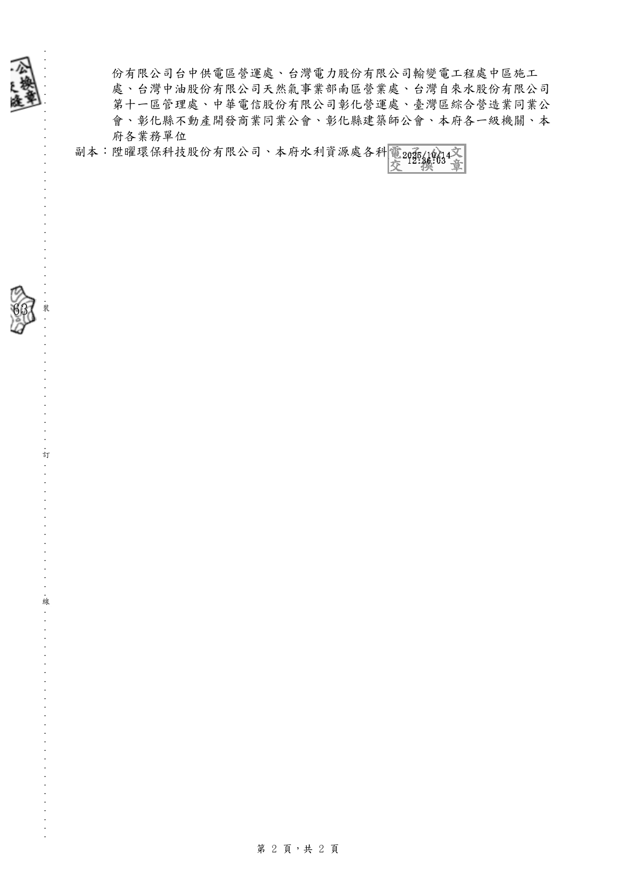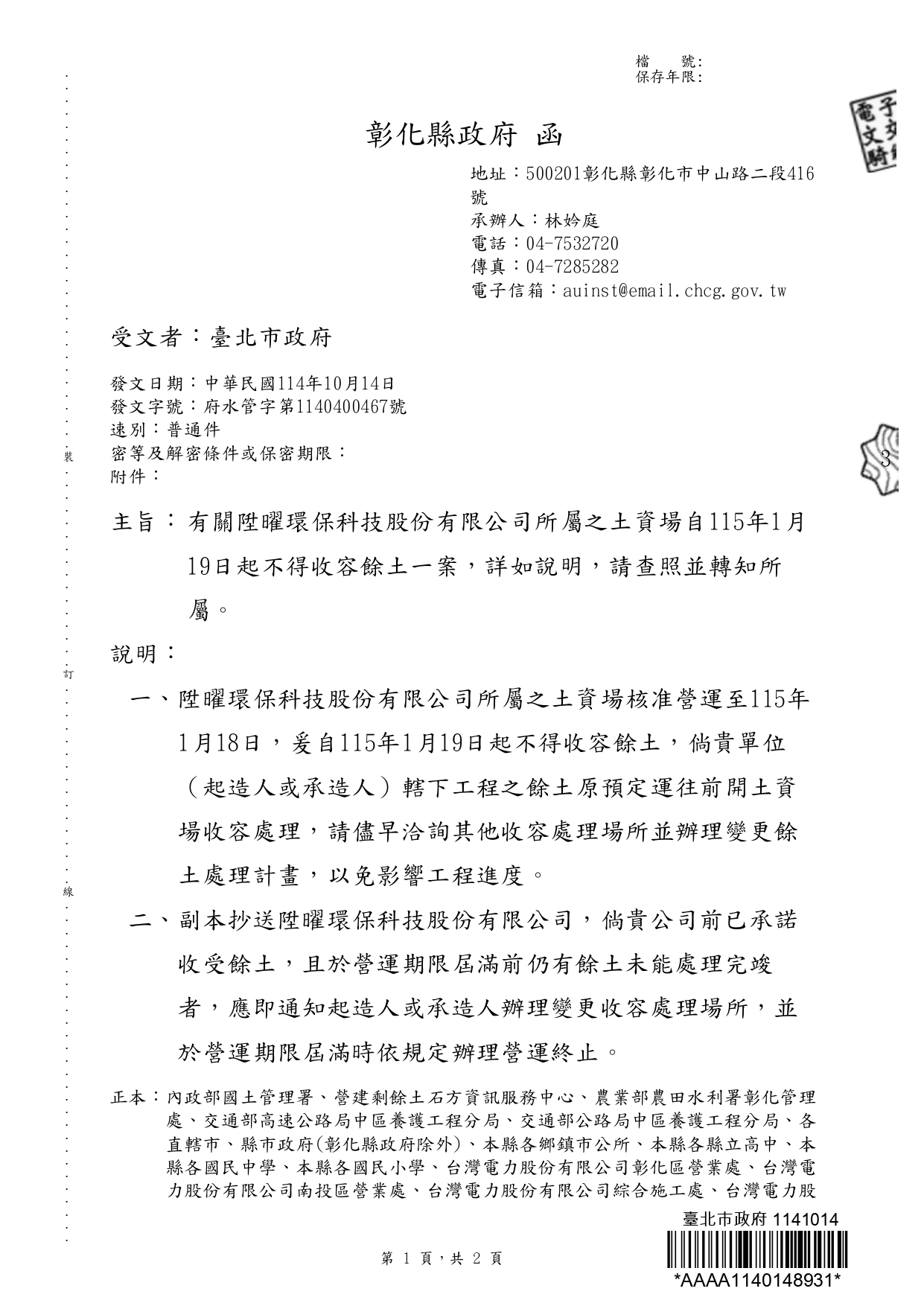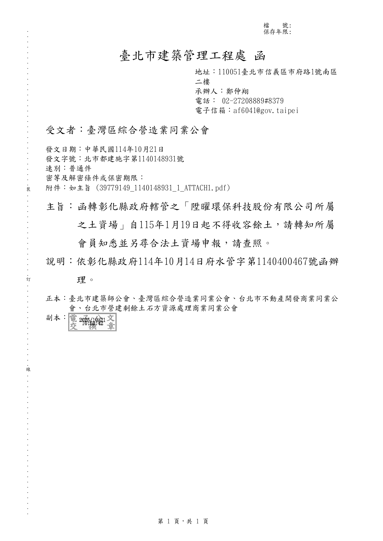 彰化縣政府轄管之「陞曜環保科技股份有限公司所屬之土資場」自115年1月19日起不得收容餘土 2025-10-22 檔案下載 臺北市建築管理工程處 114.10.21 北市都建施字第1140148931號函 函轉彰化縣政府轄管之「陞曜環保科技股份有限公司所屬之土資場」自115年1月19日起不得收容餘土,請轉轄區會員知悉並另尋合法土資場申報