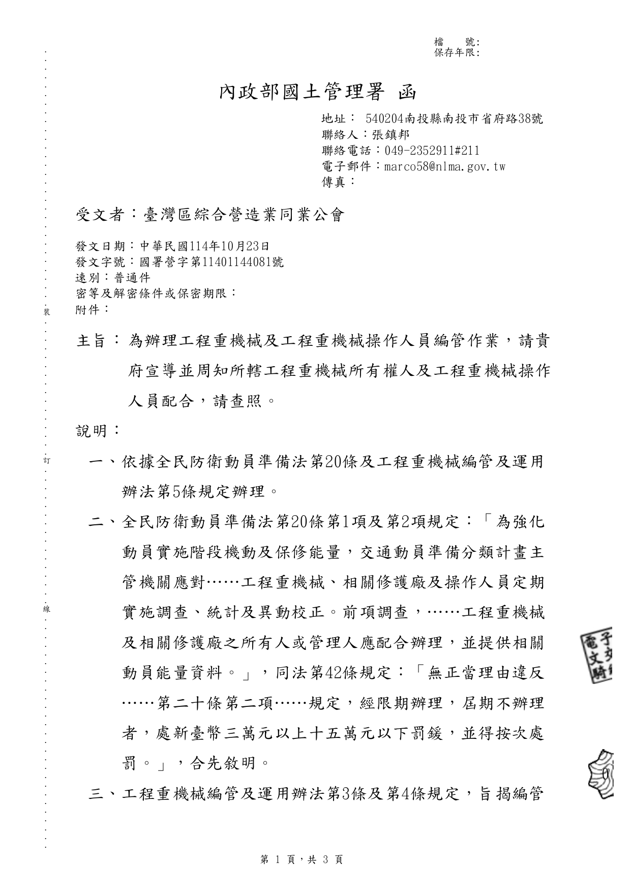 內政部國土管理署 114.10.23 國署營字第11401144081號函