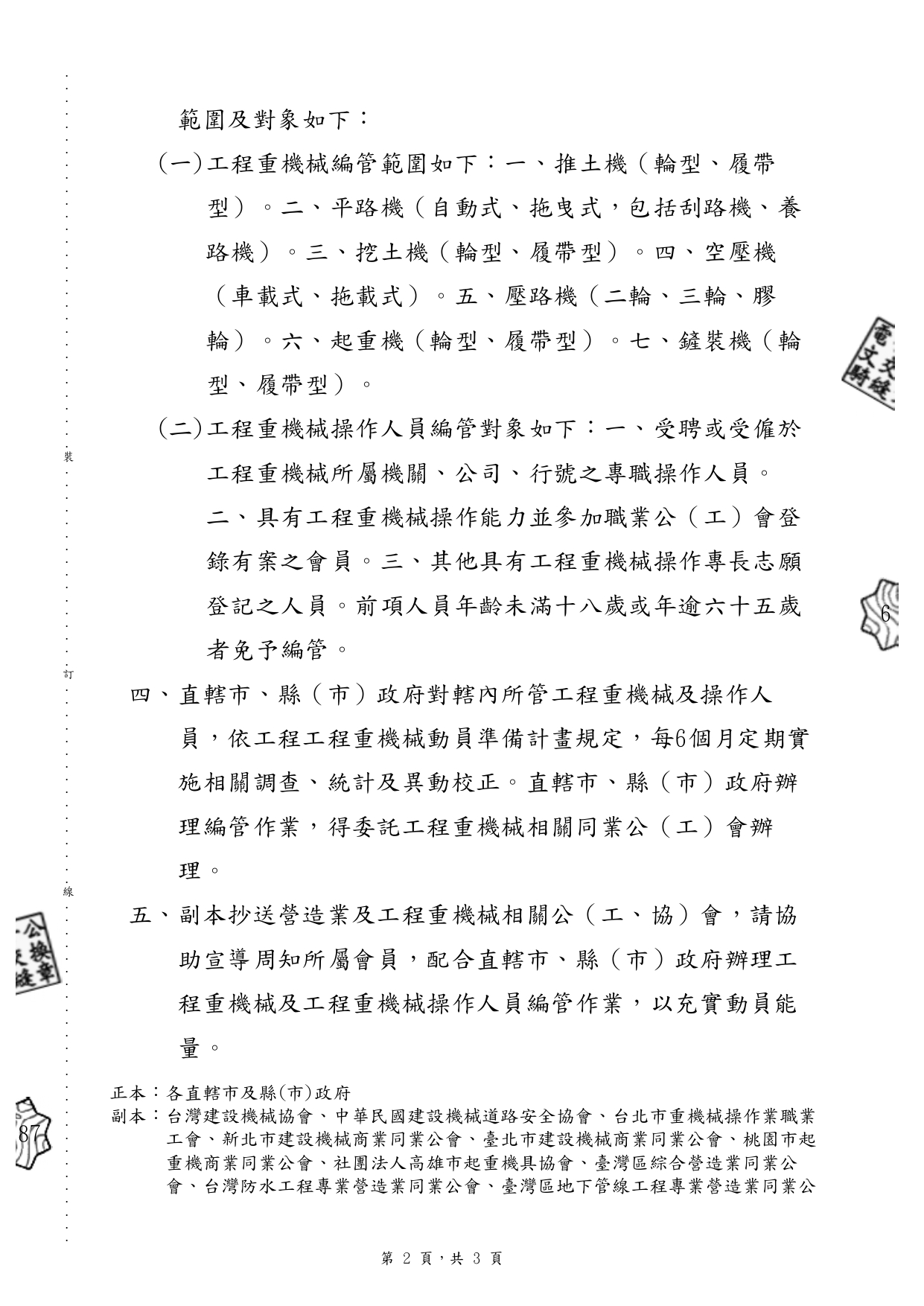 有關為辦理工程重機械及工程重機械操作人員編管作業,請宣導並周知所轄工程重機械所有權人及工程重機械操作人員配合