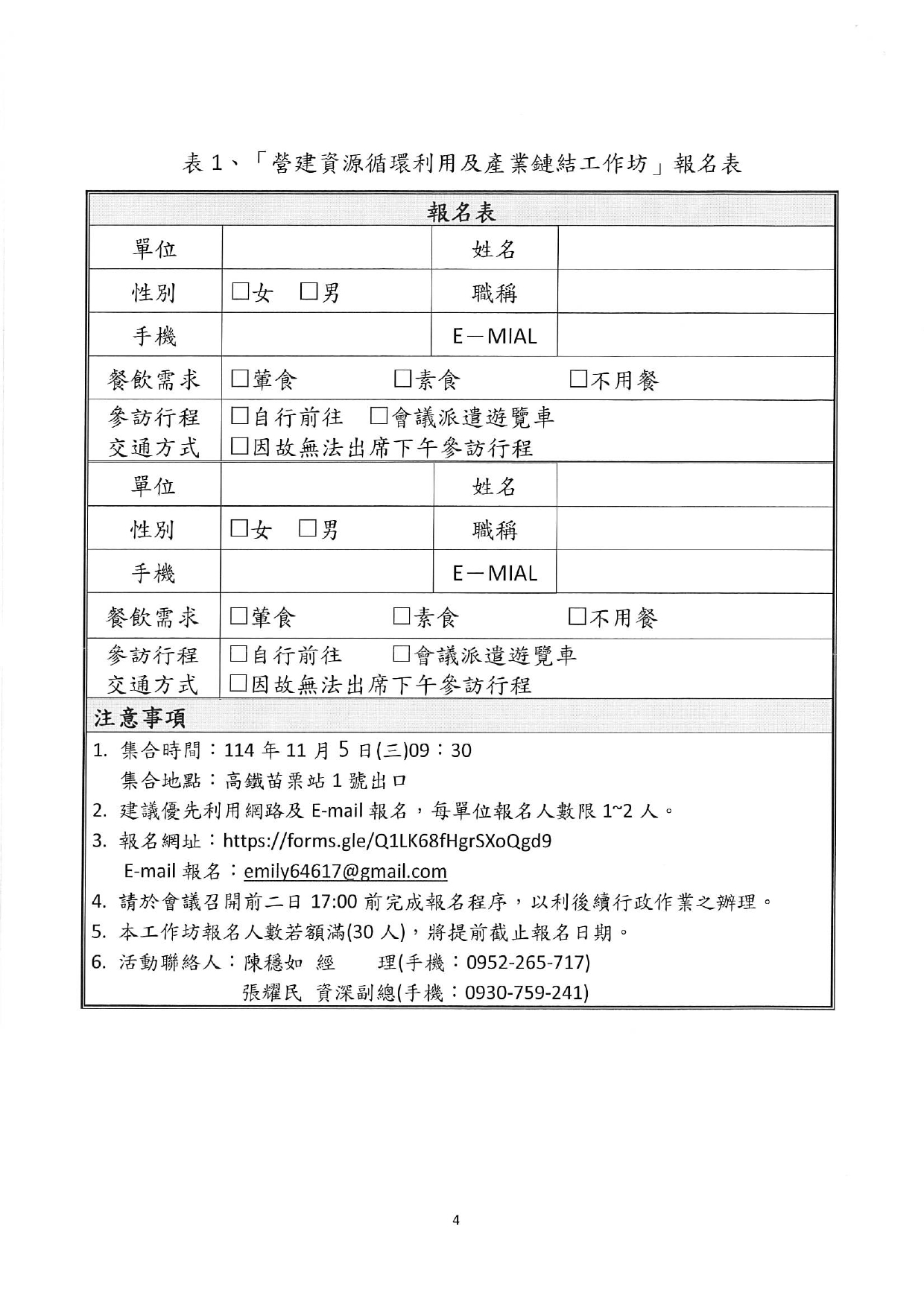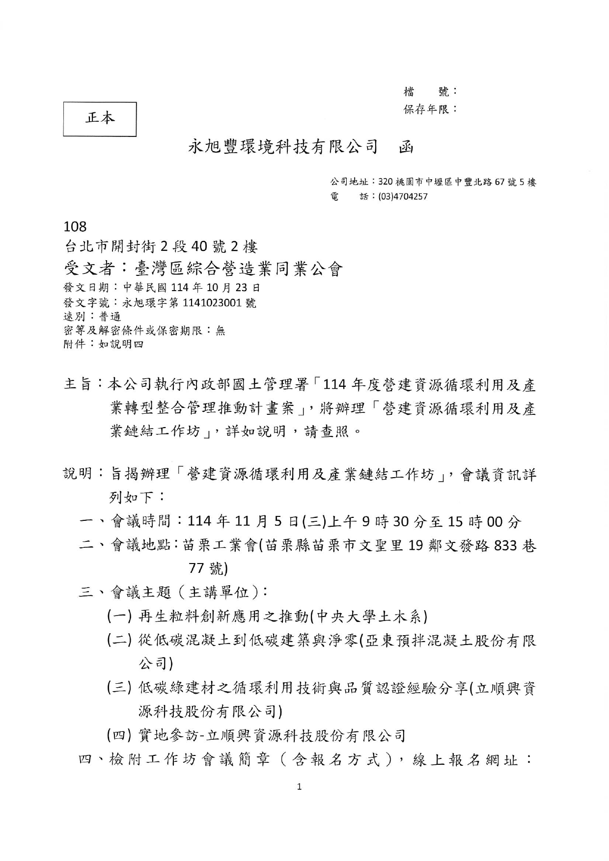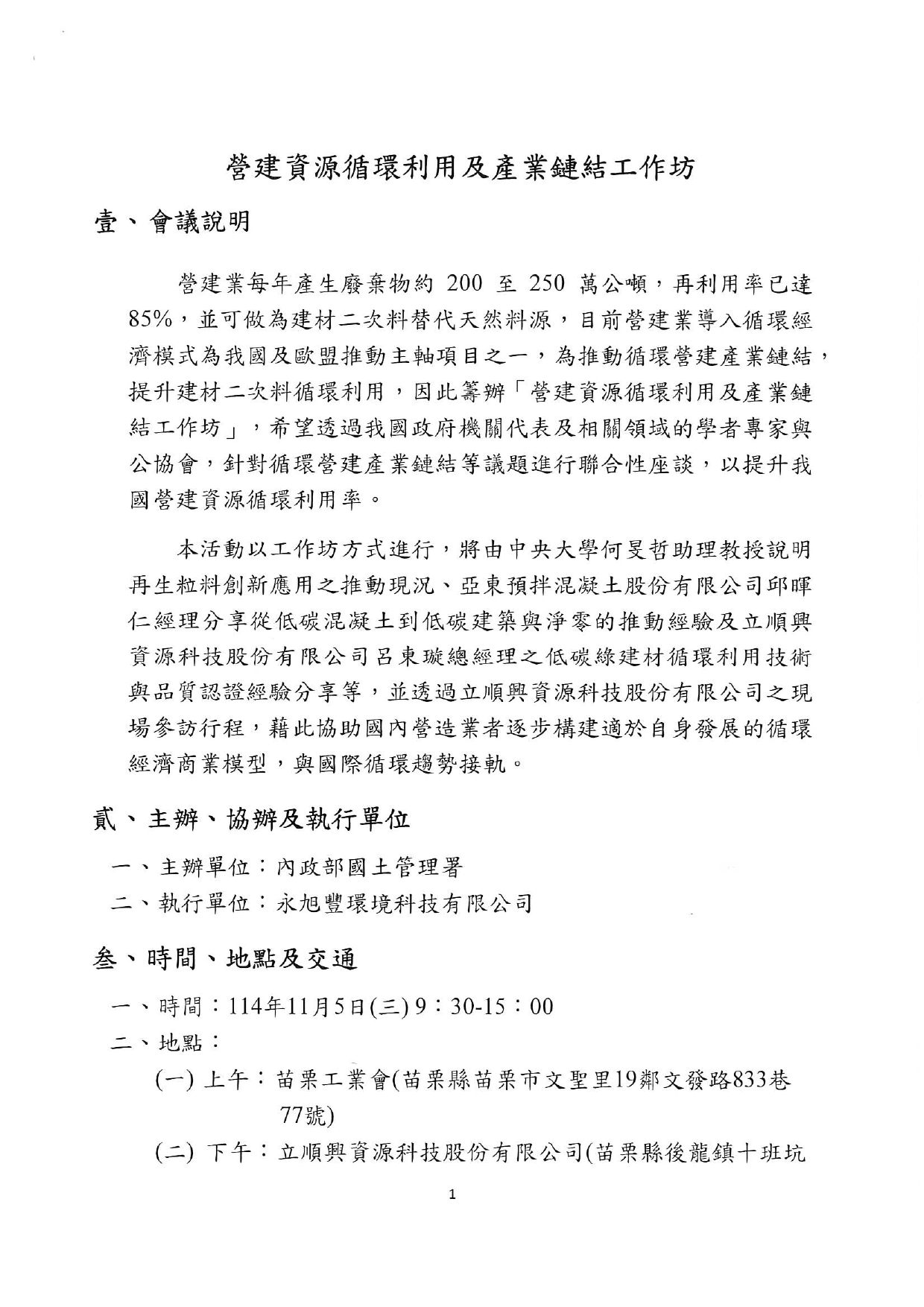 有關永旭豐環境科技有限公司執行內政部國土管理署 「114年度營建資源循環利用及產業轉型整合管理推動計畫案」,將辦理「營建資源循環利用及產業鏈結工作坊」,詳如說明。