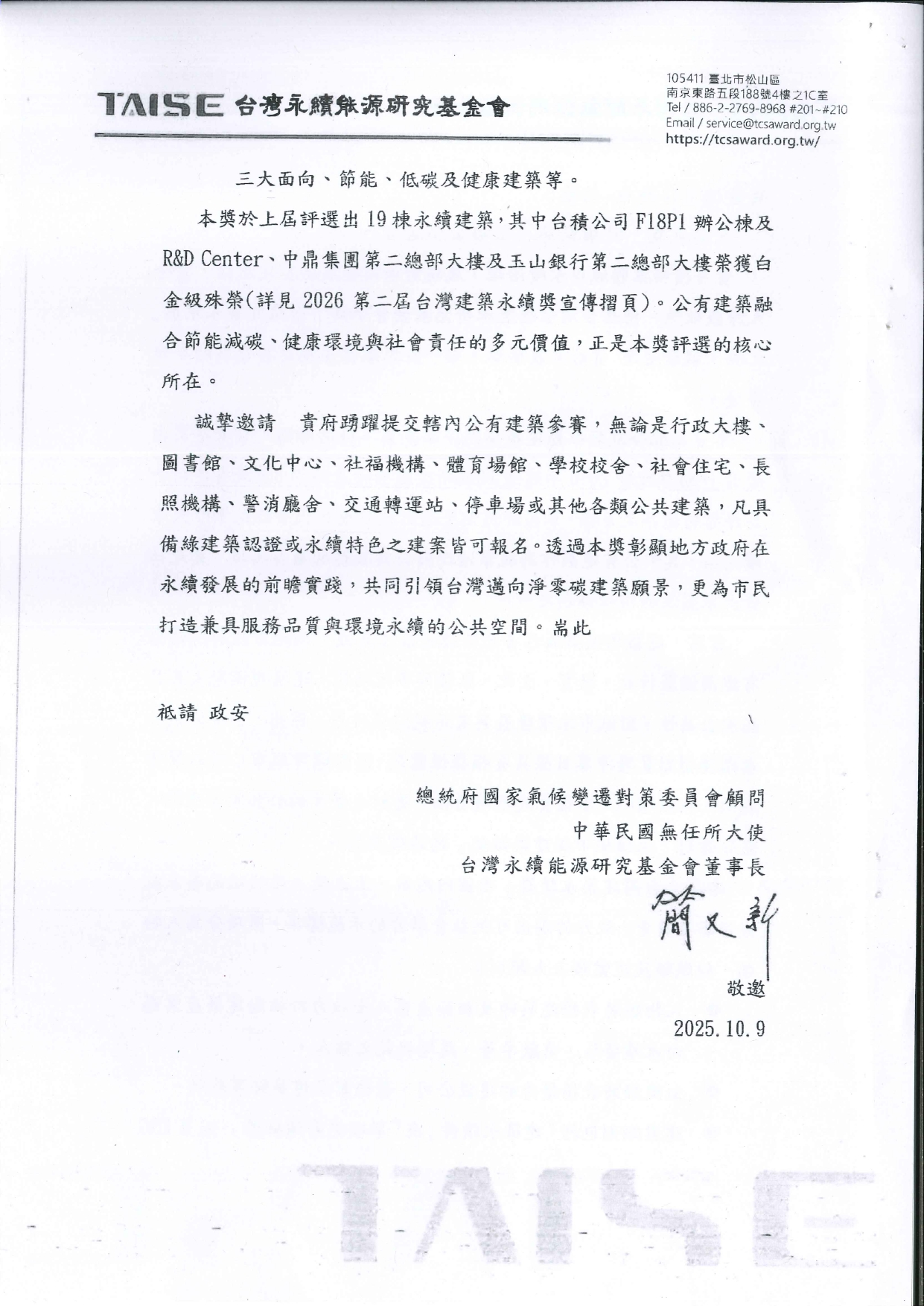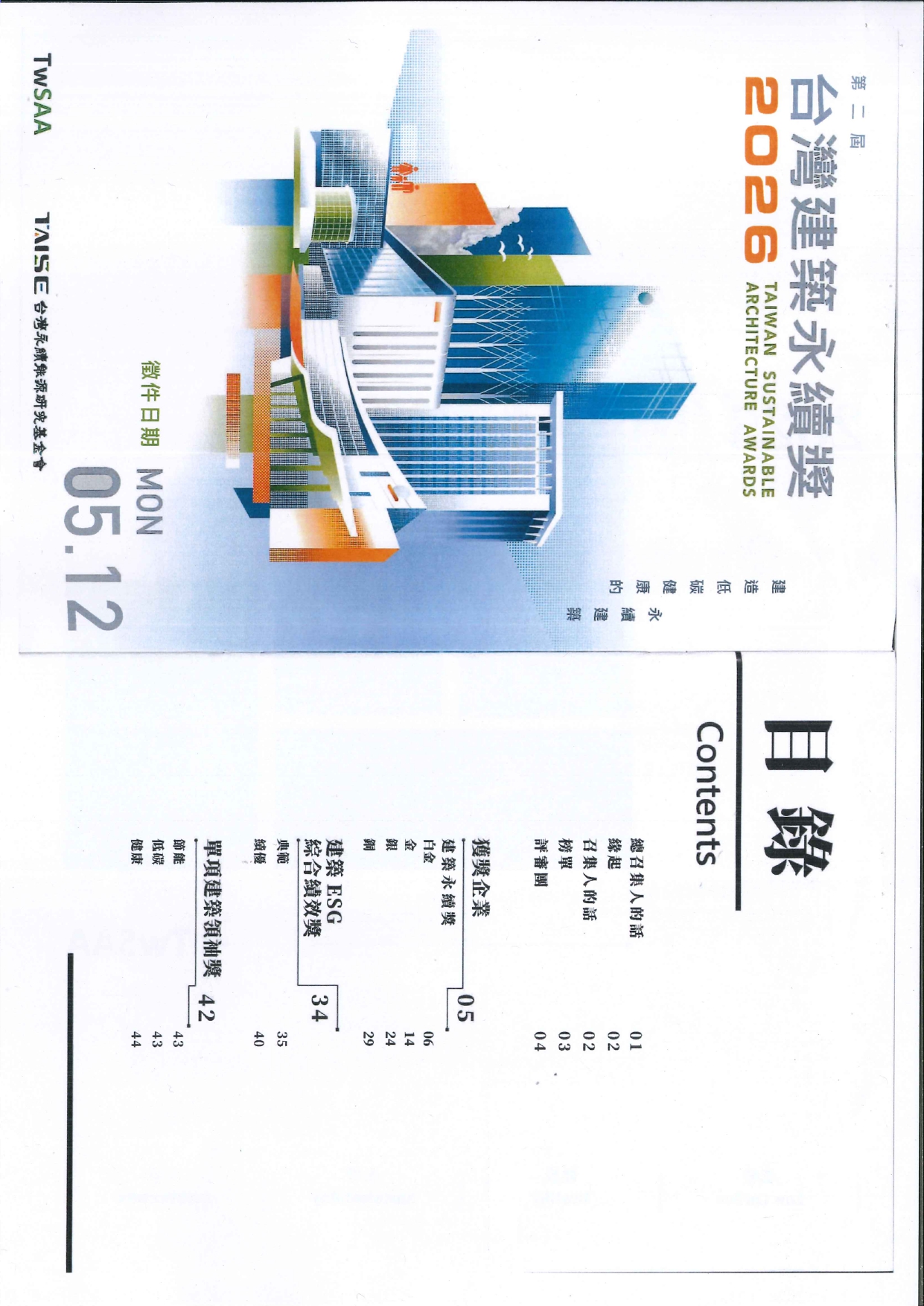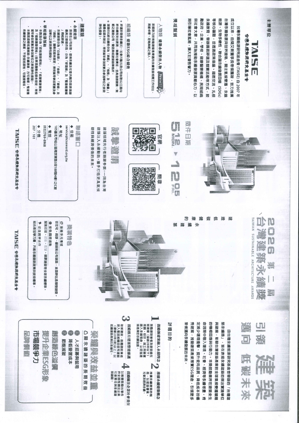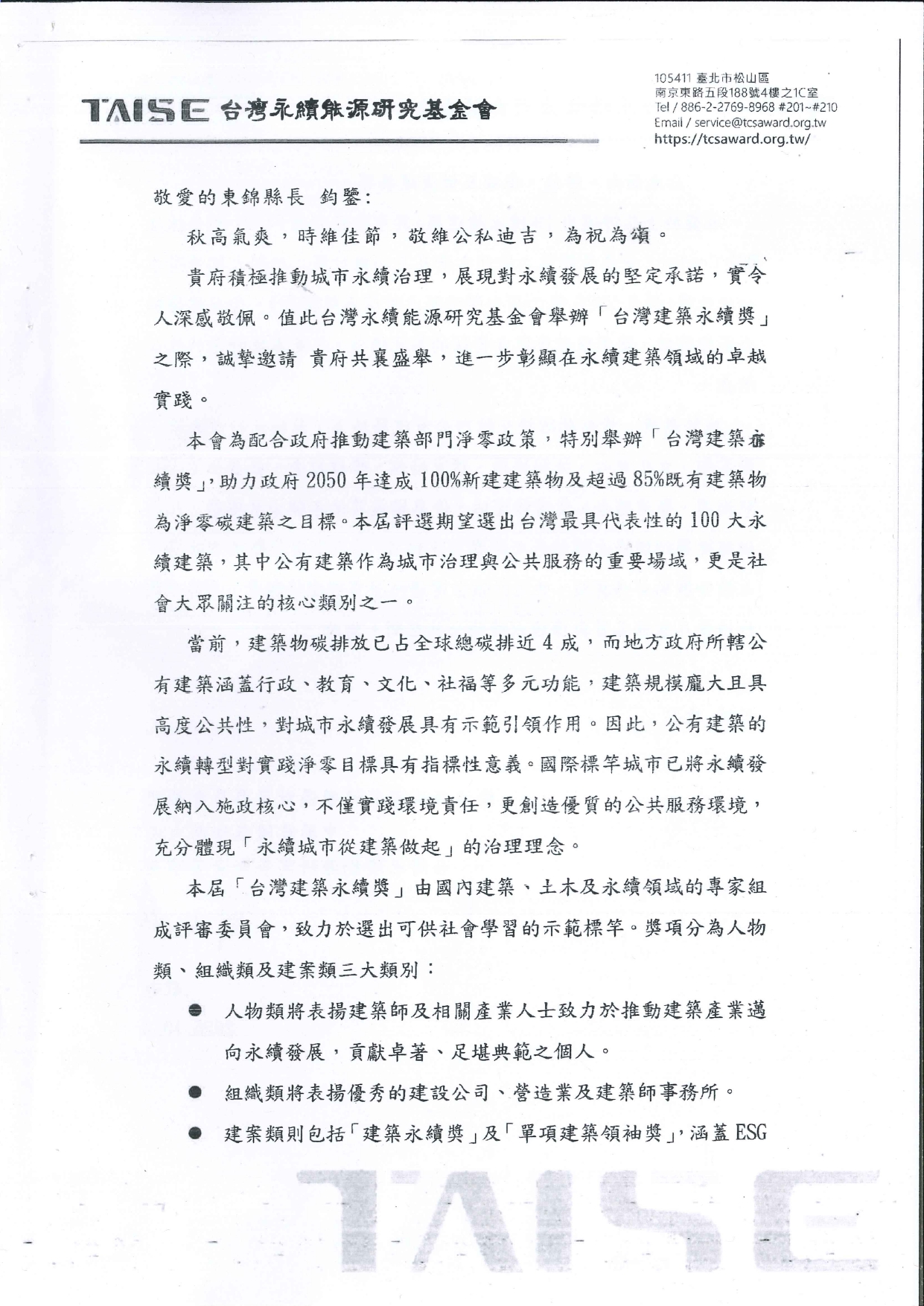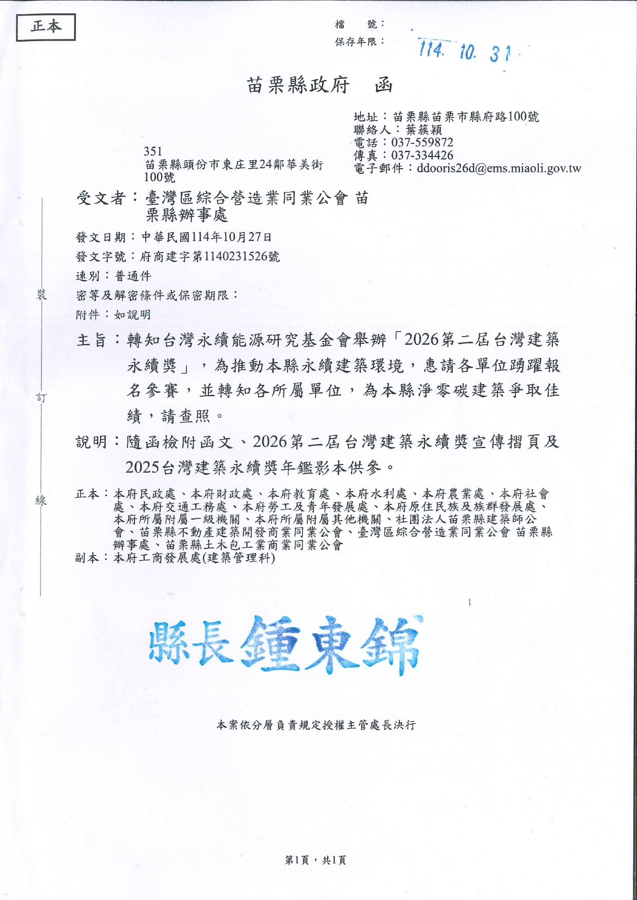 苗栗縣政府 轉知台灣永續能源研究基金會舉辦「2026第二屆台灣建築永續獎」 2025-10-31 苗栗縣政府 114.10.27 府商建字第1140231526號函, 轉知台灣永續能源研究基金會舉辦「2026第二屆台灣建築永續獎」,為推動本縣永續建築環境,惠請各會員踴躍報名參賽。 PS.因2025台灣建築永續獎年鑑影本檔案太大,無法完全上傳,請見諒。
