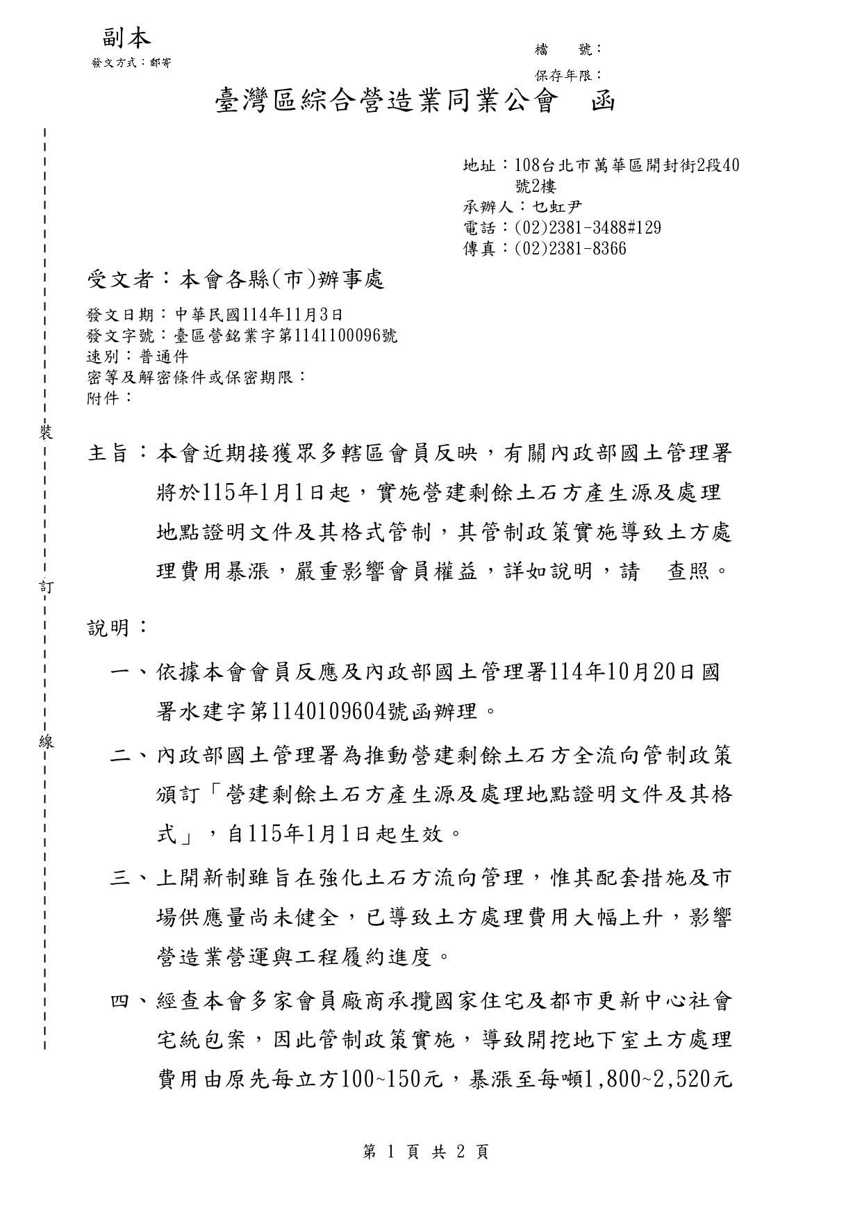 檢送本會11月3日 業1141100096號函文 , 有關本會近期接獲眾多轄區會員反映,有關內政部國土管理署將於115年1月1日起,實施營建剩餘土石方產生源及處理地點證明文件及其格式管制,其管制政策實施導致土方處理費用暴漲,嚴重影響會員權益,詳如說明......