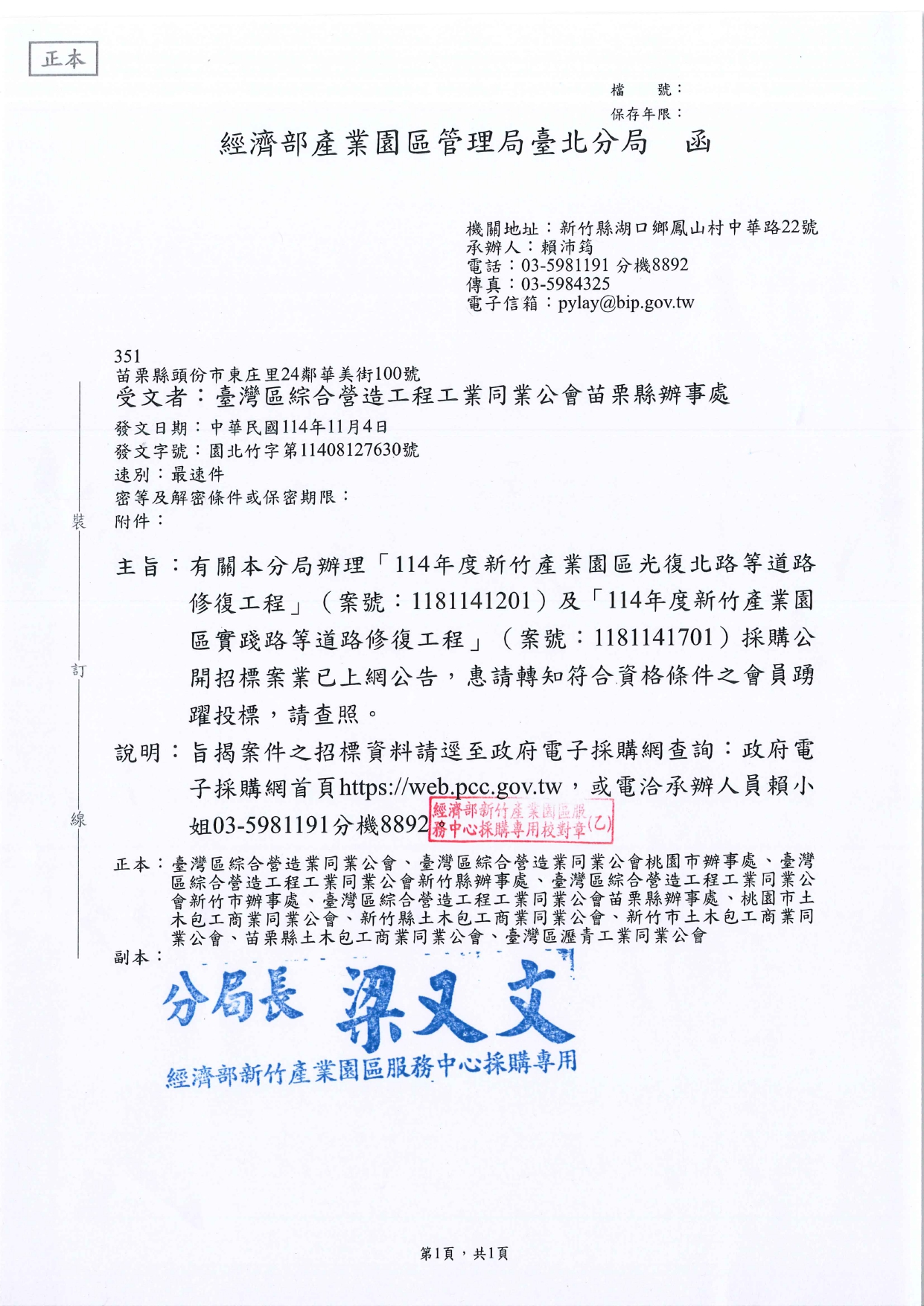 經濟部產業園區管理局臺北分局有關「114年度新竹產業園區光復北路等道路修復工程」 2025-11-05 檔案下載 經濟部產業園區管理局臺北分局 114.11.4 園北竹字第11408127630號 有關「114年度新竹產業園區光復北路等道路修復工程」, 採購公告網址https://web.pcc.gov.tw/prkms/tender/common/basic/readTenderBasic?firstSearch=true&searchType=basic&isBinding=N&isLogIn=N&orgName=&orgId=&tenderName=&tenderId=1181141201&tenderType=TENDER_DECLARATION&tenderWay=TENDER_WAY_ALL_DECLARATION&dateType=isDate&tenderStartDate=&tenderEndDate=&radProctrgCate=&policyAdvocacy=