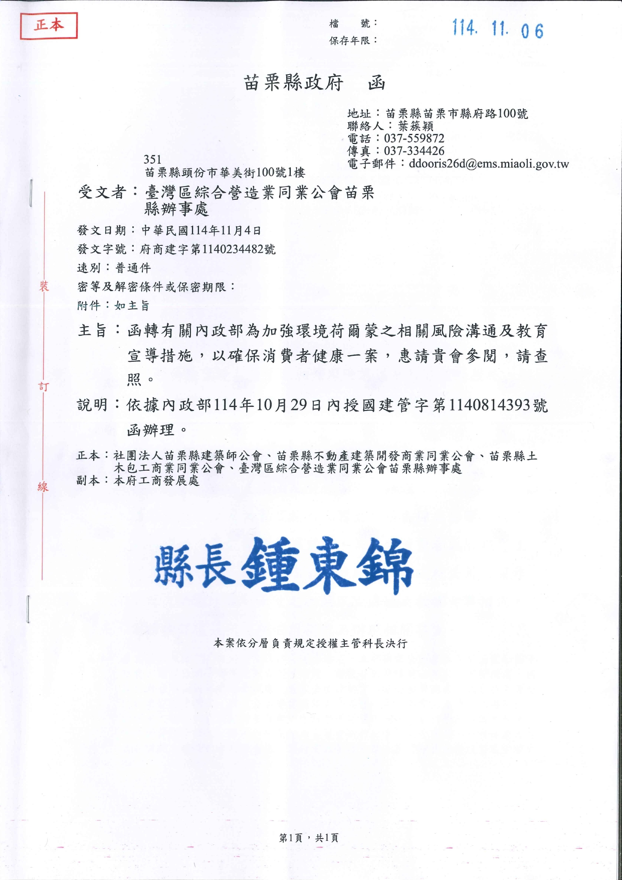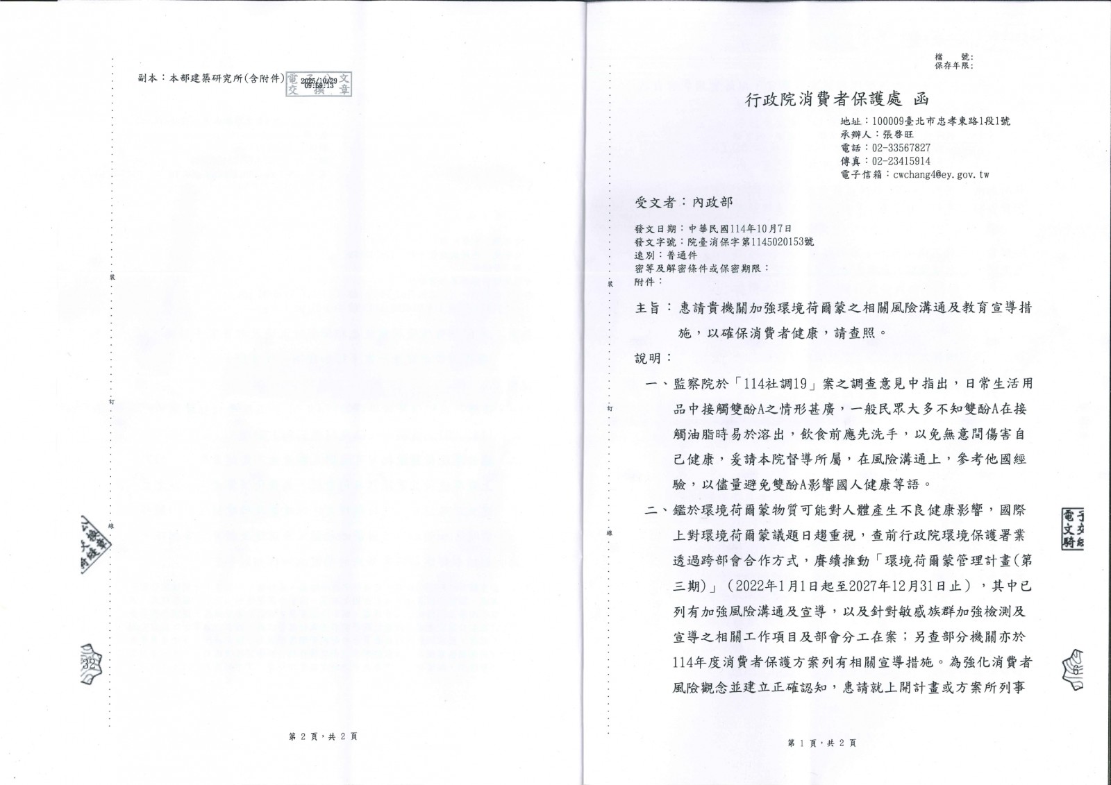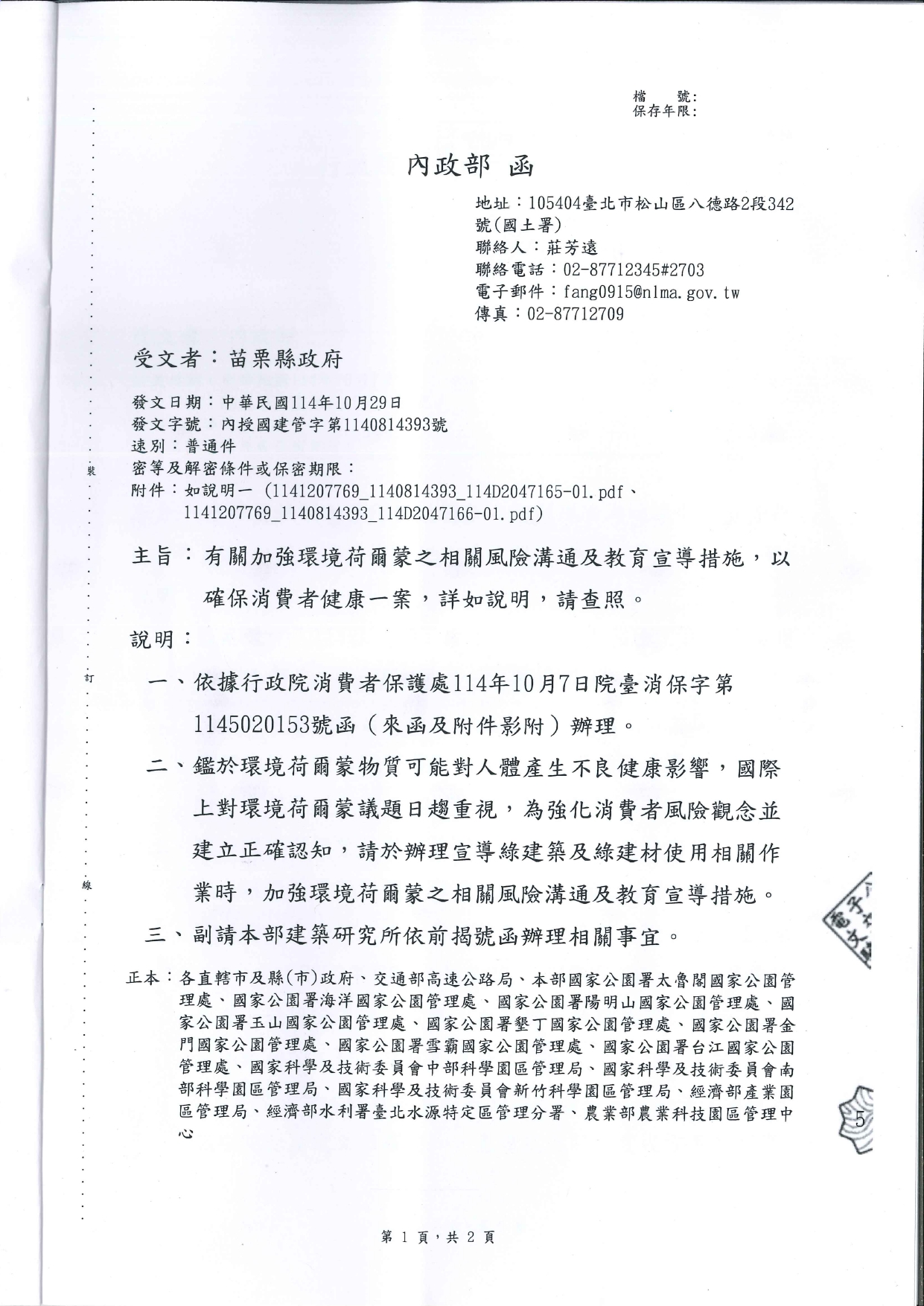 苗栗縣政府 有關「內政部為加強環境荷爾蒙之相關風險溝通及教育宣導措施,以確保消費者健康一案」 2025-11-06 苗栗縣政府 114.11.4 府商建字第1140234482號 有關「內政部為加強環境荷爾蒙之相關風險溝通及教育宣導措施,以確保消費者健康一案」