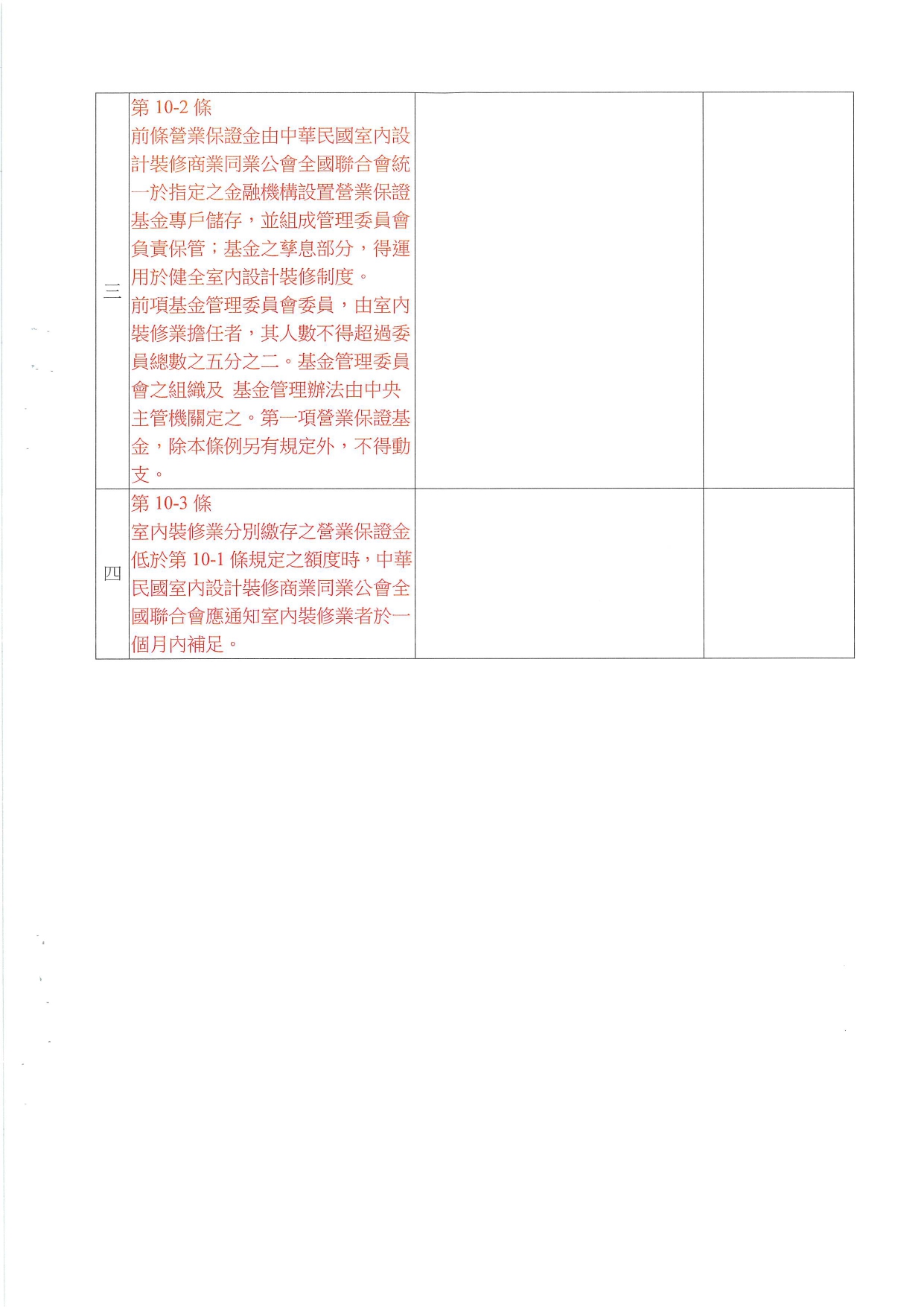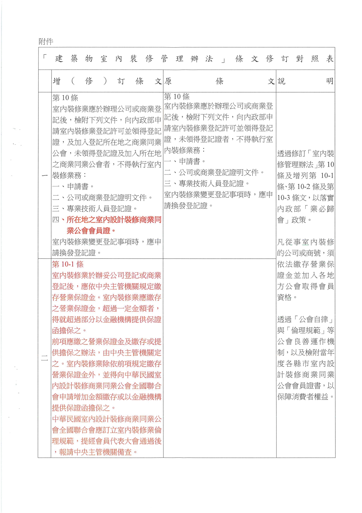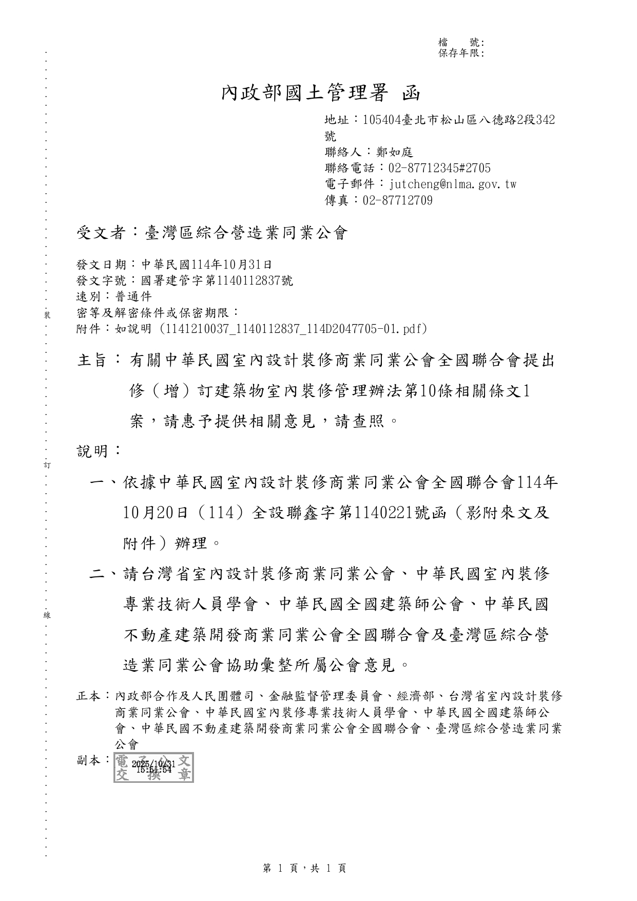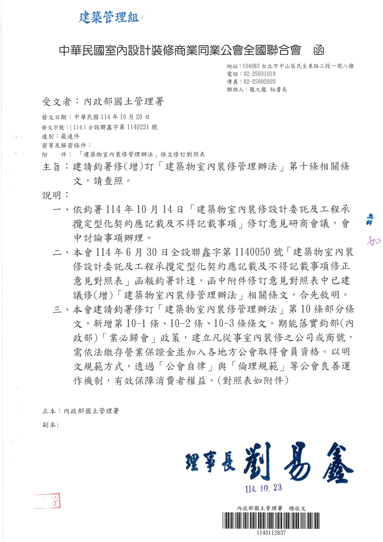 國土署 有關中華民國室內設計裝修商業同業公會全國聯合會提出修(增)訂建築物室內裝修管理辦法第10條相關條文1案,請惠予提供相關意見(建請各辦事處於11月14日(五)前回覆) 2025-11-07 檔案下載 內政部國土管理署 114.10.31 國署建管字第1140112837號函 有關中華民國室內設計裝修商業同業公會全國聯合會提出修(增)訂建築物室內裝修管理辦法第10條相關條文1案,請惠予提供相關意見(建請各辦事處於11月14日(五)前回覆)