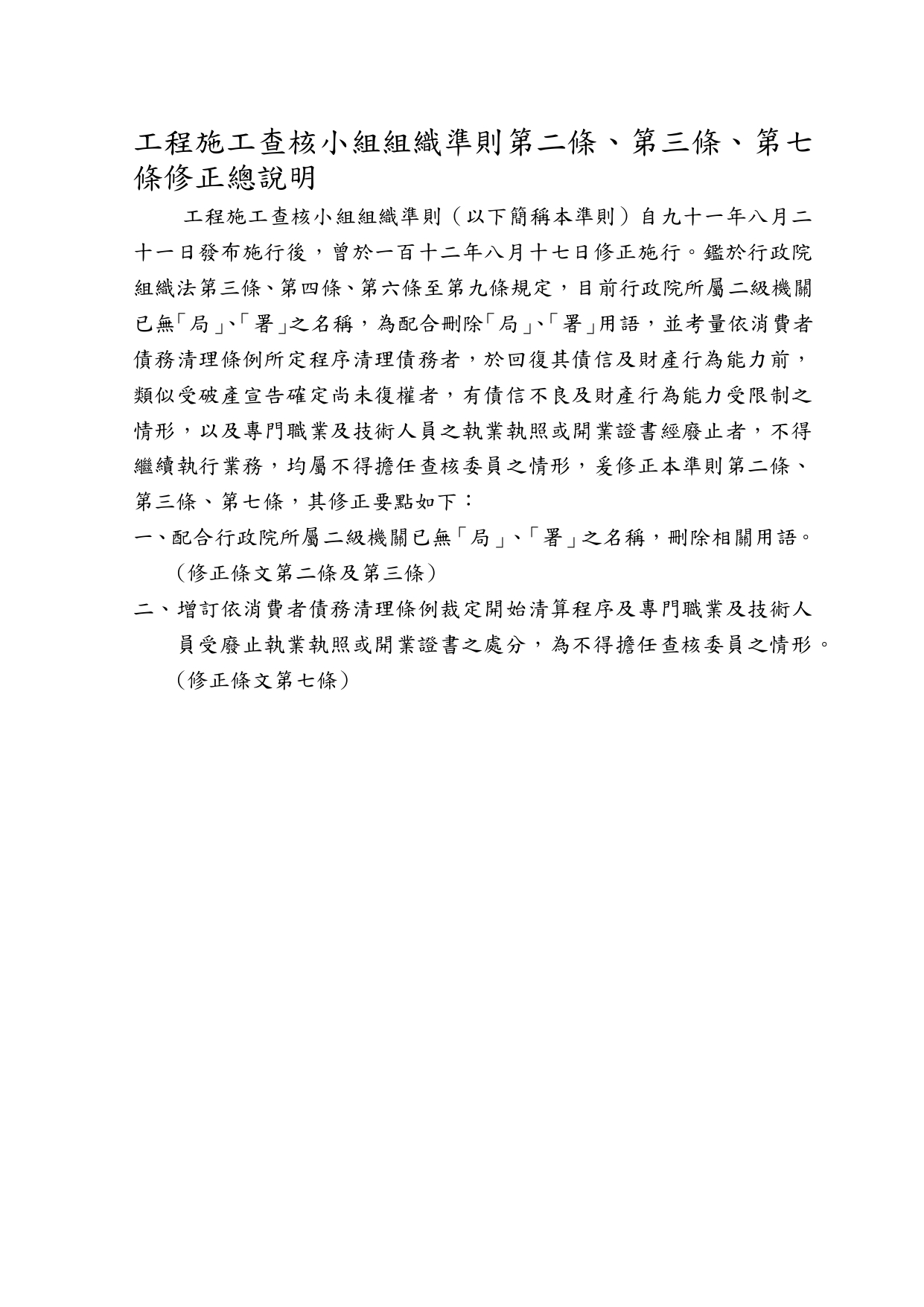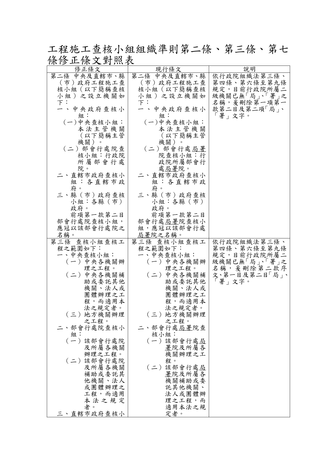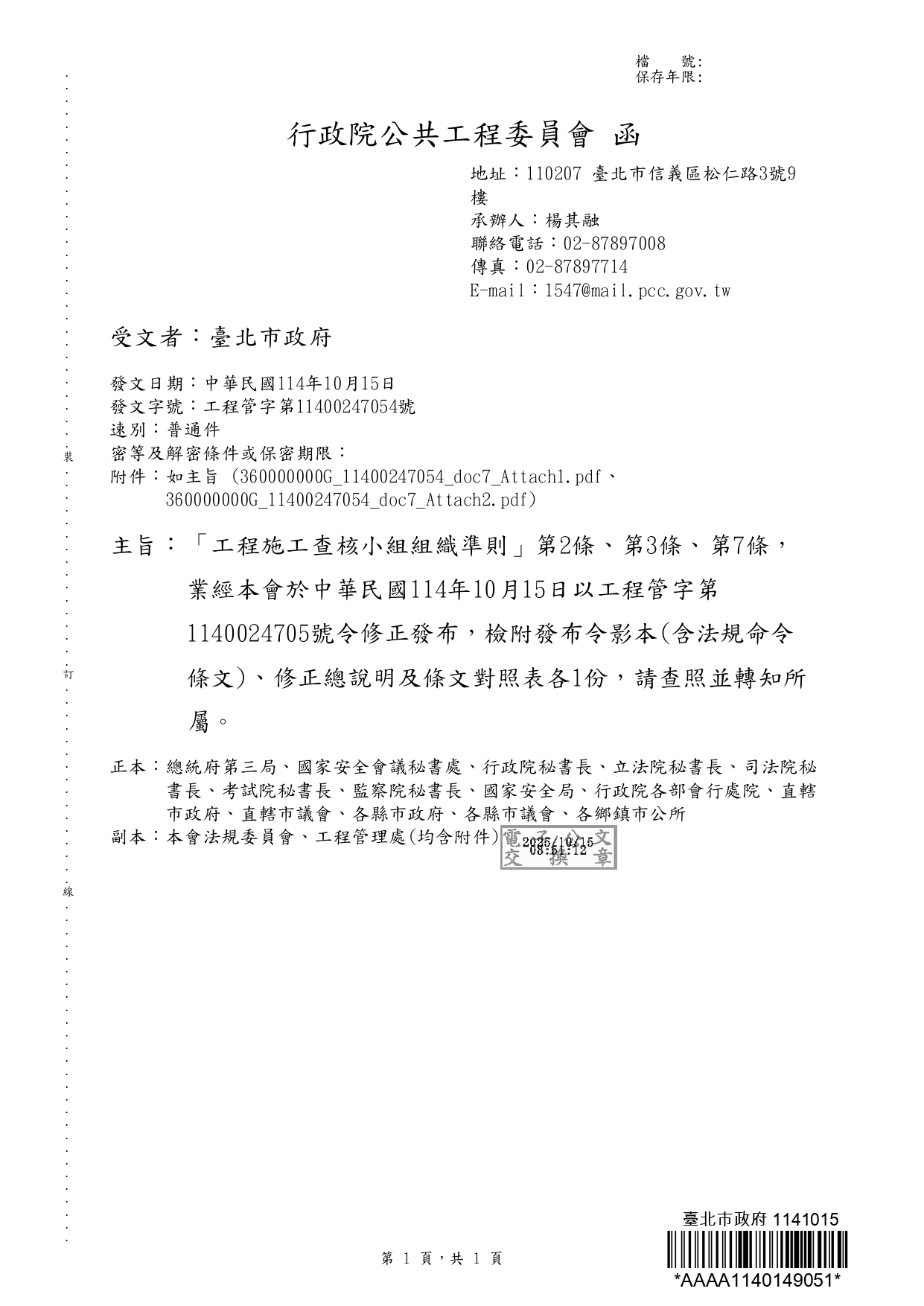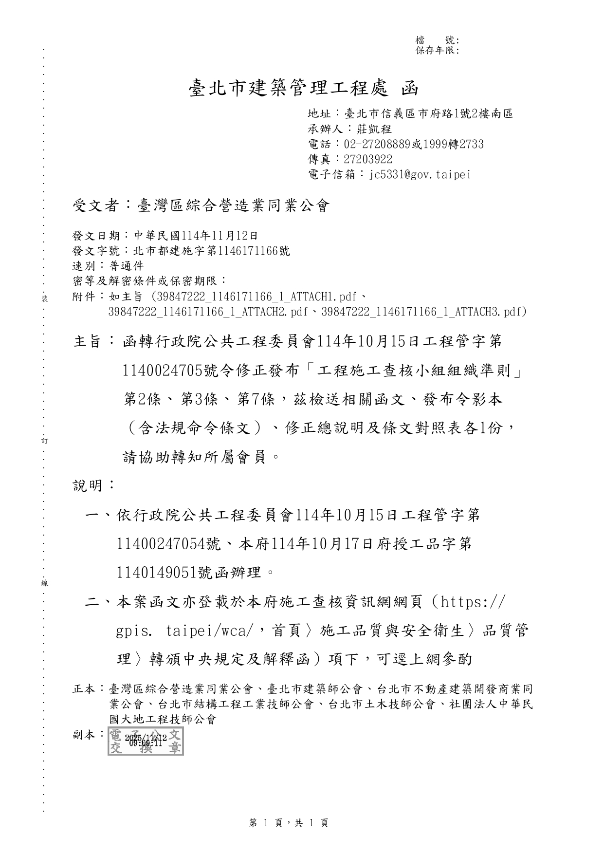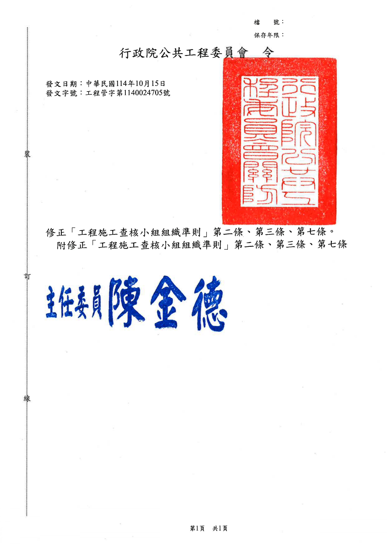臺北市建築管理工程處 函轉行政院公共工程委員會114年10月15日工程管字第1140024705號令修正發布「工程施工查核小組組織準則」第2條、第3條、第7條 2025-11-13 檔案下載 臺北市建築管理工程處 114.11.12 北市都建施字第1146171166號函 函轉行政院公共工程委員會114年10月15日工程管字第1140024705號令修正發布「工程施工查核小組組織準則」第2條、第3條、第7條,茲檢送相關函文、發布令影本(含法規命令條文)、修正總說明及條文對照表各1份