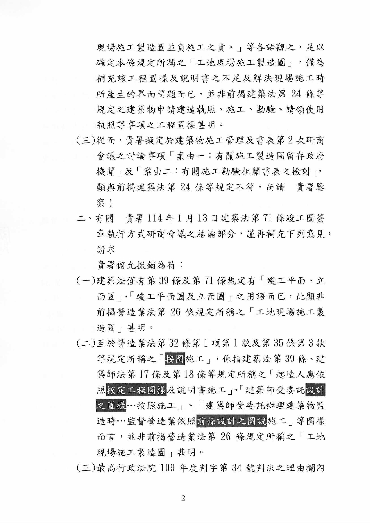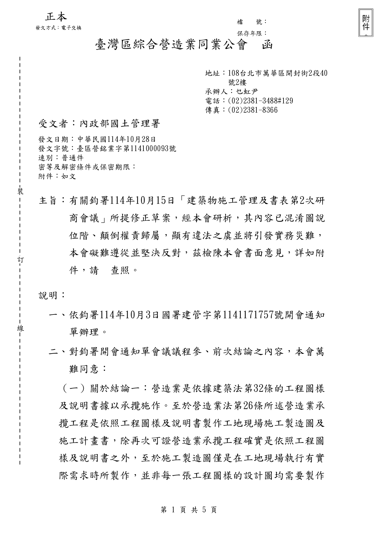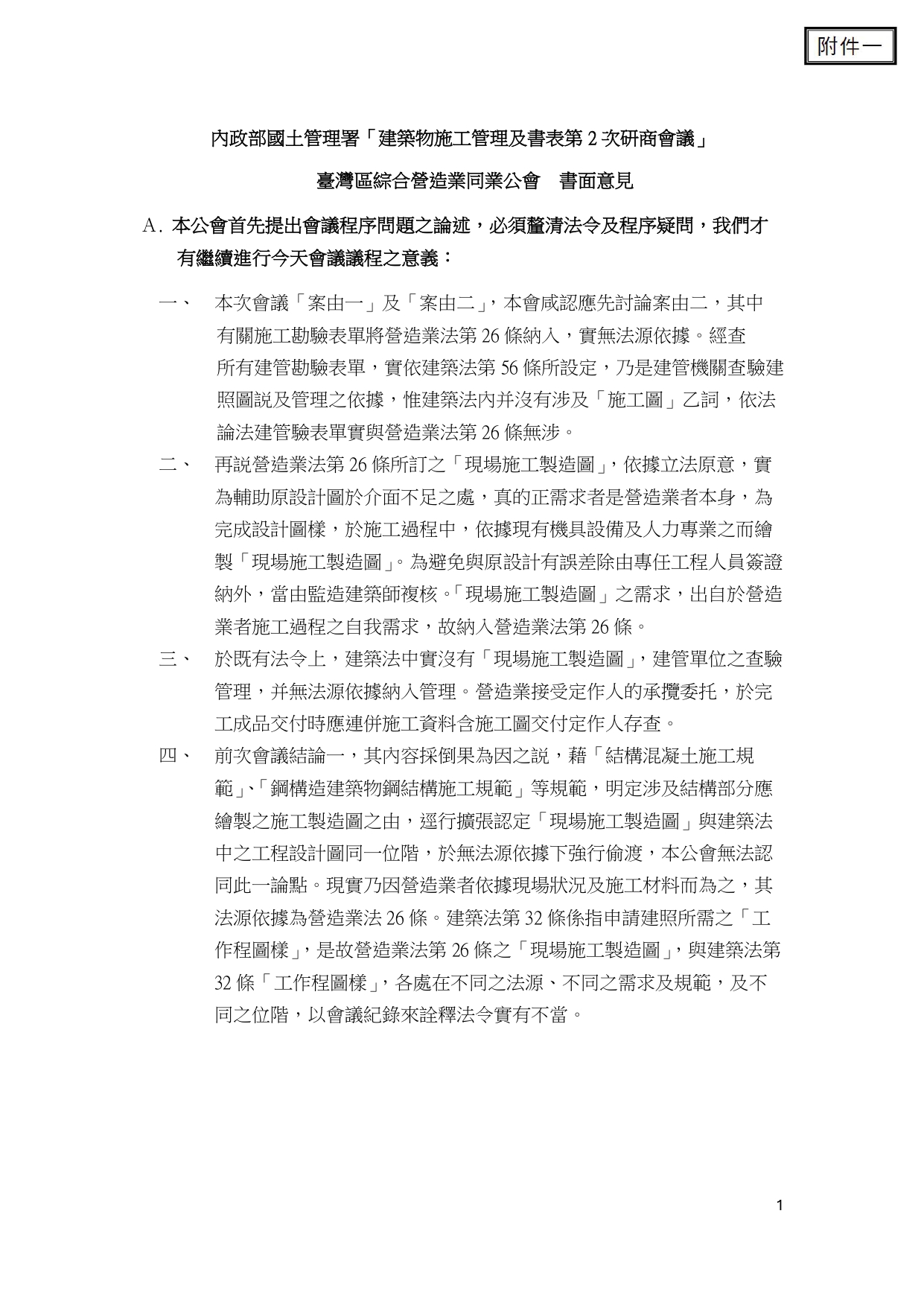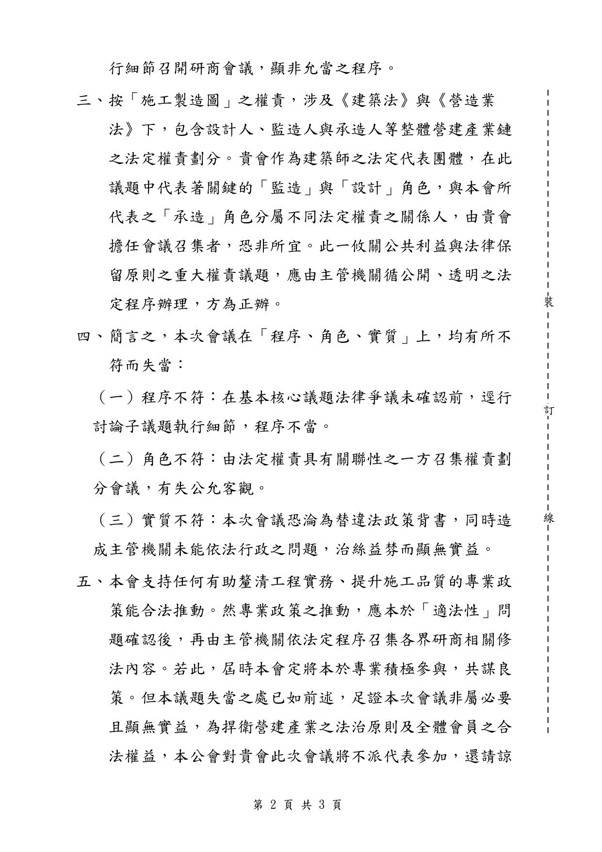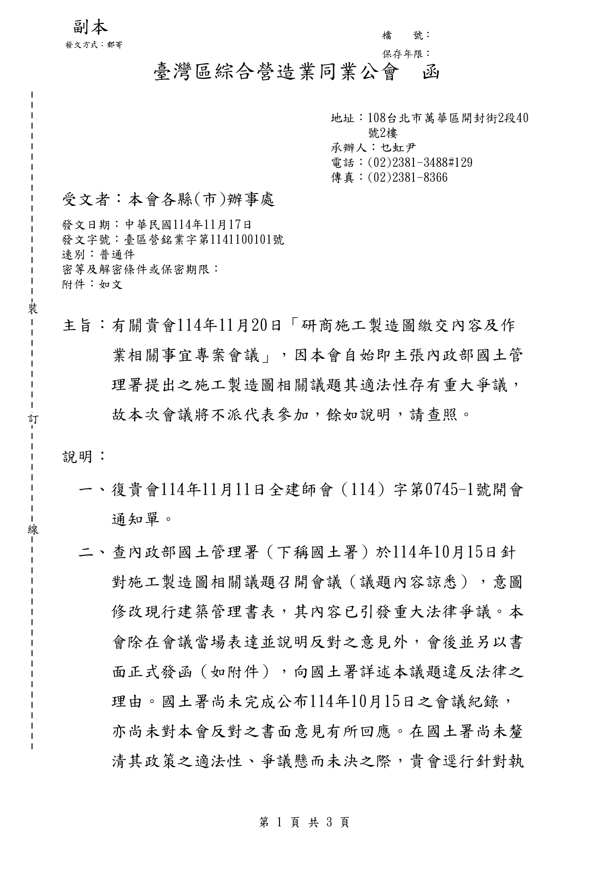 有關國土署施工製造圖相關議題其適法性存有重大爭議,提出114年10月15日「建築物施工管理及書表第2次研 商會議」所提修正草案,故本次會議將不派代表參加。 2025-11-18 檔案下載 本會11月17日 業1141100101號函文 , 有關中華民國全國建築師公會114年11月20日「研商施工製造圖繳交內容及作業相關事宜專案會議」,因本會自始即主張內政部國土管理署提出之施工製造圖相關議題其適法性存有重大爭議,故本次會議將不派代表參加,餘如說明