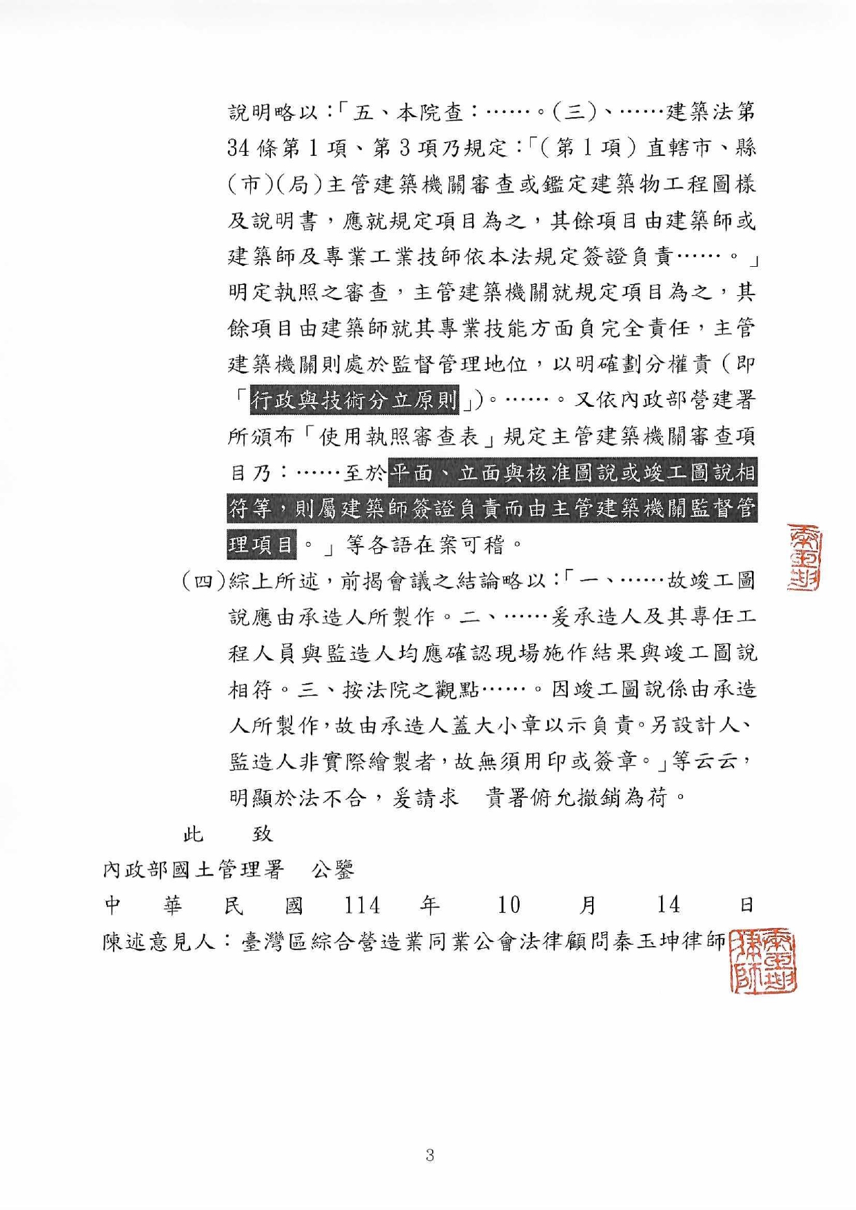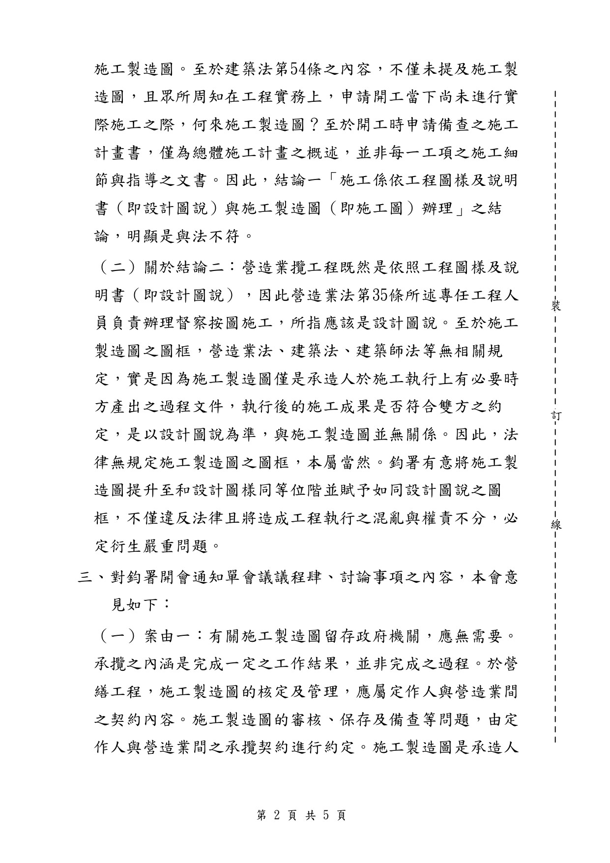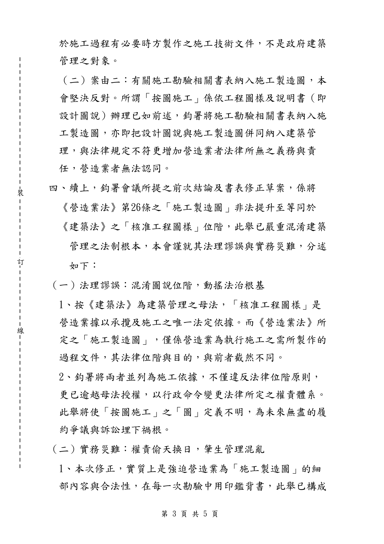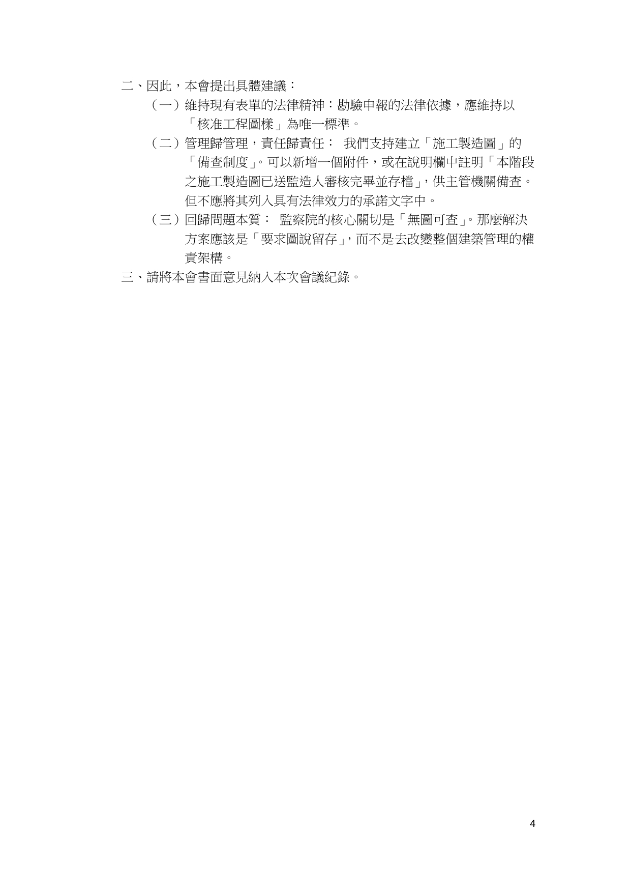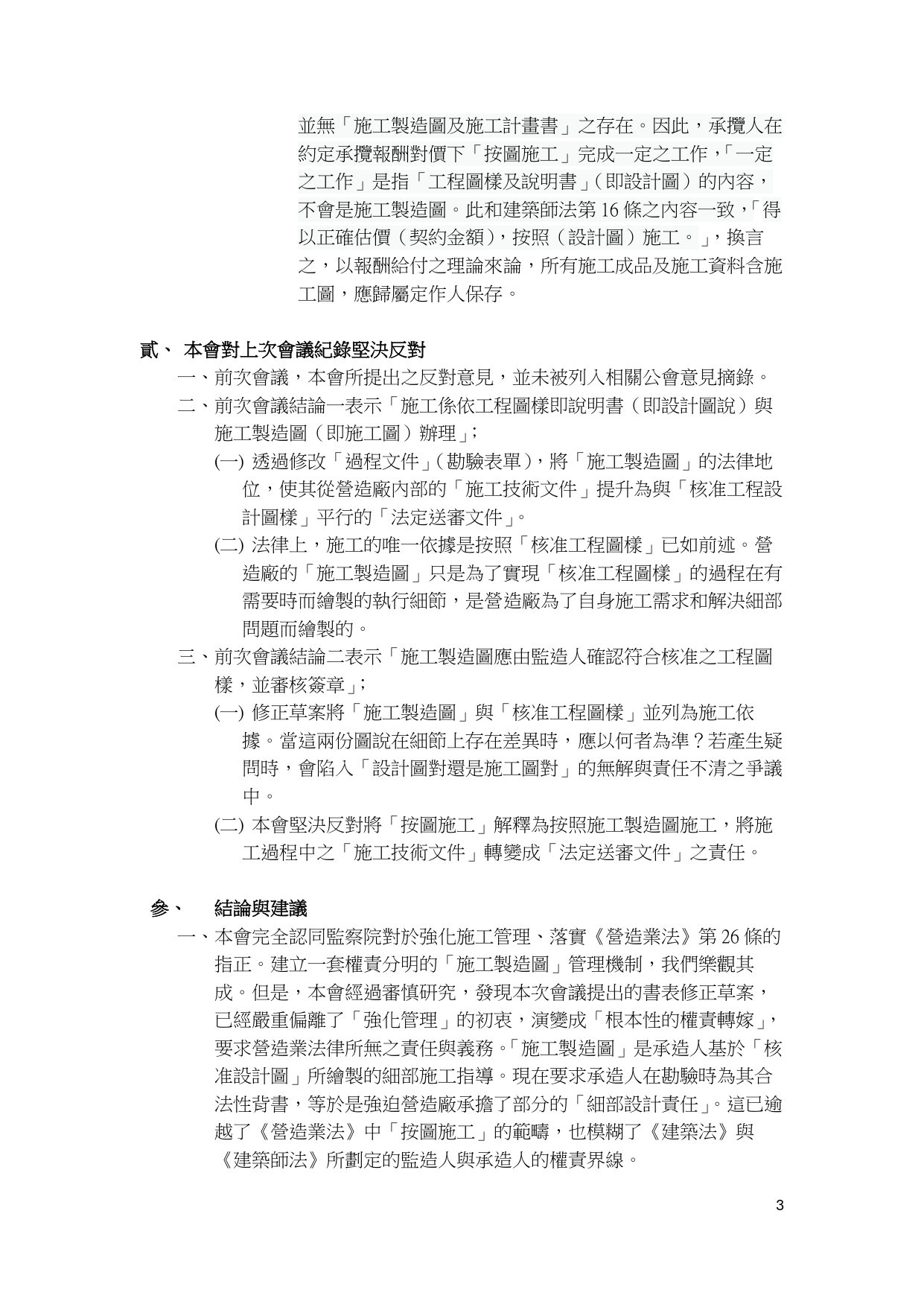有關國土署施工製造圖相關議題其適法性存有重大爭議,提出114年10月15日「建築物施工管理及書表第2次研 商會議」所提修正草案,故本次會議將不派代表參加。 2025-11-18 檔案下載 本會11月17日 業1141100101號函文 , 有關中華民國全國建築師公會114年11月20日「研商施工製造圖繳交內容及作業相關事宜專案會議」,因本會自始即主張內政部國土管理署提出之施工製造圖相關議題其適法性存有重大爭議,故本次會議將不派代表參加,餘如說明