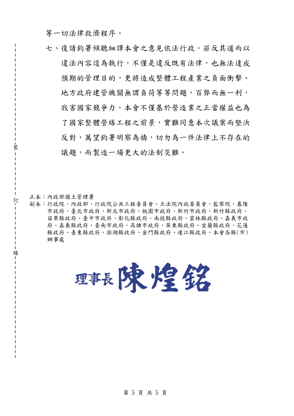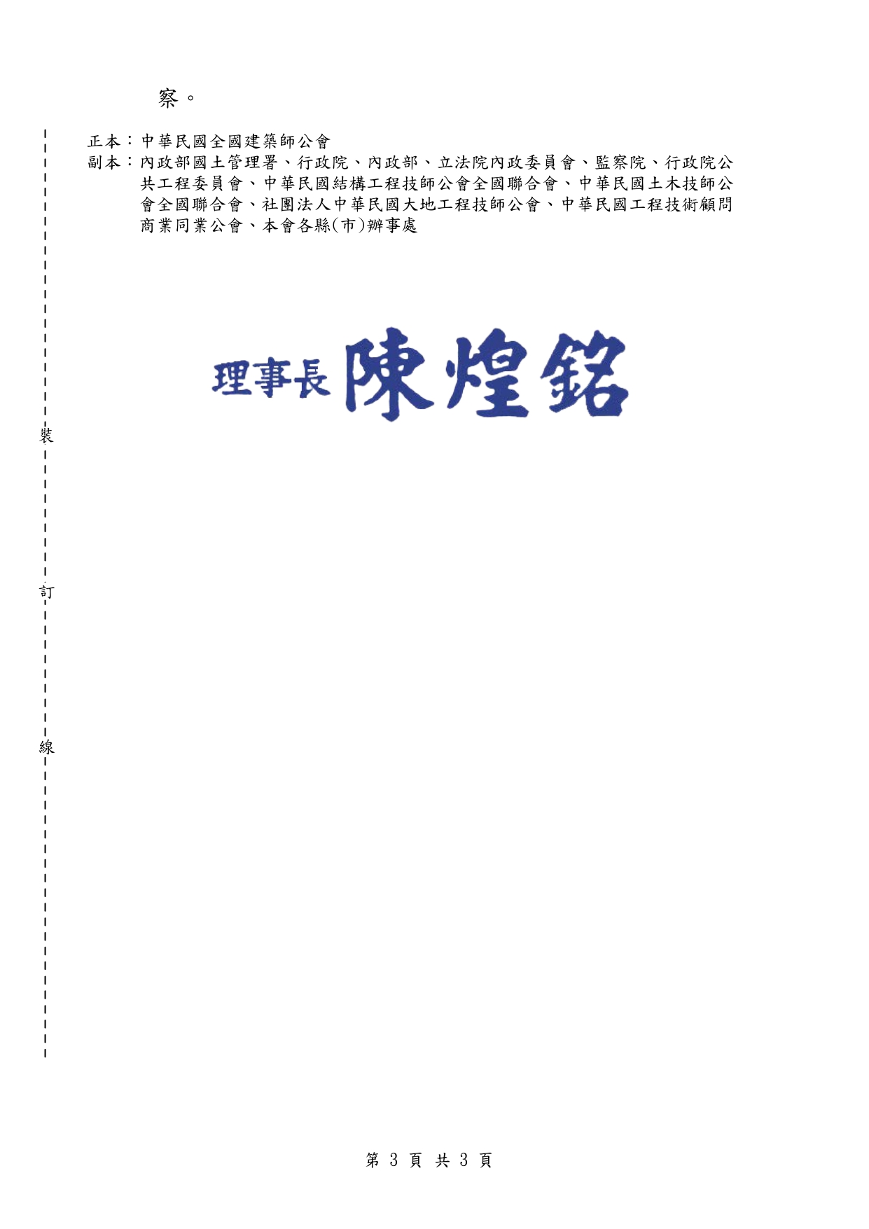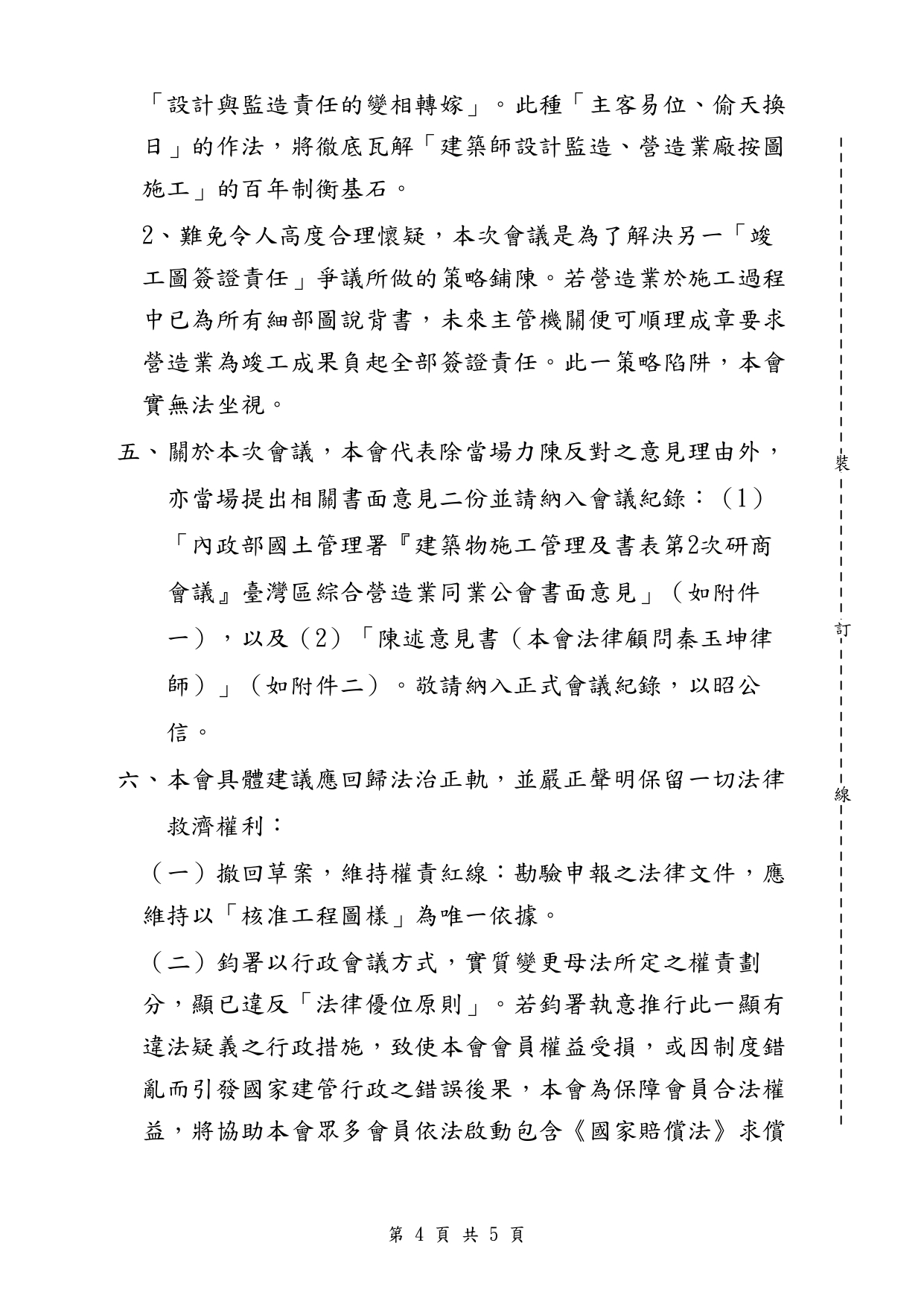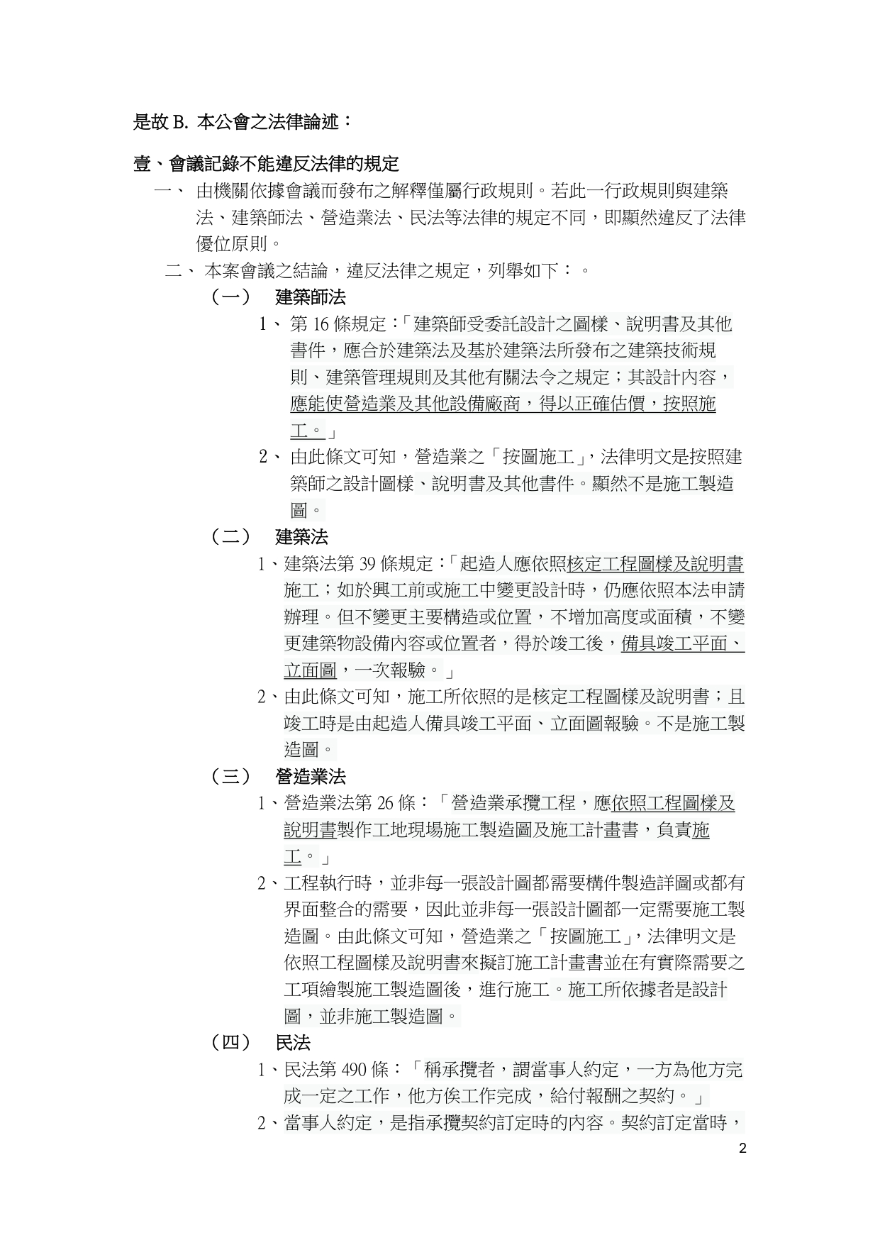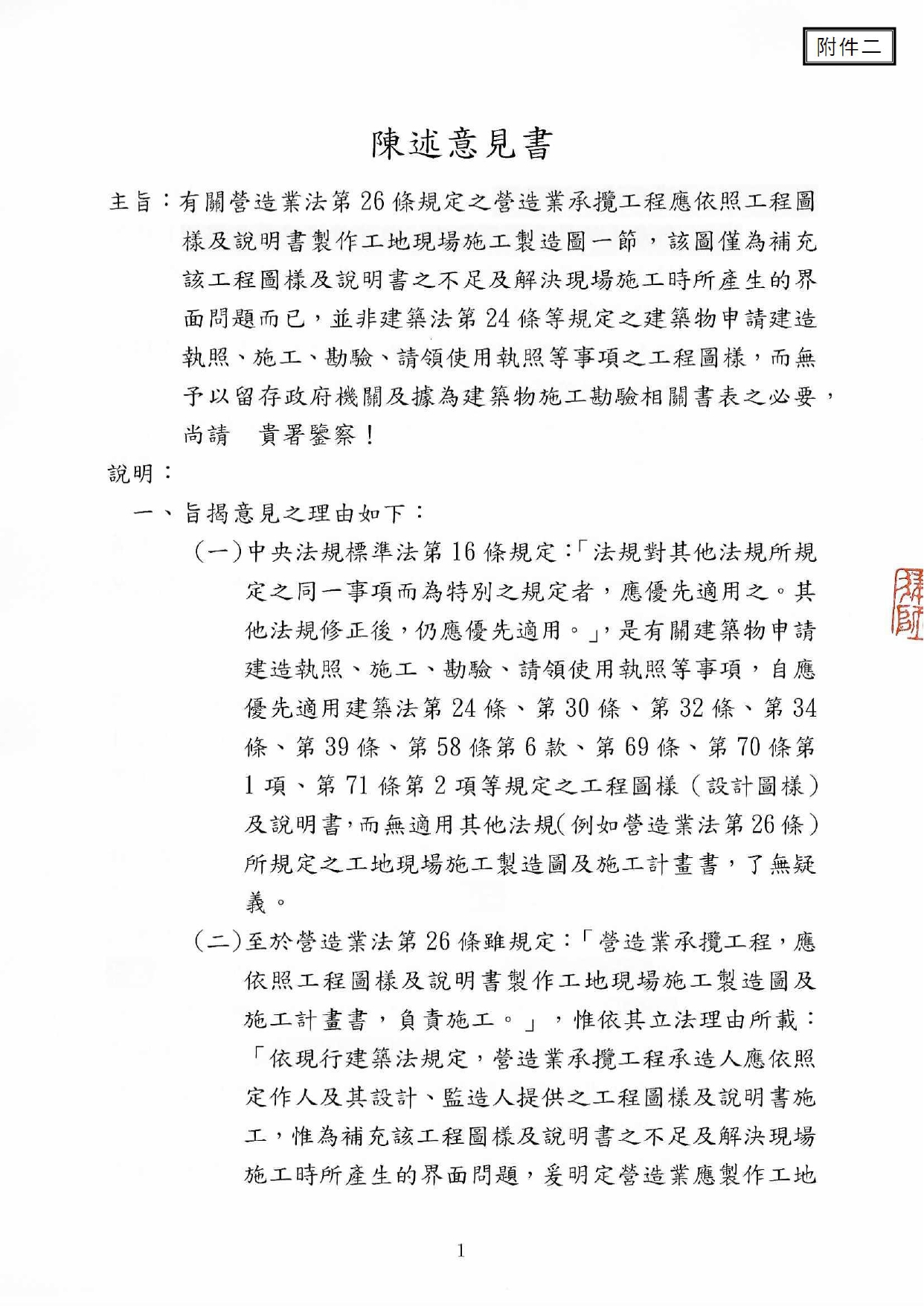 有關國土署施工製造圖相關議題其適法性存有重大爭議,提出114年10月15日「建築物施工管理及書表第2次研 商會議」所提修正草案,故本次會議將不派代表參加。 2025-11-18 檔案下載 本會11月17日 業1141100101號函文 , 有關中華民國全國建築師公會114年11月20日「研商施工製造圖繳交內容及作業相關事宜專案會議」,因本會自始即主張內政部國土管理署提出之施工製造圖相關議題其適法性存有重大爭議,故本次會議將不派代表參加,餘如說明