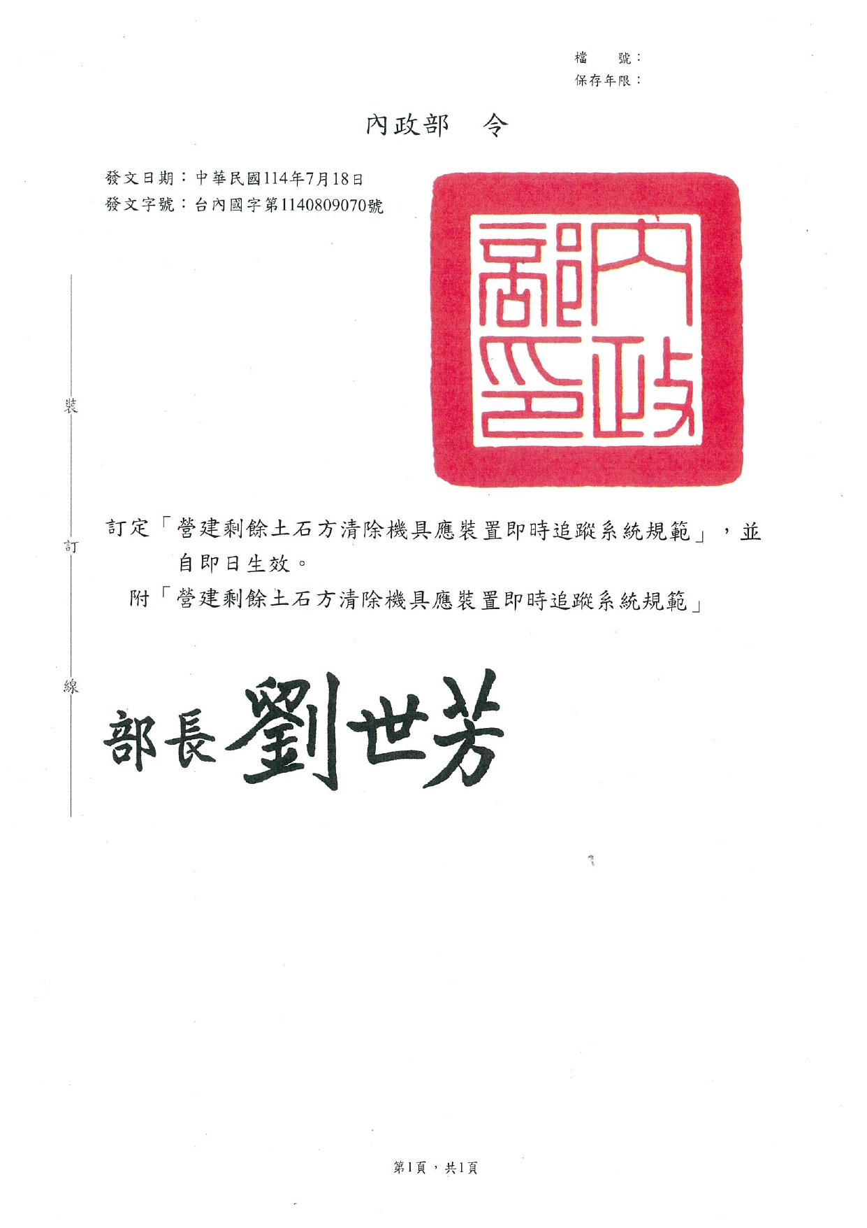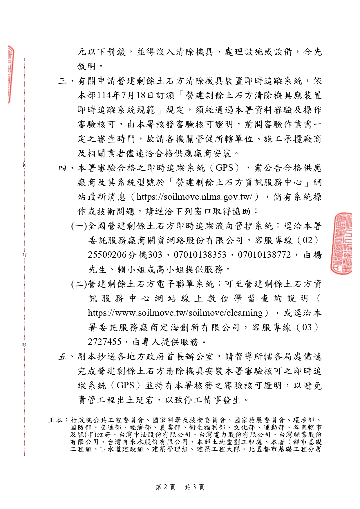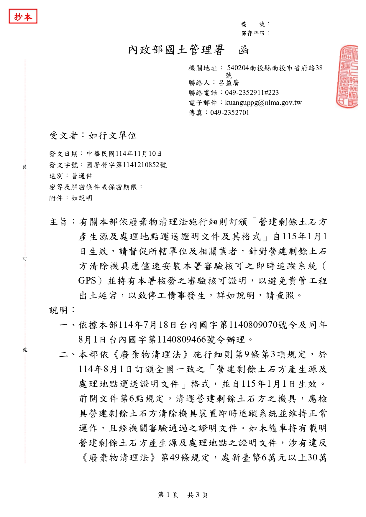 國土署 有關內政部依廢棄物清理法施行細則訂頒「營建剩餘土石方產生源及處理地點運送證明文件及其格式」自115年1月1日生效 2025-11-19 檔案下載 內政部國土管理署 114.11.18 國署營字第1141220295號函 有關內政部依廢棄物清理法施行細則訂頒「營建剩餘土石方產生源及處理地點運送證明文件及其格式」自115年1月1日生效,針對營建剩餘土石方清除機具應儘速安裝本署審驗核可之即時追蹤系統(GPS)並持有內政部國土管理署核發之審驗核可證明,以避免工程出土延宕,以致停工情事發生,詳如說明。