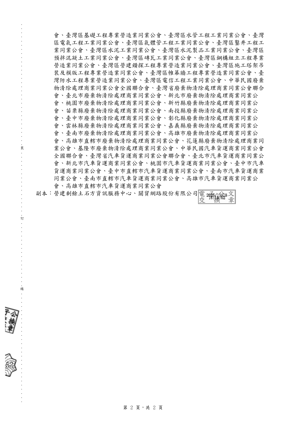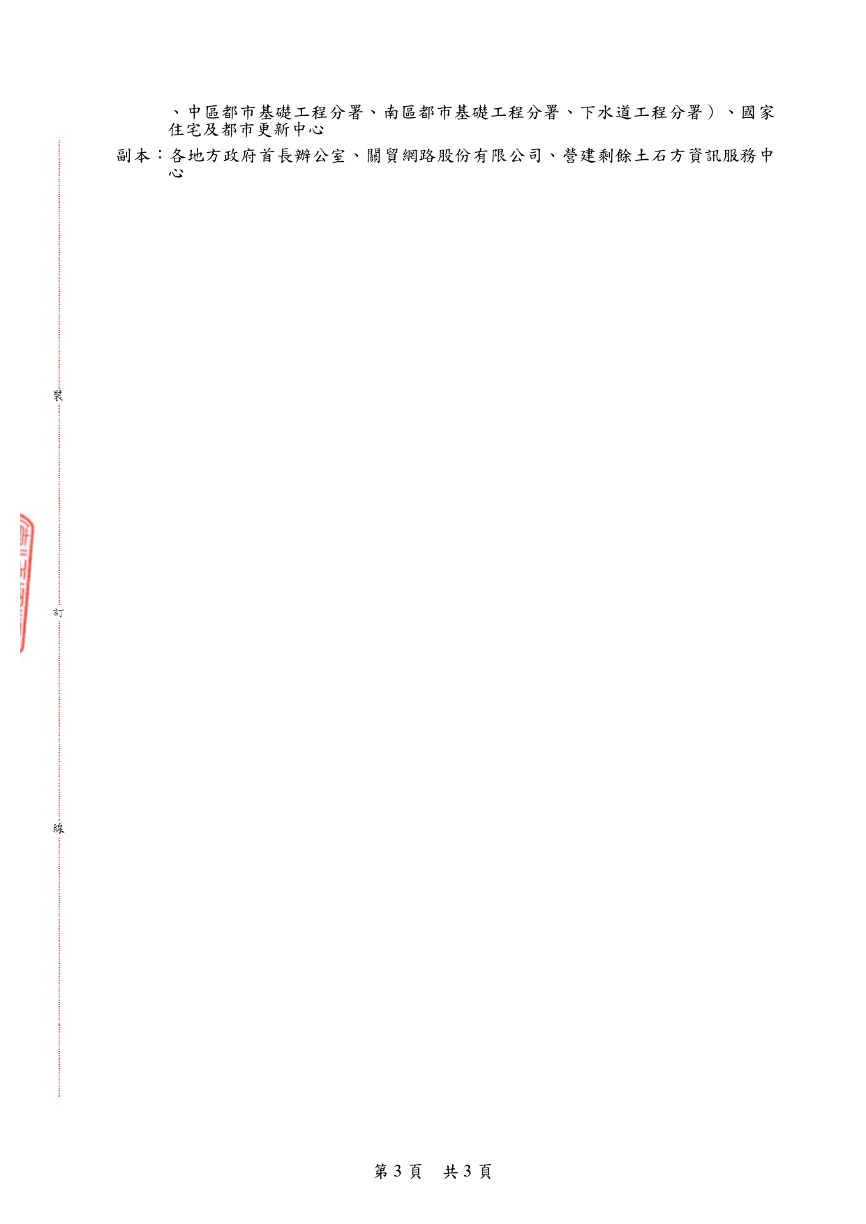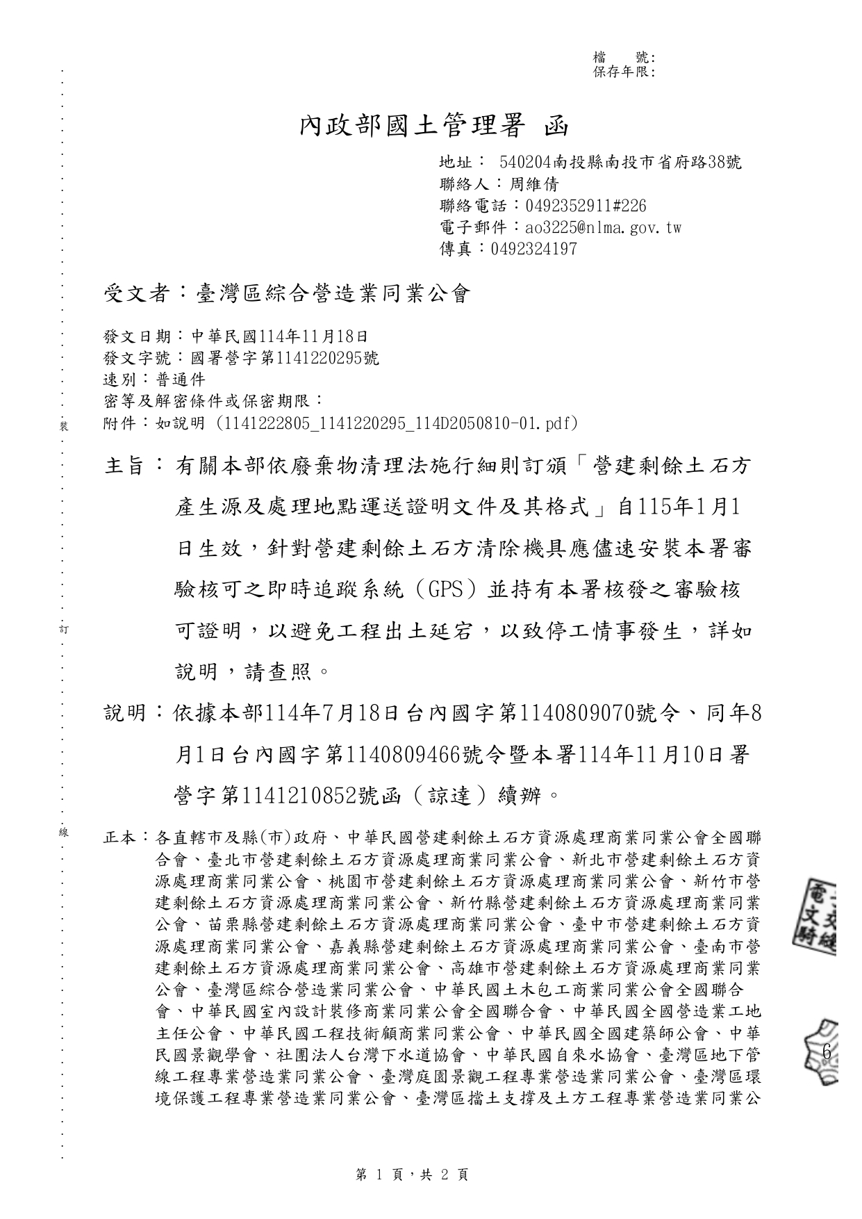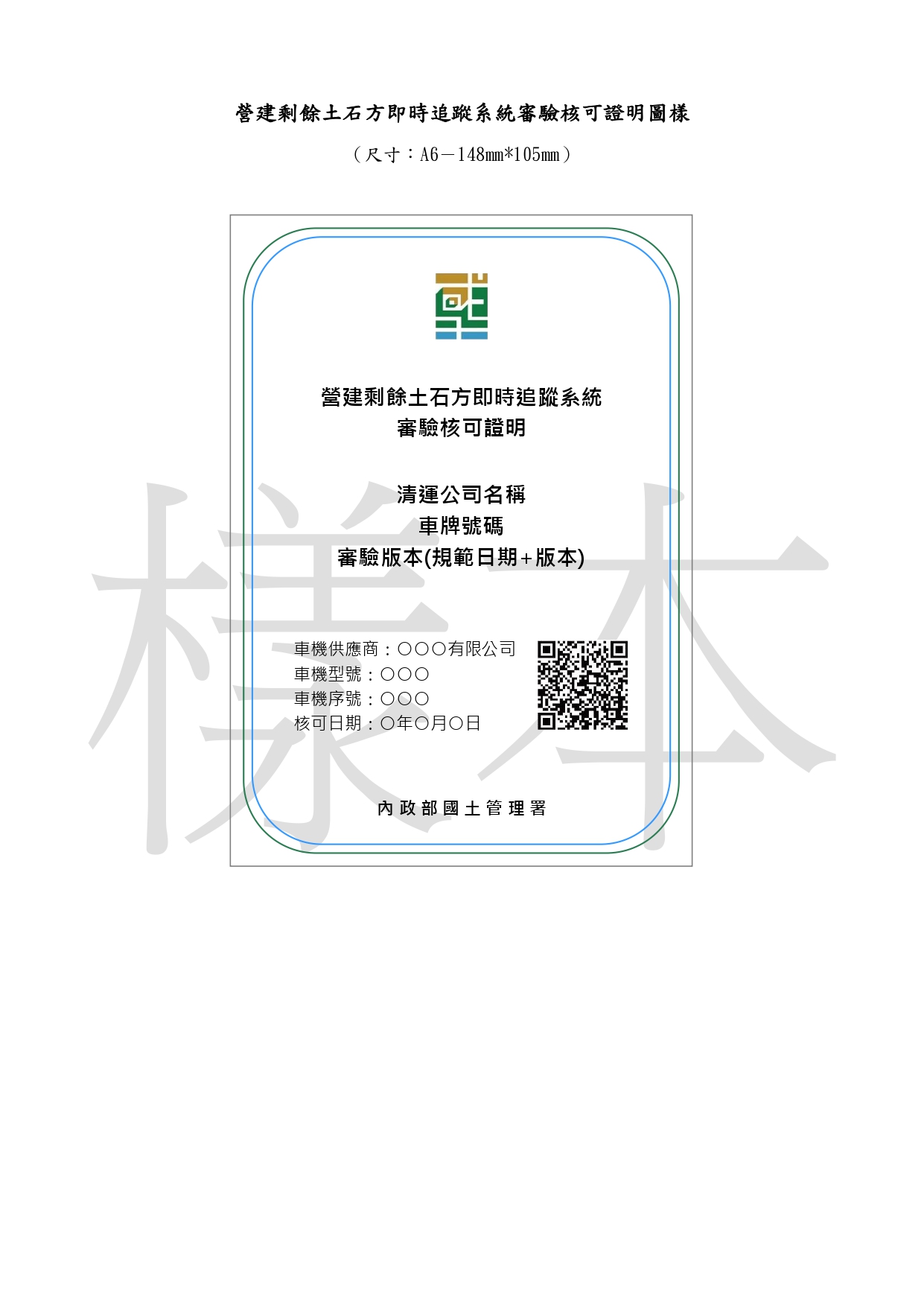國土署 有關內政部依廢棄物清理法施行細則訂頒「營建剩餘土石方產生源及處理地點運送證明文件及其格式」自115年1月1日生效 2025-11-19 檔案下載 內政部國土管理署 114.11.18 國署營字第1141220295號函 有關內政部依廢棄物清理法施行細則訂頒「營建剩餘土石方產生源及處理地點運送證明文件及其格式」自115年1月1日生效,針對營建剩餘土石方清除機具應儘速安裝本署審驗核可之即時追蹤系統(GPS)並持有內政部國土管理署核發之審驗核可證明,以避免工程出土延宕,以致停工情事發生,詳如說明。