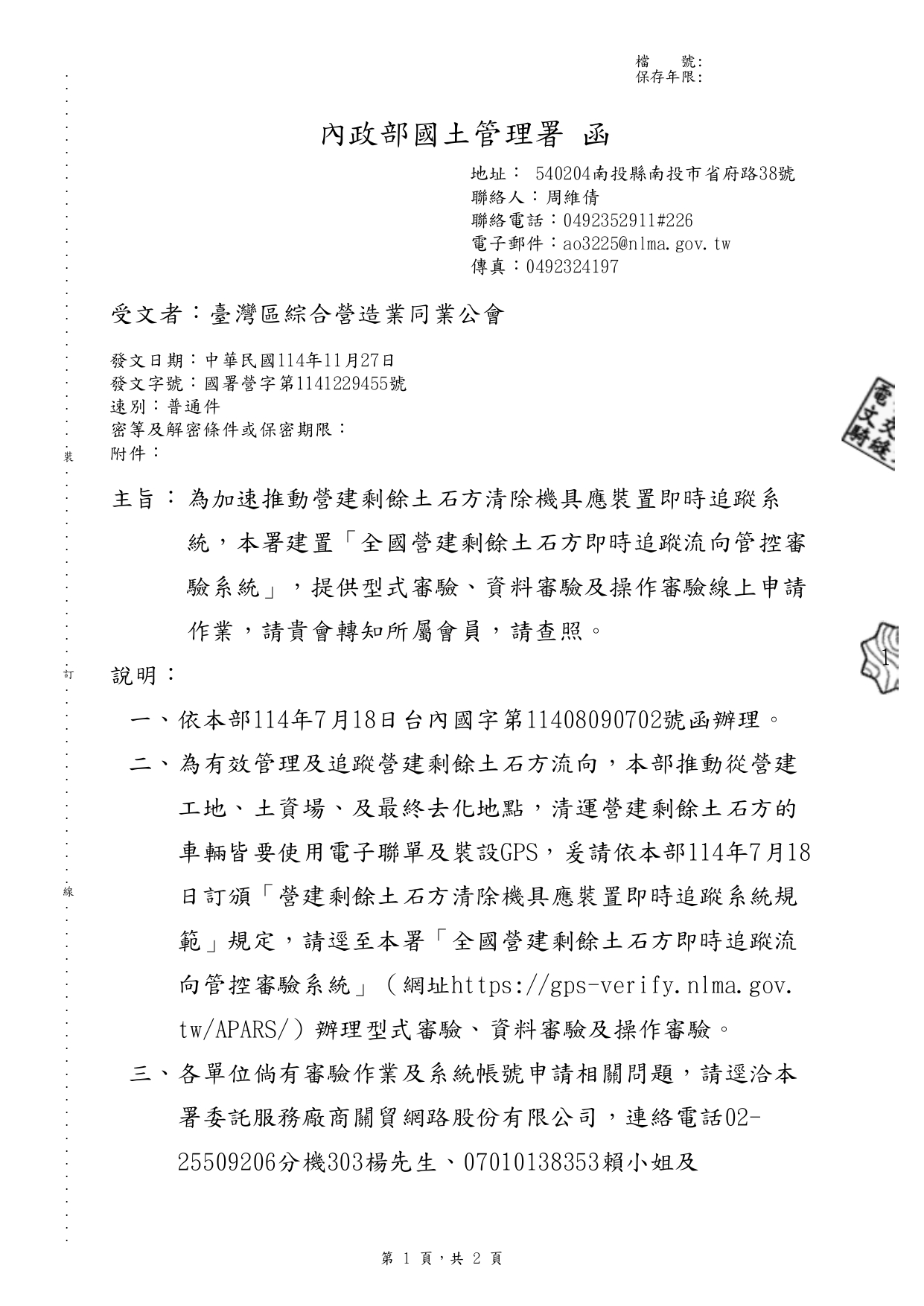 國土管理署 建置「全國營建剩餘土石方即時追蹤流向管控審驗系統」,提供型式審驗、資料審驗及操作審驗線上申請作業 2025-12-01 檔案下載 內政部國土管理署 114.11.27 國署營字第1141229455號函 有關為加速推動營建剩餘土石方清除機具應裝置即時追蹤系統, 內政部國土管理署建置「全國營建剩餘土石方即時追蹤流向管控審驗系統」,提供型式審驗、資料審驗及操作審驗線上申請作業