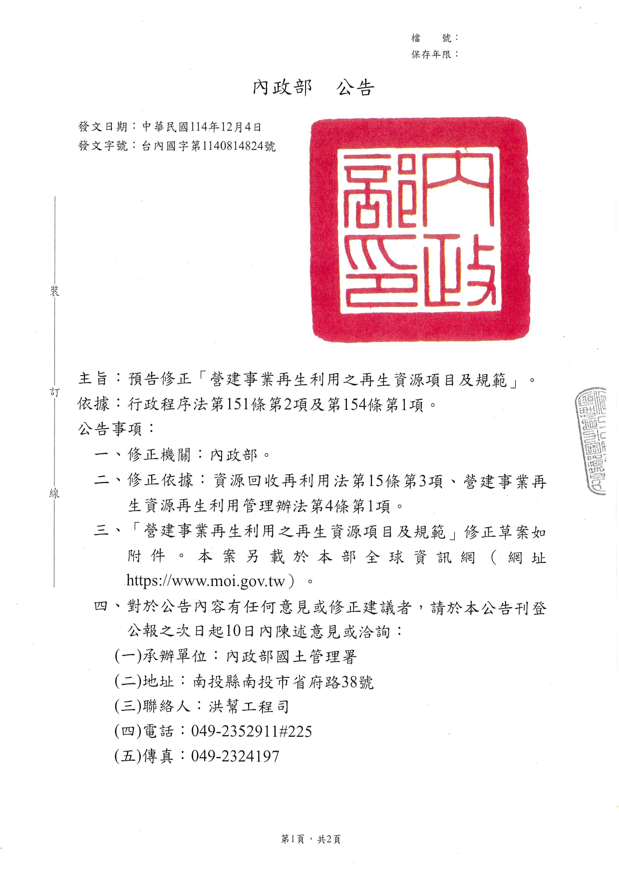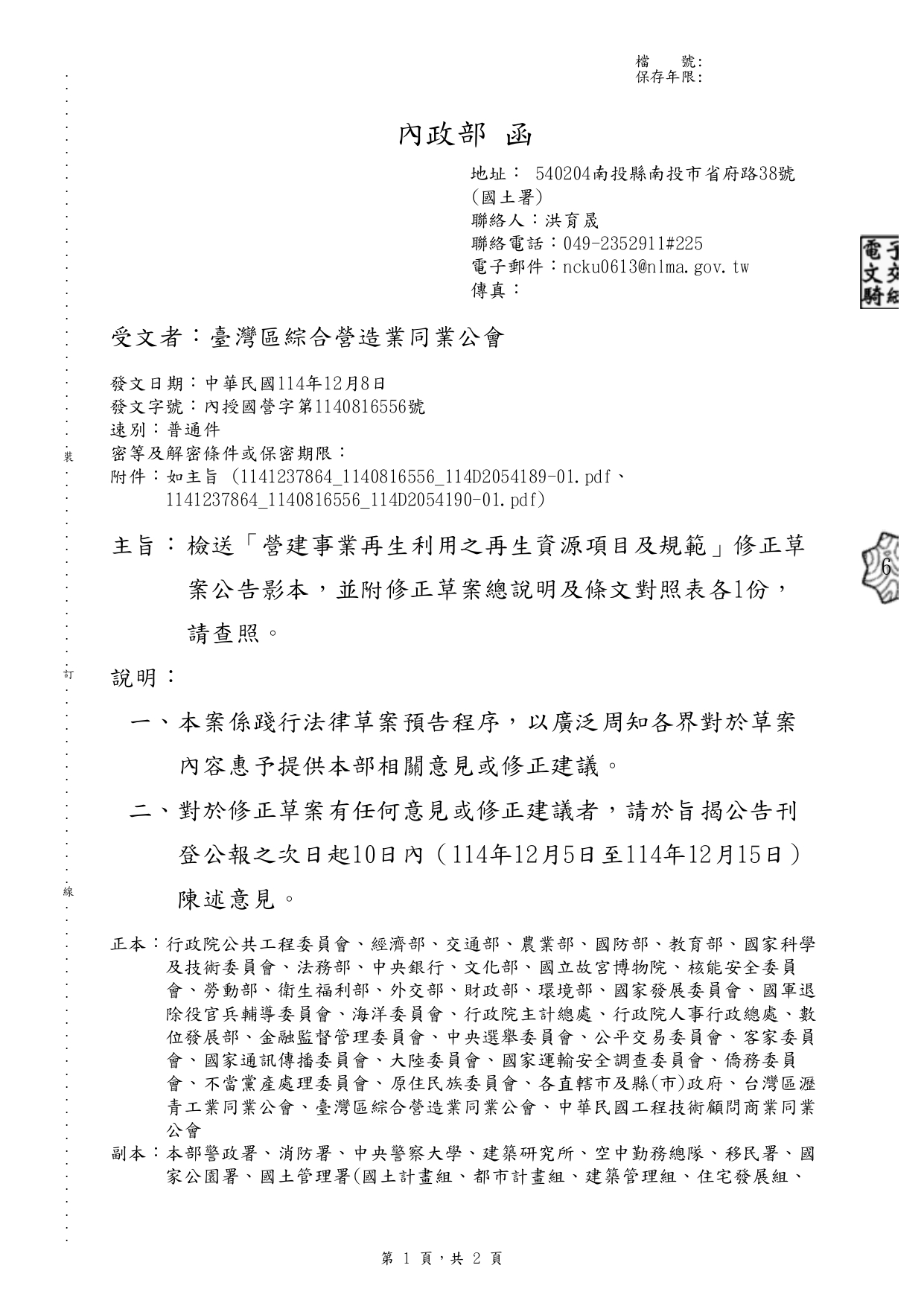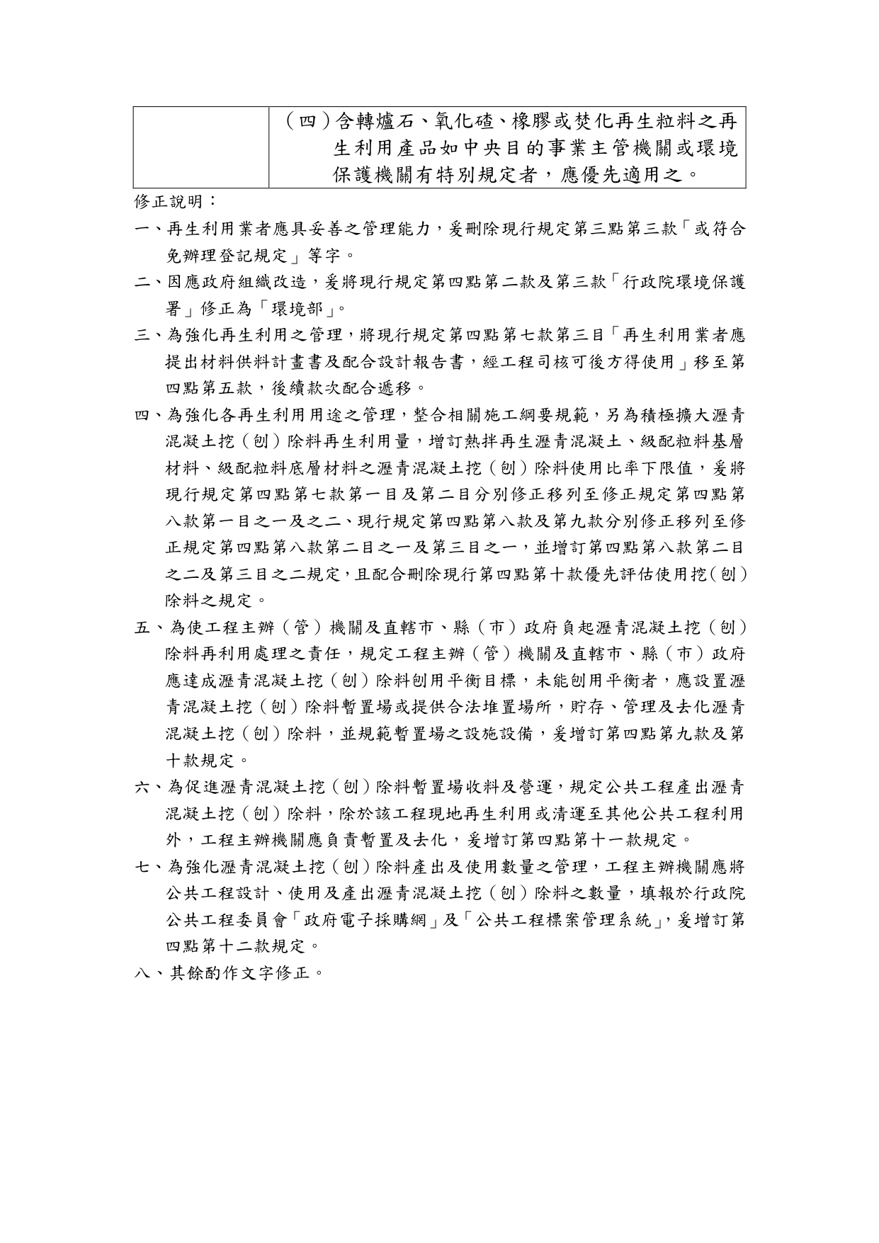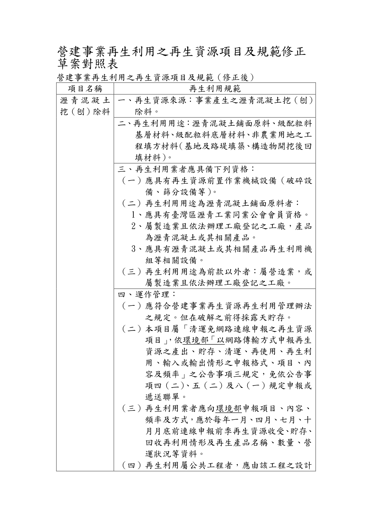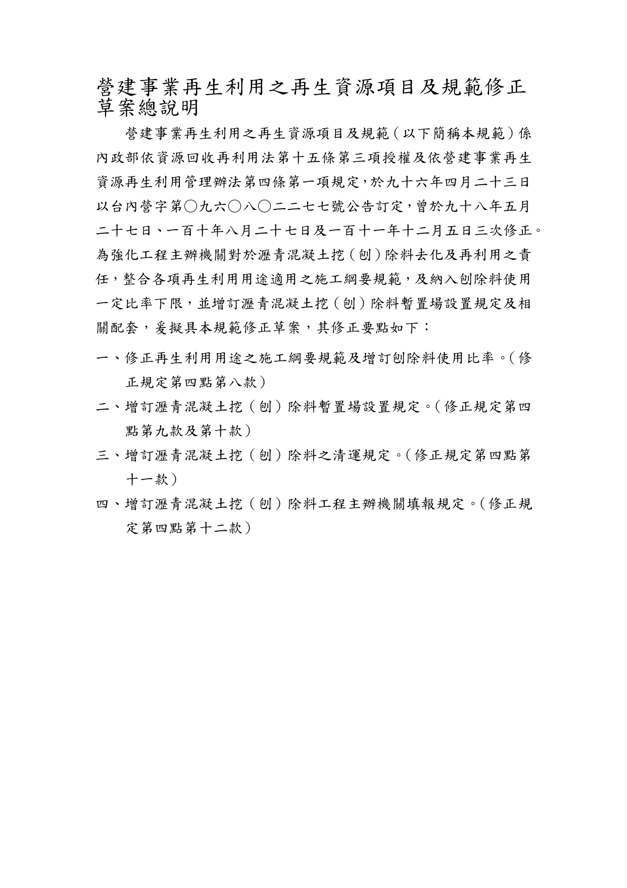 內政部「營建事業再生利用之再生資源項目及規範」修正草案公告影本,並附修正草案總說明及條文對照表各1份 2025-12-11 檔案下載 內政部 114.12.8 內授國營字第1140816556號函 檢送「營建事業再生利用之再生資源項目及規範」修正草案公告影本,並附修正草案總說明及條文對照表各1份