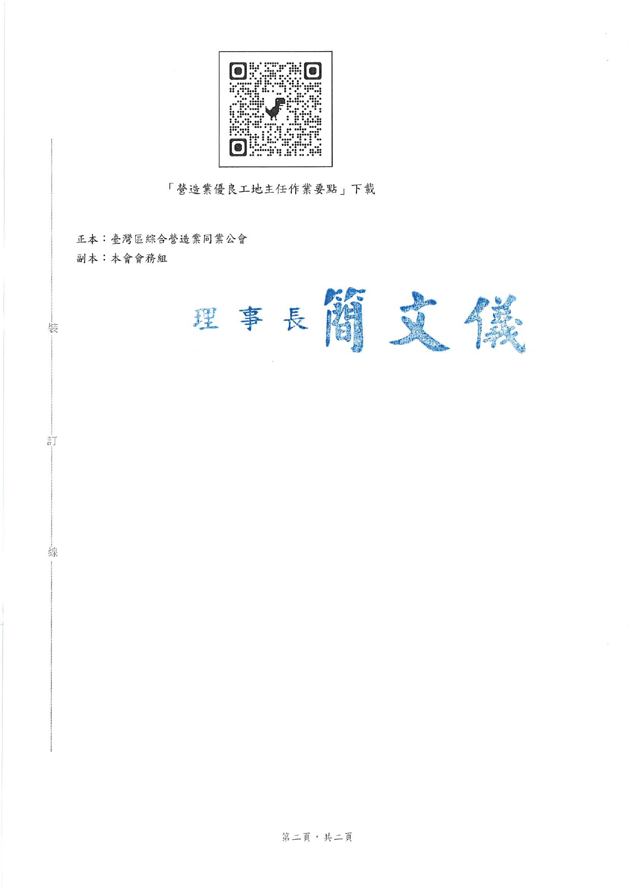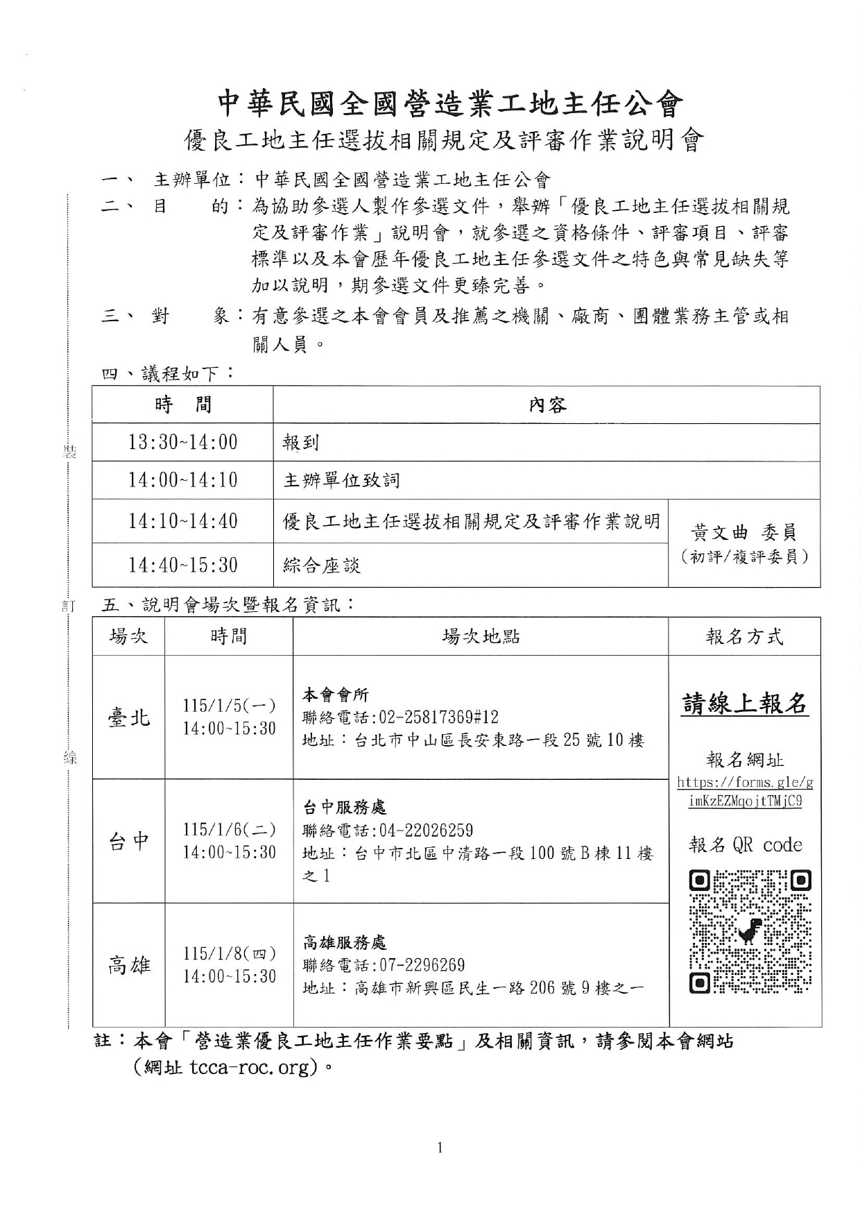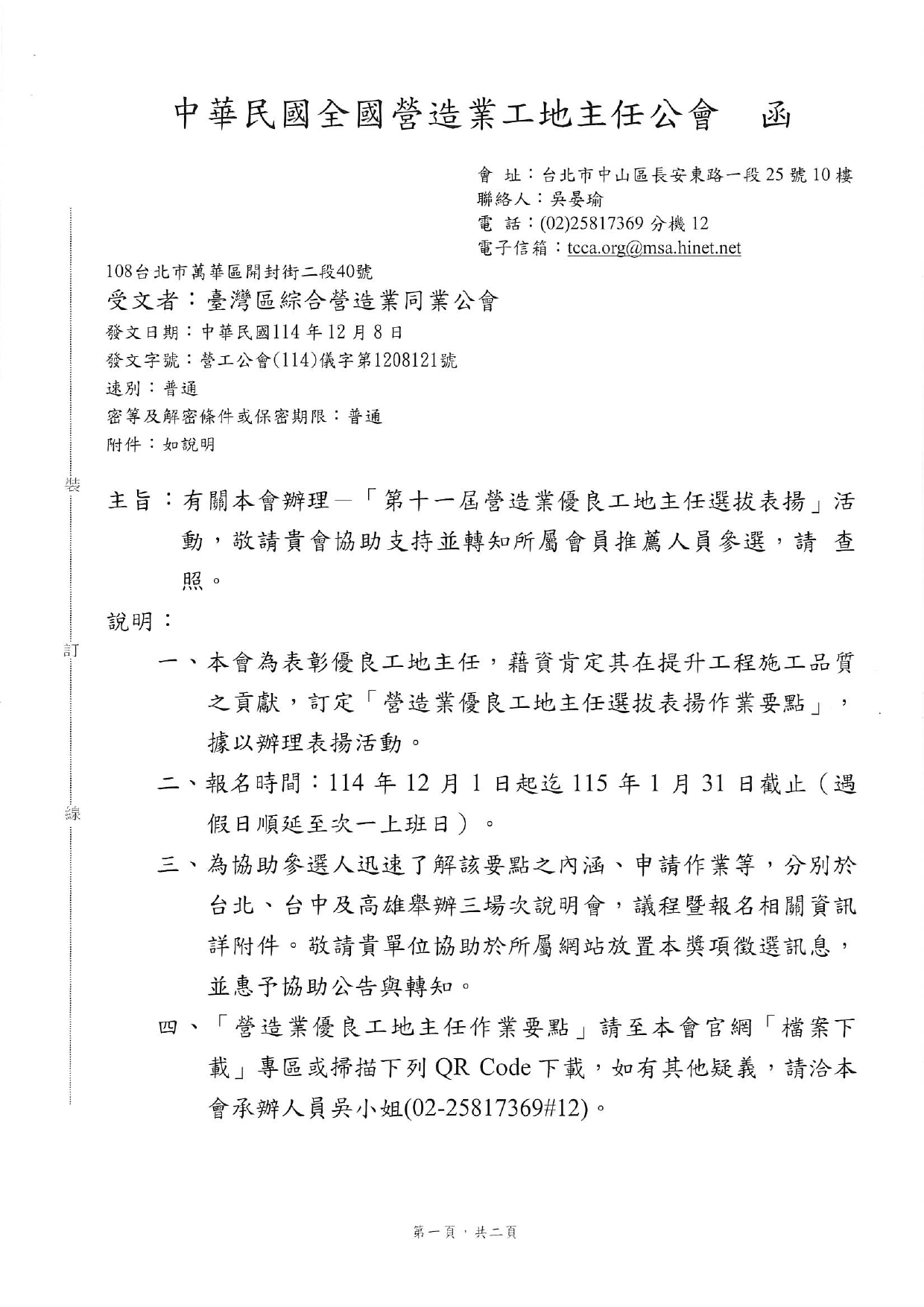 中華民國全國營造業工地主任公會 114.12.8 營工公會(114)儀字第1208121號函