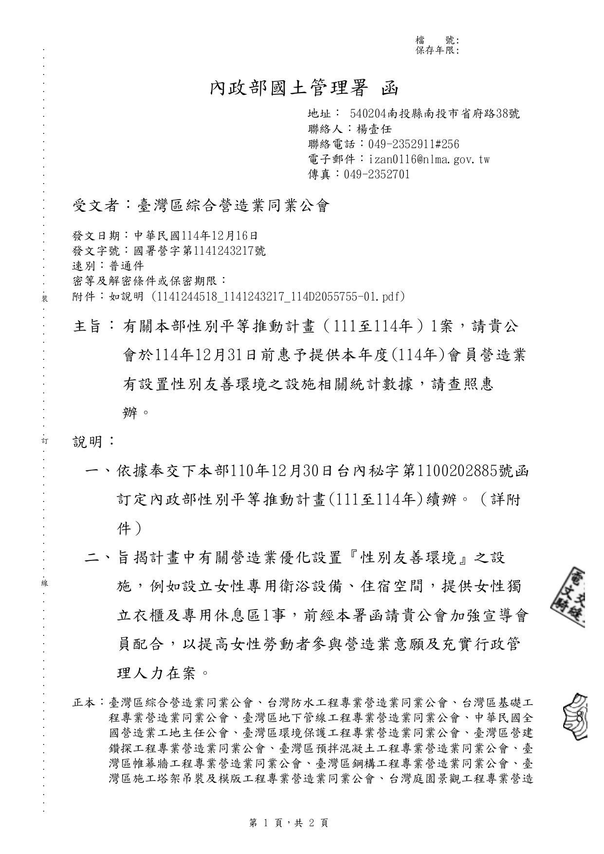有關內政部性別平等推動計畫(111至114年)1案,請貴公會於114年12月31日前惠予提供本年度(114年)會員營造業有設置性別友善環境之設施相關統計數據