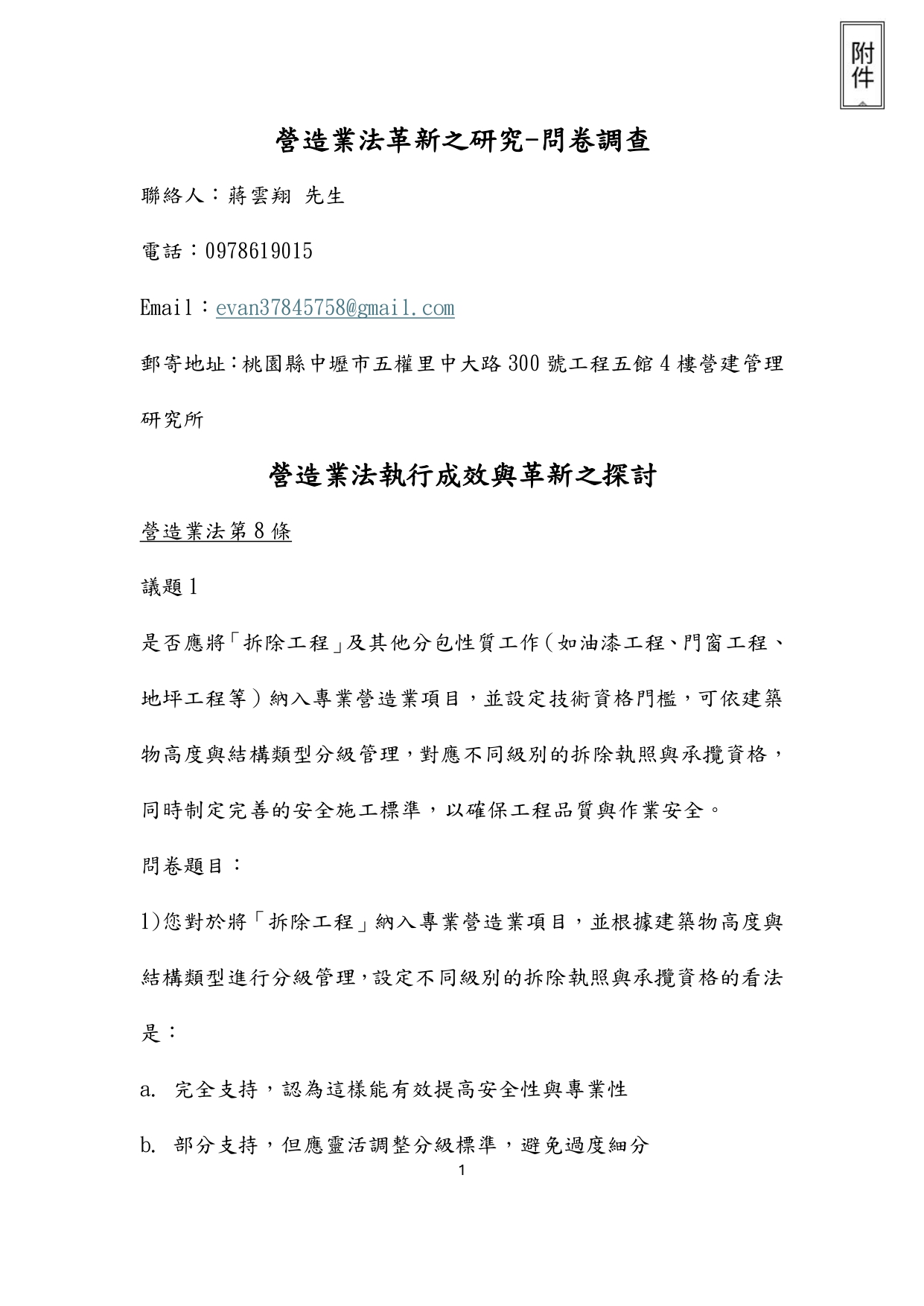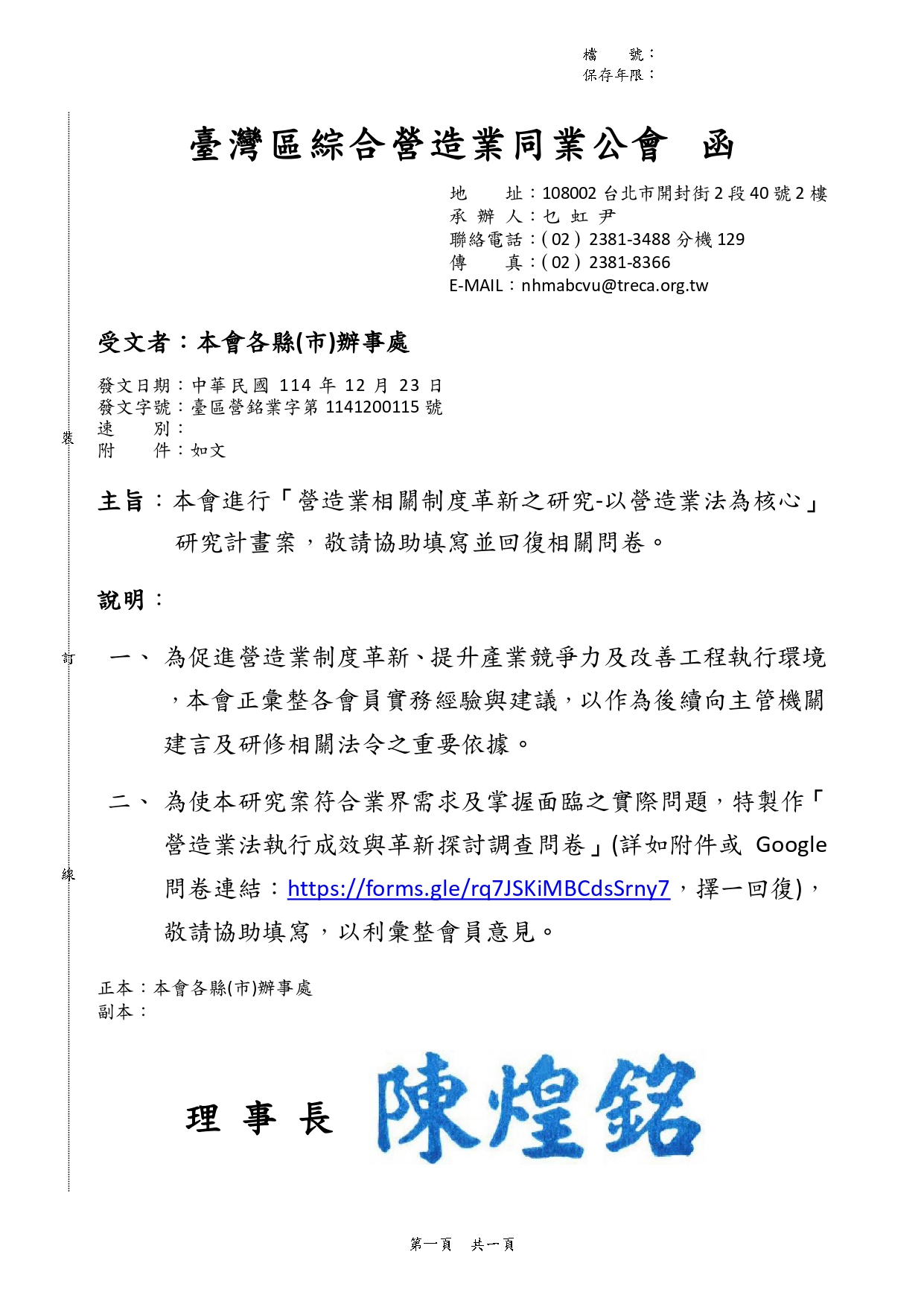 有關本會進行「營造業相關制度革新之研究-以營造業法為核心」研究計畫案,請轉轄區會員協助填寫並回復相關問卷