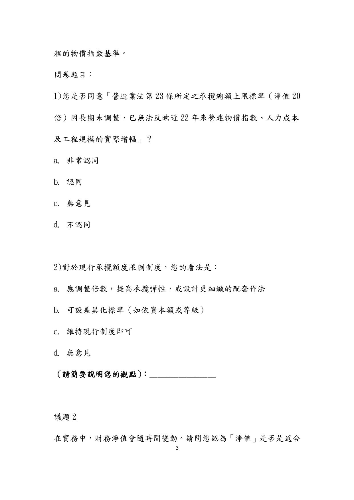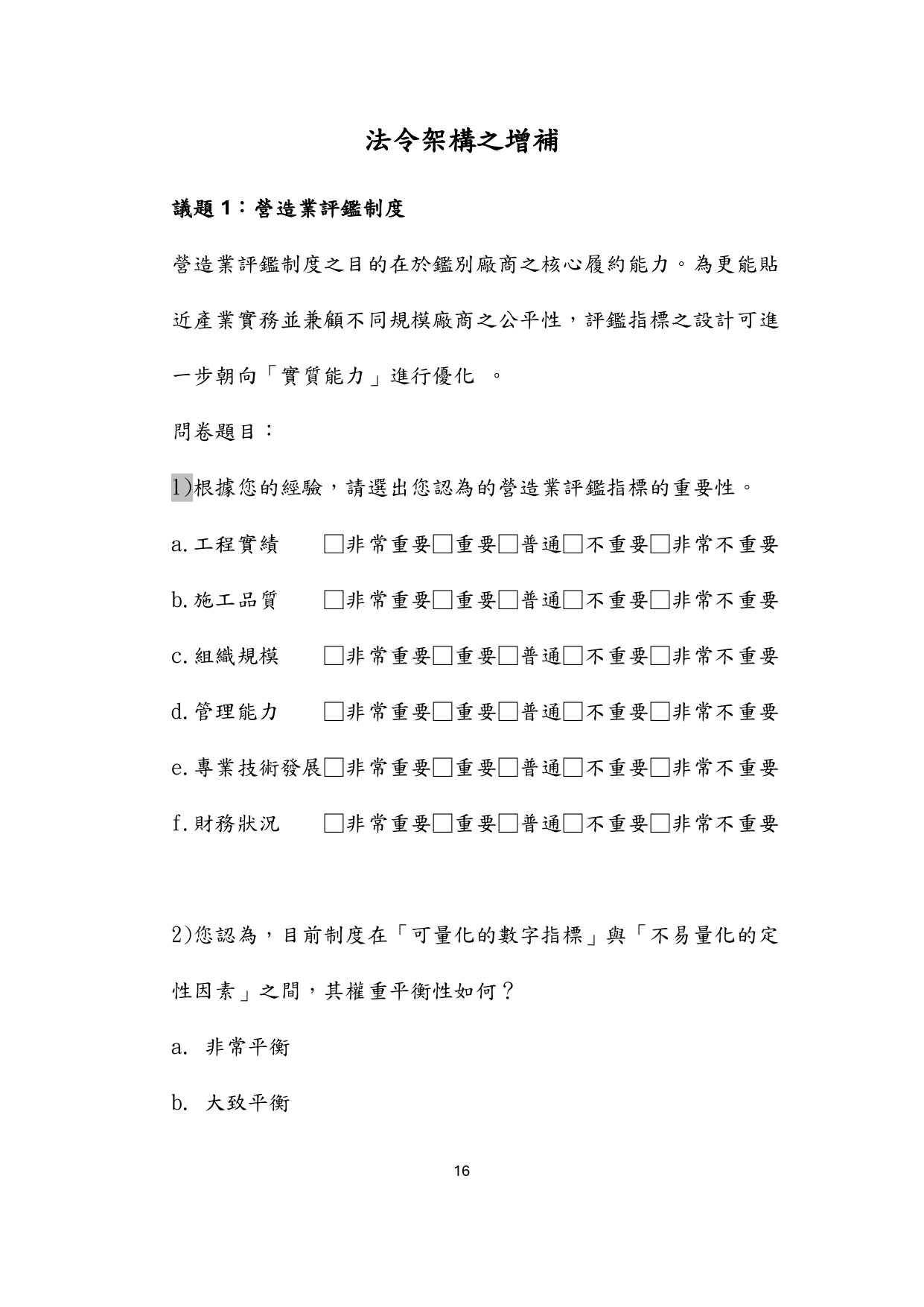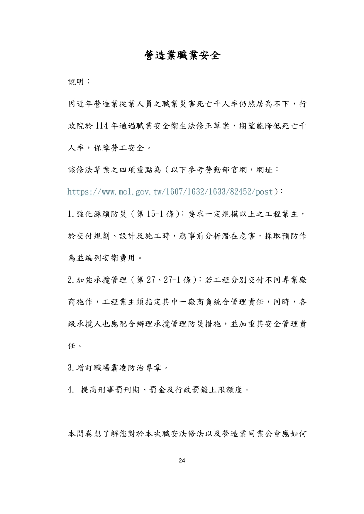特製作★「營造業法執行成效與革新探討調查問卷」(詳如附件或Google問卷連結:https://forms.gle/rq7JSKiMBCdsSrny7擇一回復), 請轉轄區會員協助填寫並回復相關問卷 ,以利彙整會員意見。