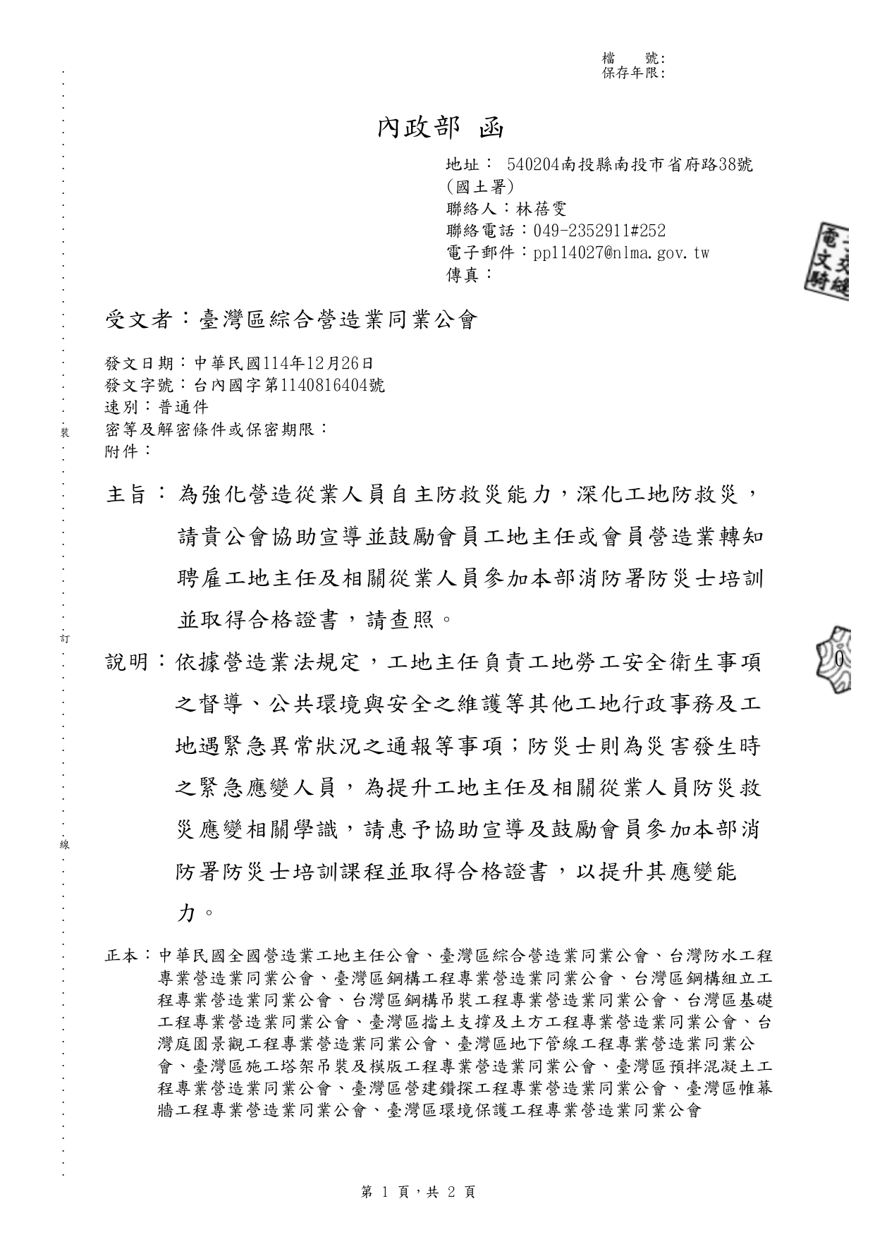內政部有關為強化營造從業人員自主防救災能力,深化工地防救災,請貴公會協助宣導並鼓勵會員工地主任或會員營造業轉知聘雇工地主任及相關從業人員參加本部消防署防災士培訓並取得合格證書 2025-12-31 檔案下載 內政部 114.12.26 台內國字第1140816404號函 有關為強化營造從業人員自主防救災能力,深化工地防救災,請貴公會協助宣導並鼓勵會員工地主任或會員營造業轉知聘雇工地主任及相關從業人員參加本部消防署防災士培訓並取得合格證書