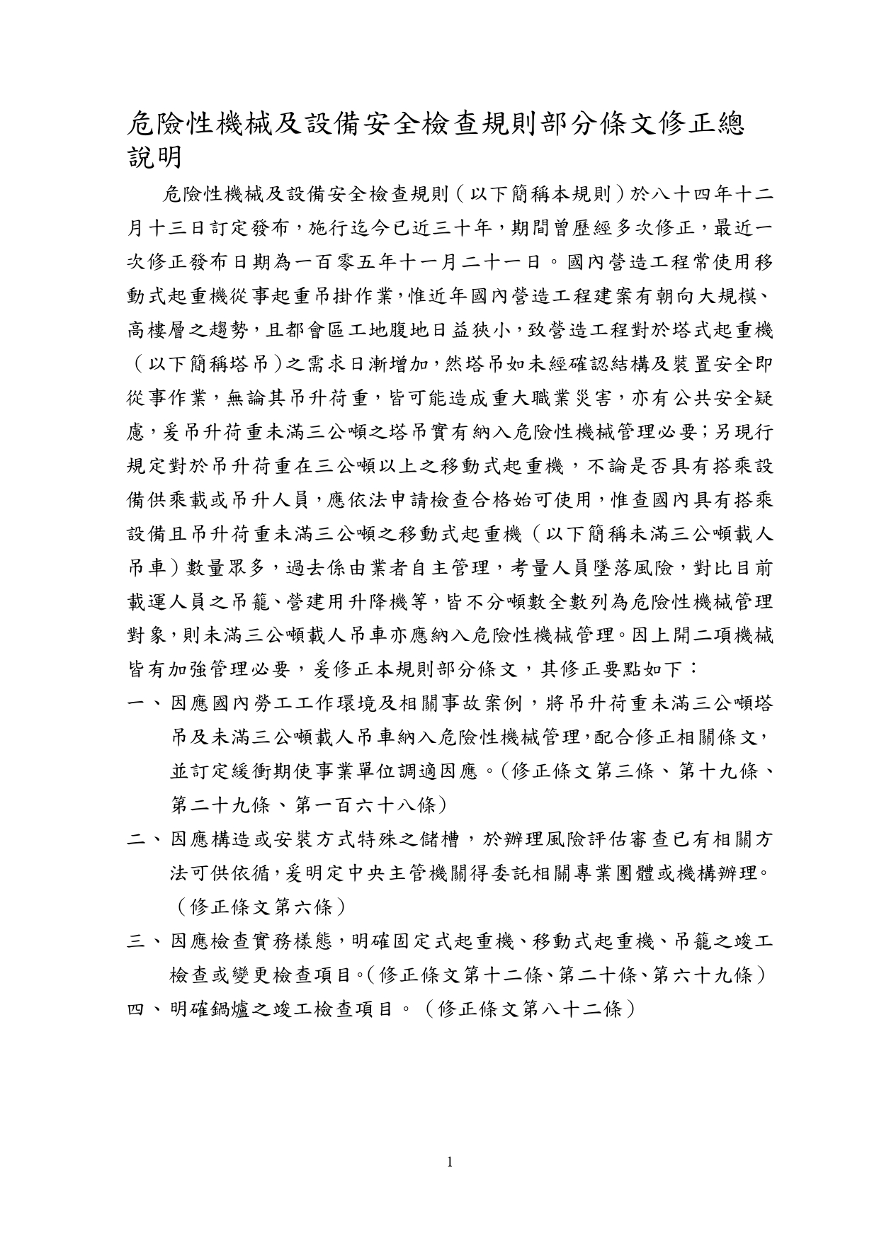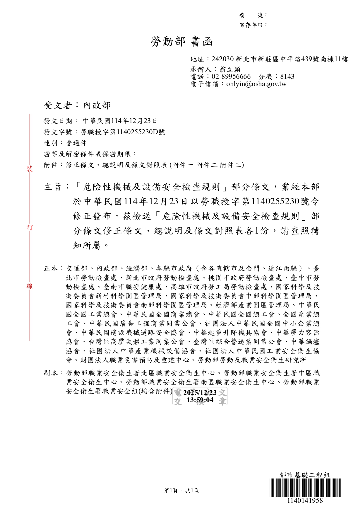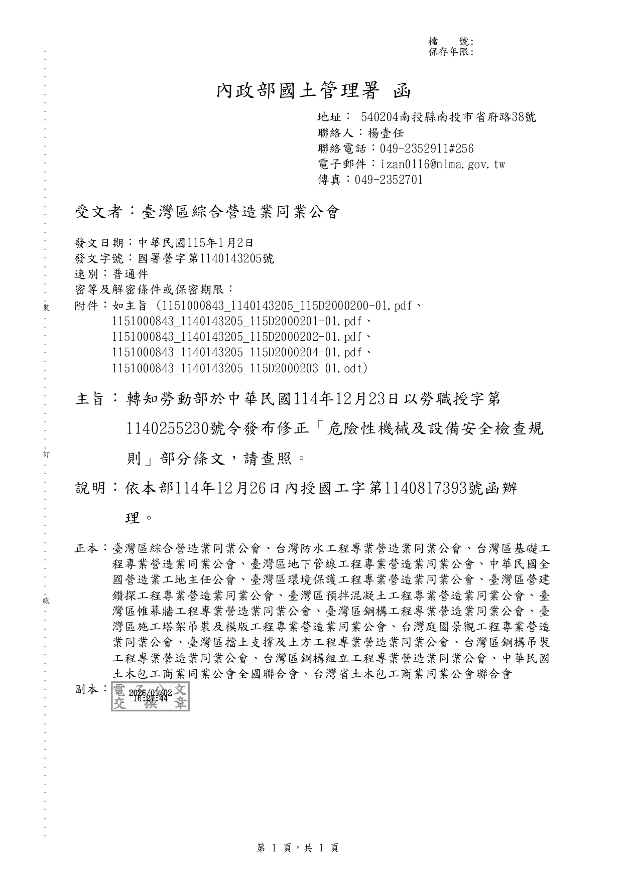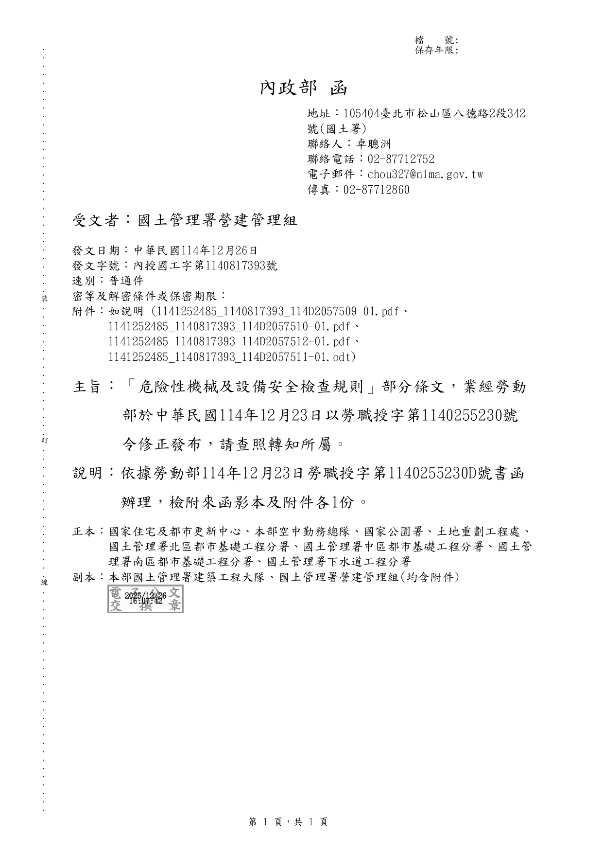 勞動部於中華民國114年12月23日以勞職授字第1140255230號令發布修正「危險性機械及設備安全檢查規則」部分條文 2026-01-08 檔案下載 內政部國土管理署 115.1.2 國署營字第1140143205號函 轉知勞動部於中華民國114年12月23日以勞職授字第1140255230號令發布修正「危險性機械及設備安全檢查規則」部分條文