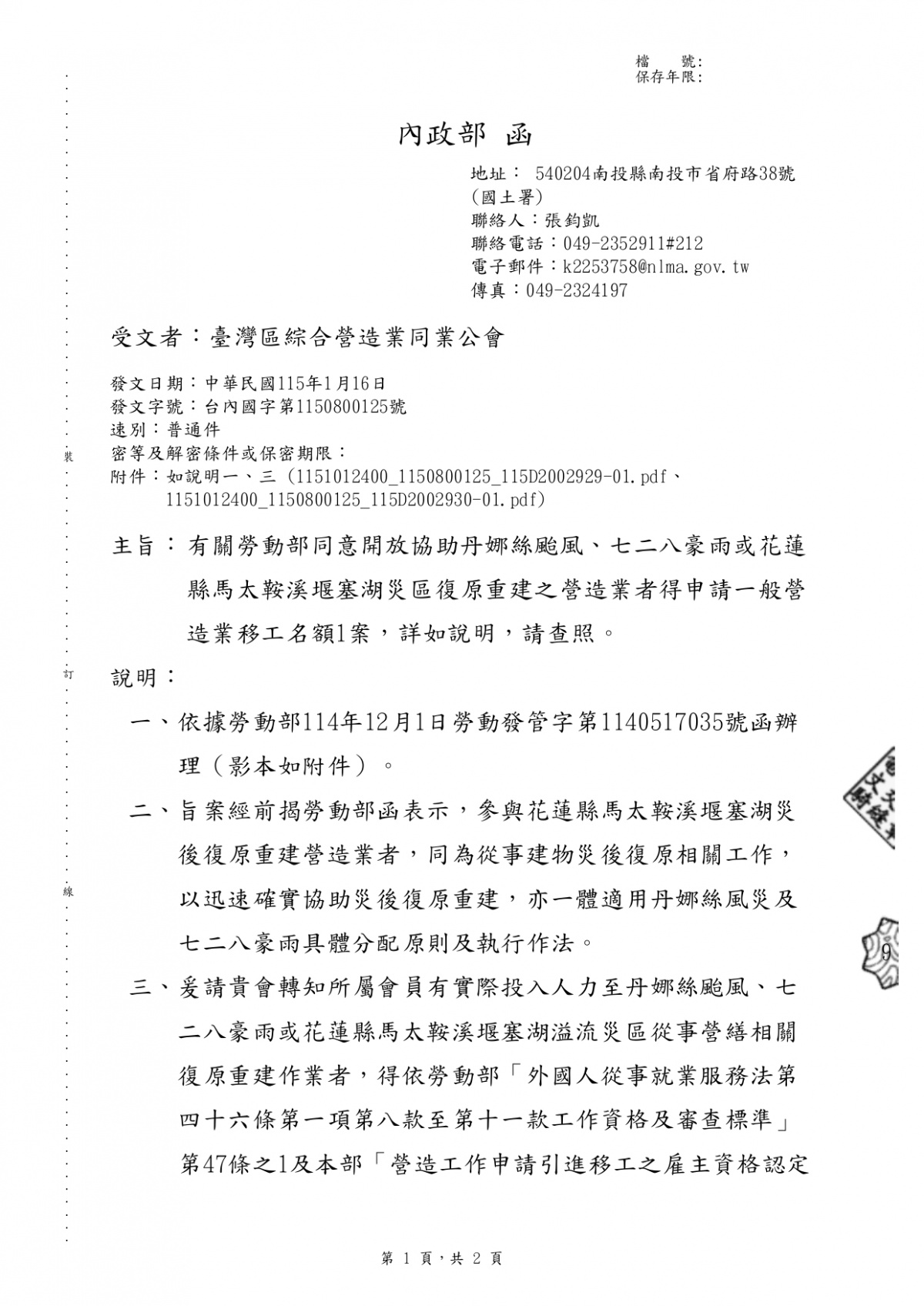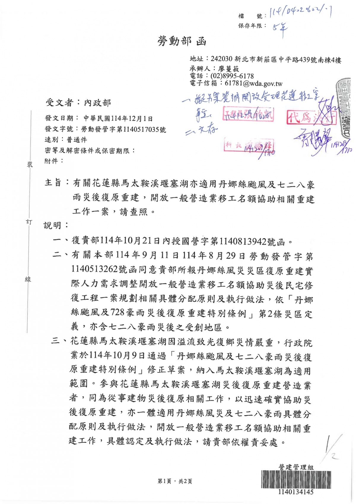 勞動部同意開放協助丹娜絲颱風、七二八豪雨或花蓮縣馬太鞍溪堰塞湖災區復原重建之營造業者得申請一般營造業移工名額1案