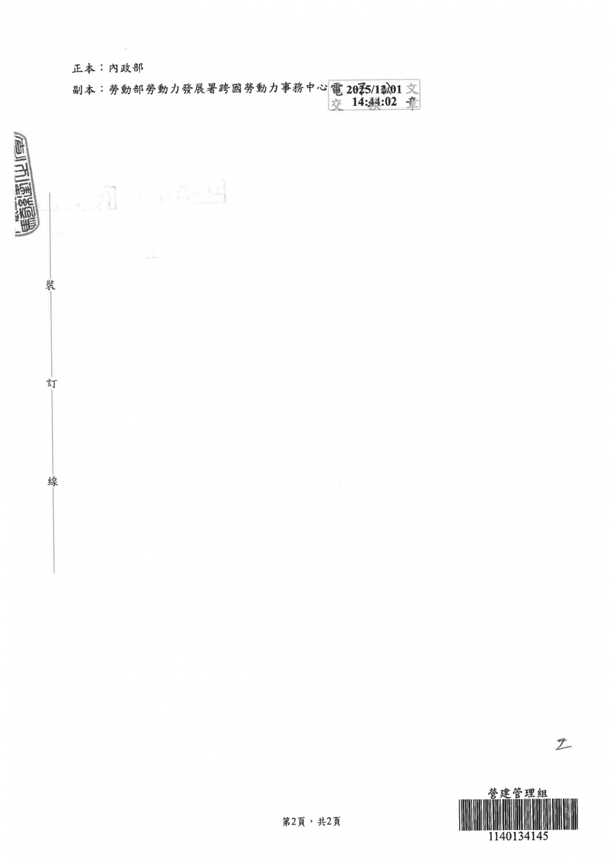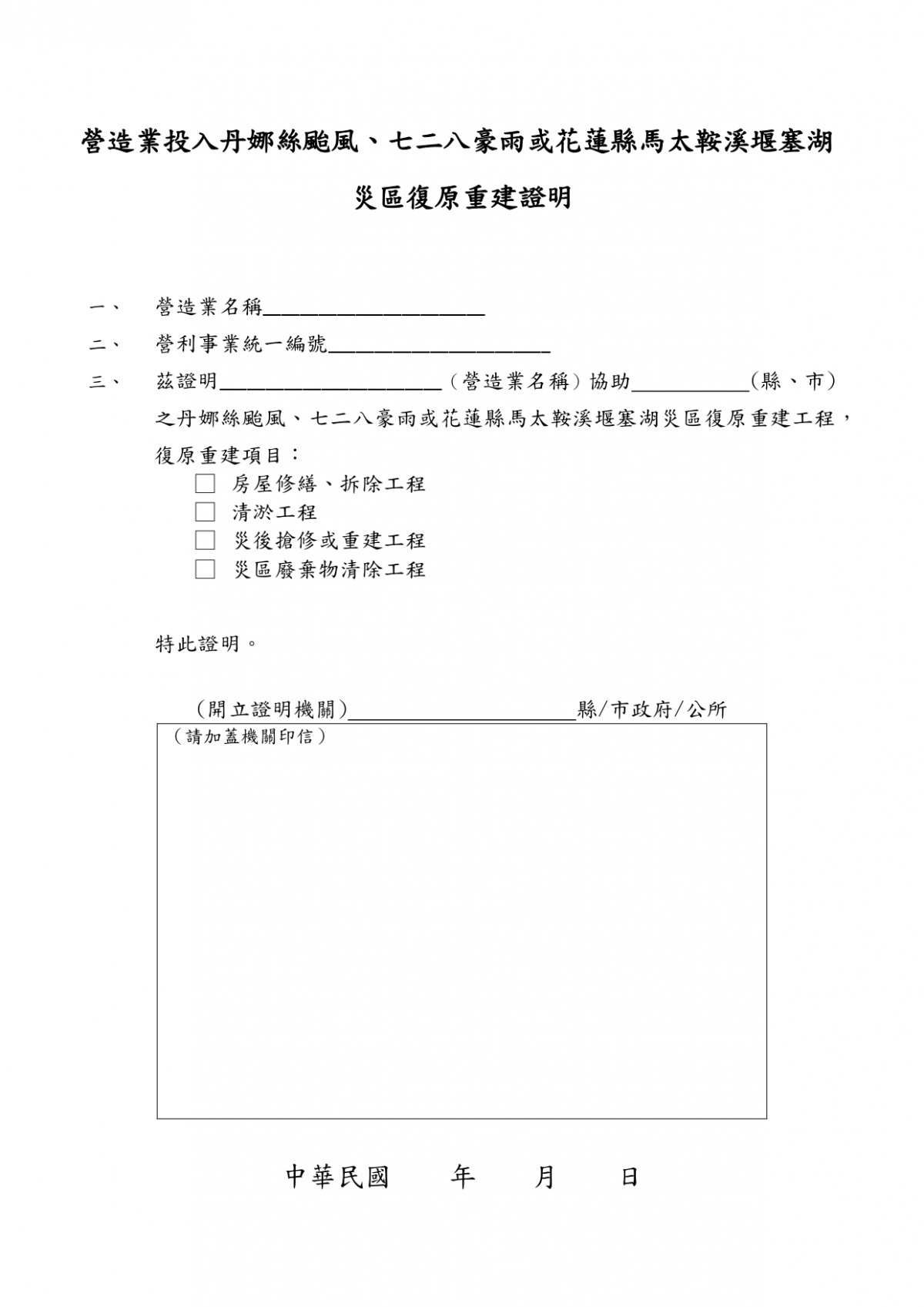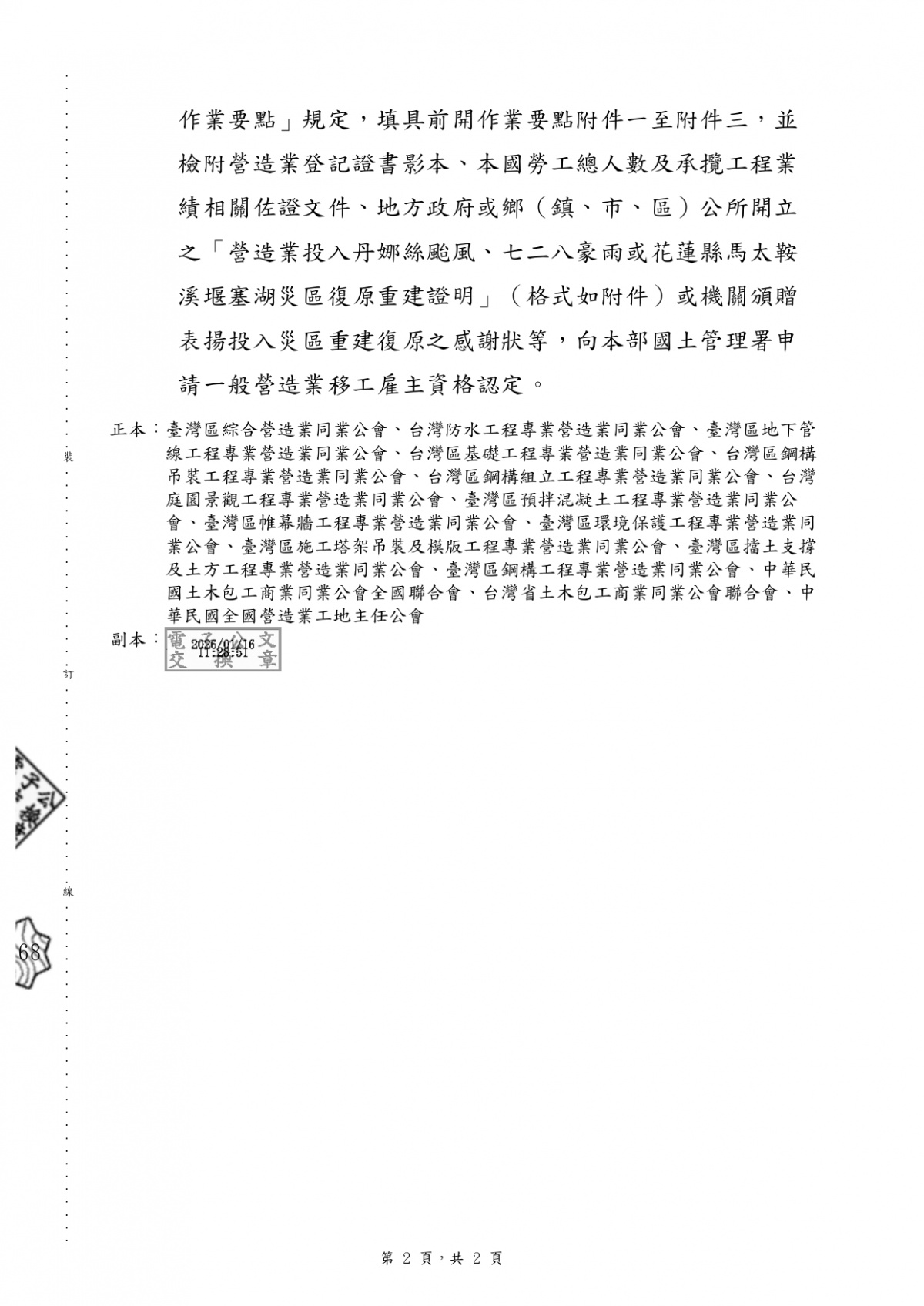 有關勞動部同意開放協助丹娜絲颱風、七二八豪雨或花蓮縣馬太鞍溪堰塞湖災區復原重建之營造業者得申請一般營造業移工名額1案