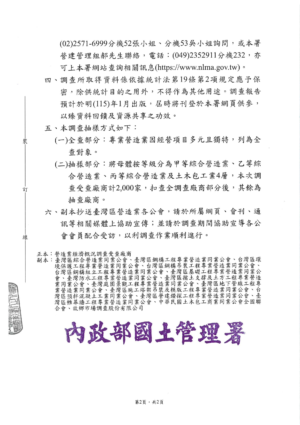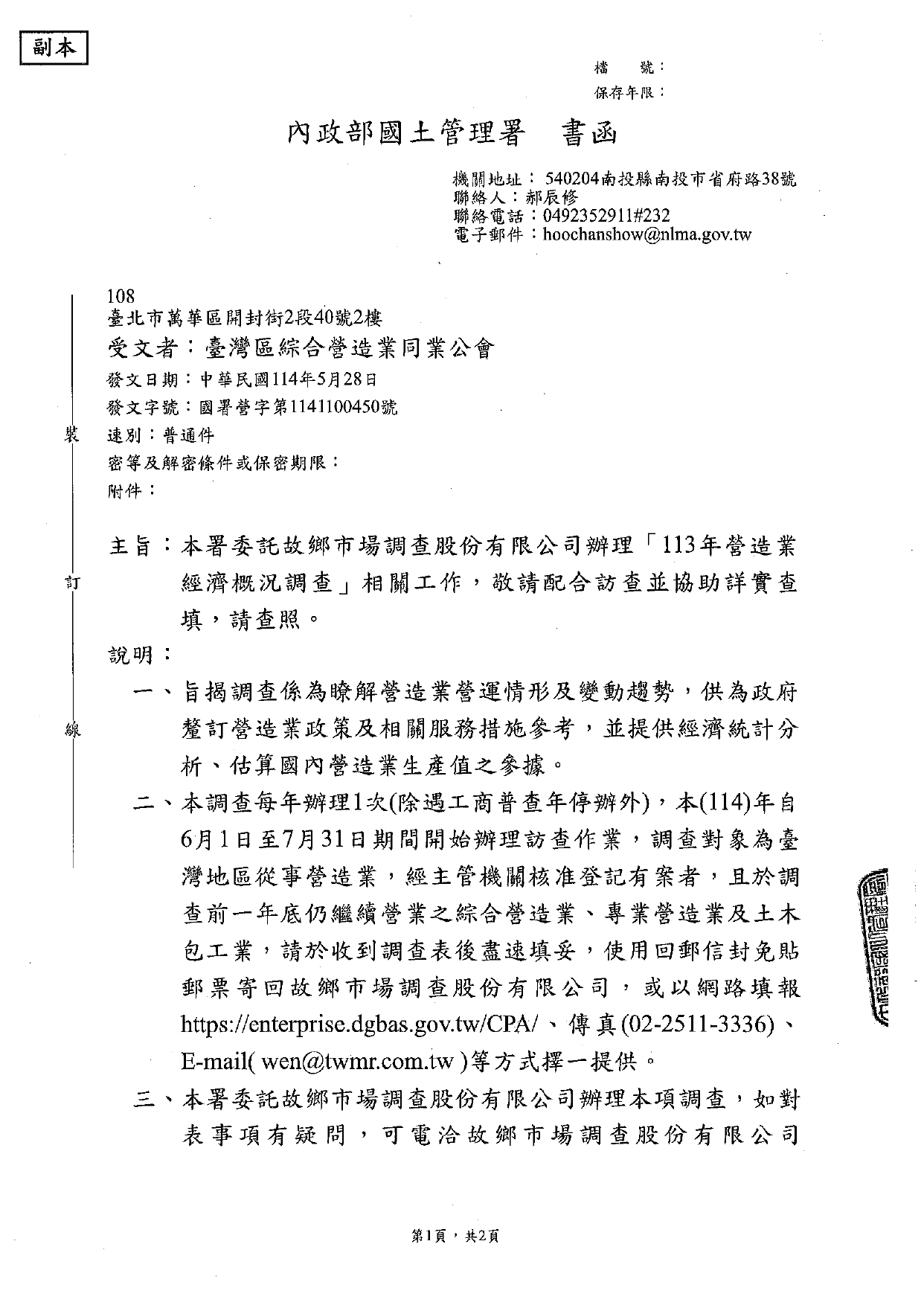 內政部國土管理署委託故鄉市場調查股份有限公司辦理「113年營造業經濟概況調查」相關工作,敬請配合訪查並協助詳實查填,請查收。