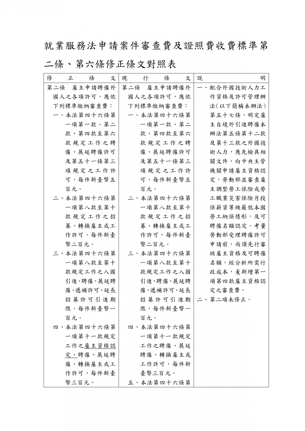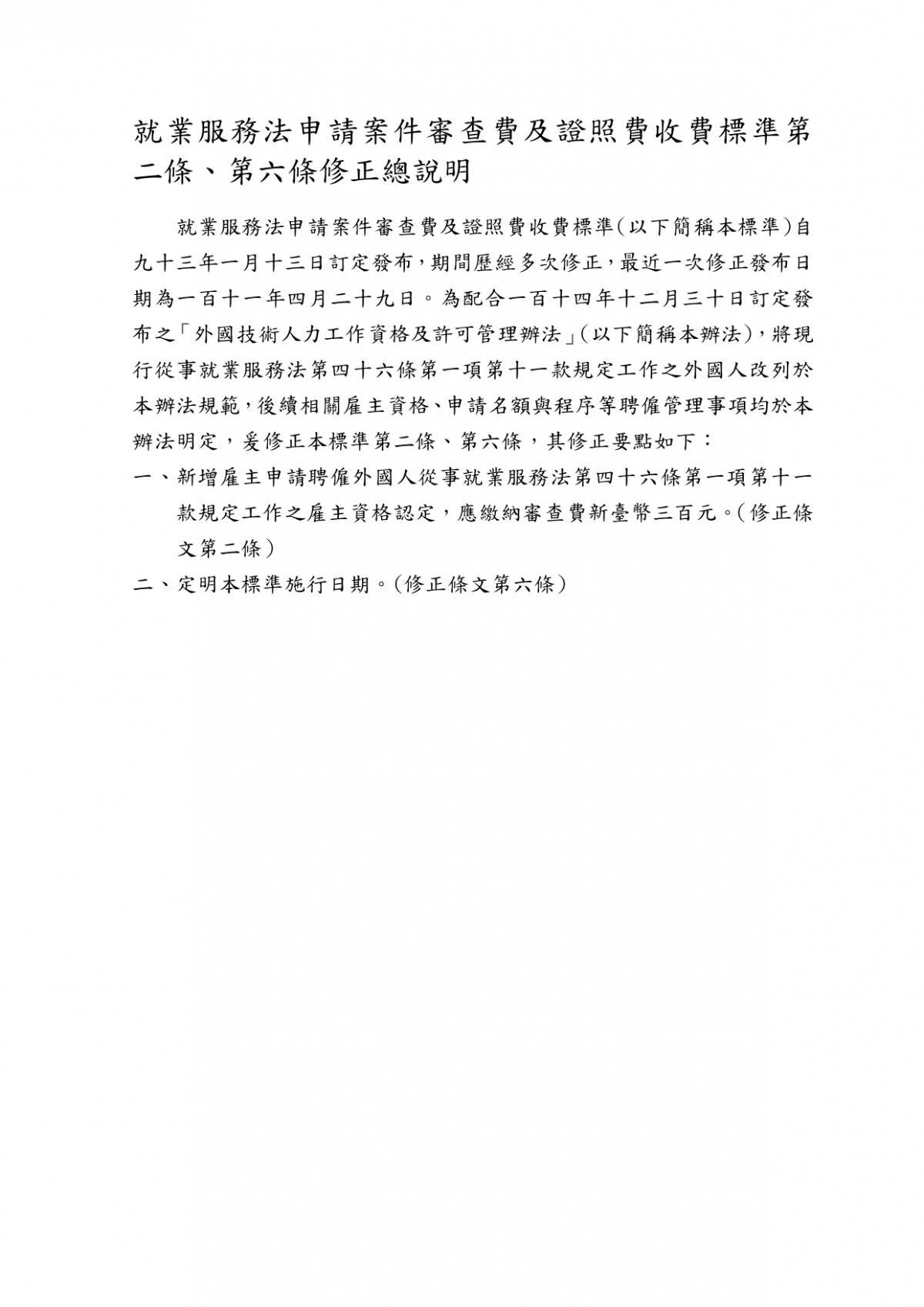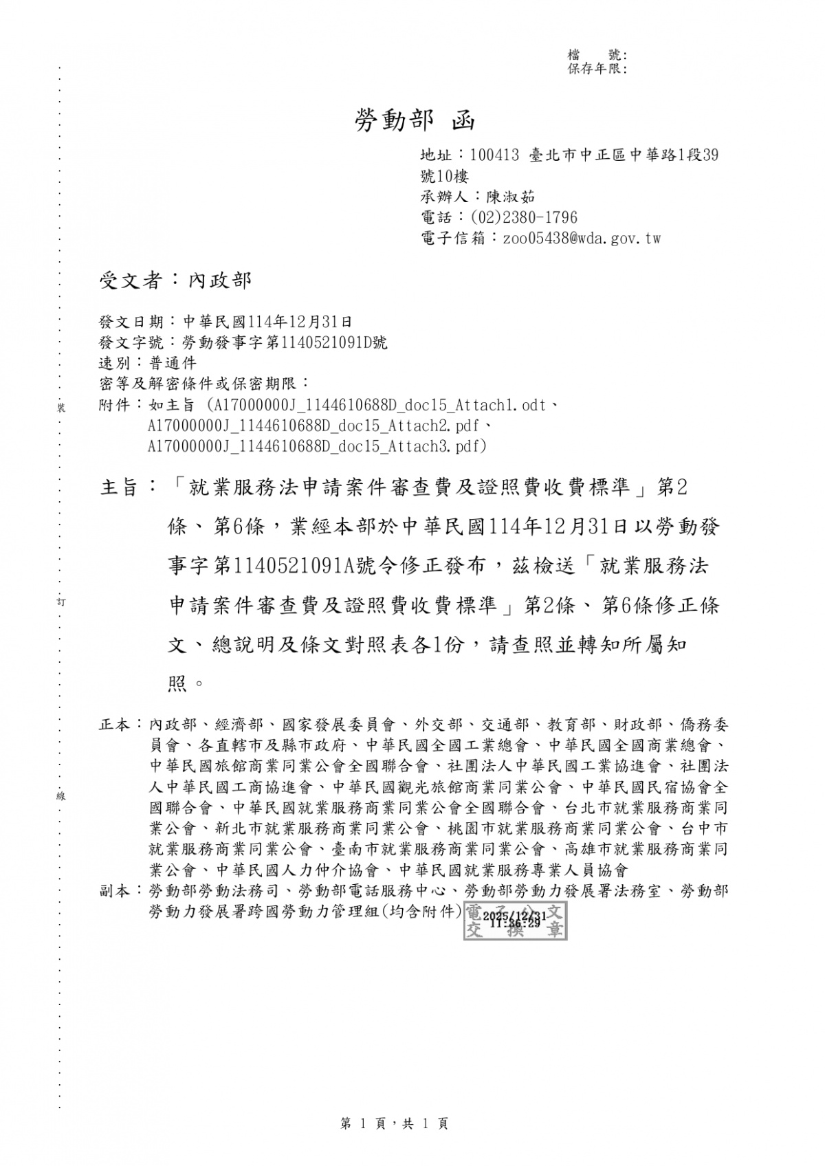 勞動部於中華民國114年12月31日以勞動發事字第1140521091A號令修正發布「就業服務法申請案件審查費及證照費收費標準」第2條、第6條修正條文