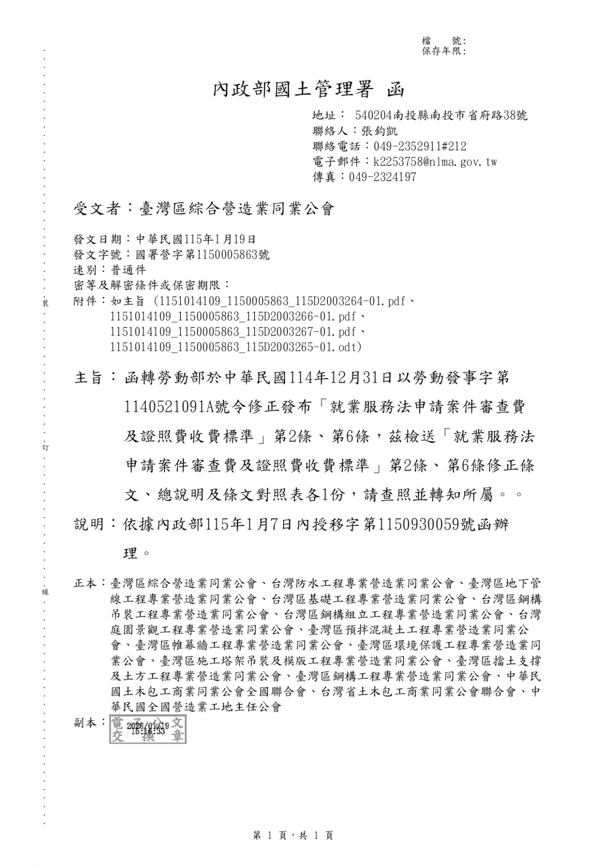 內政部國土管理署 115.1.19 國署營字第1150005863號函