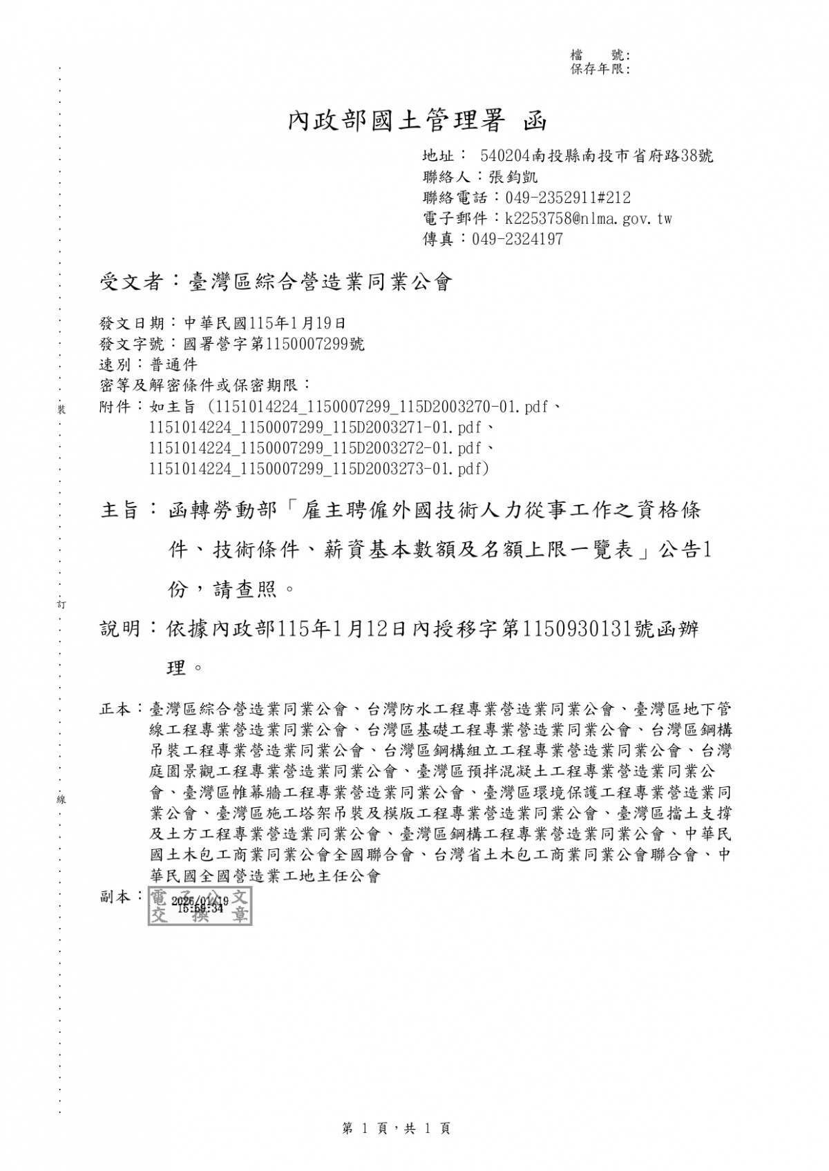 內政部國土管理署 115.1.19 國署營字第1150007299號函