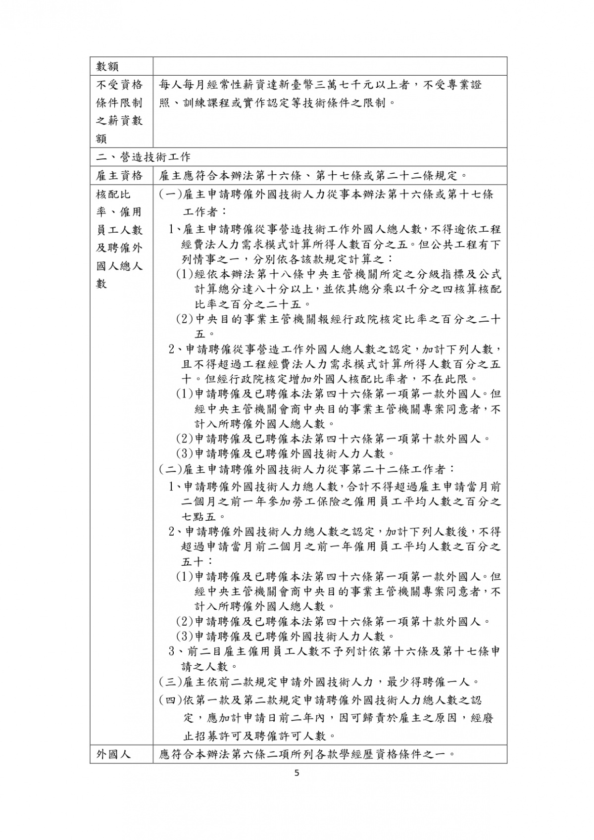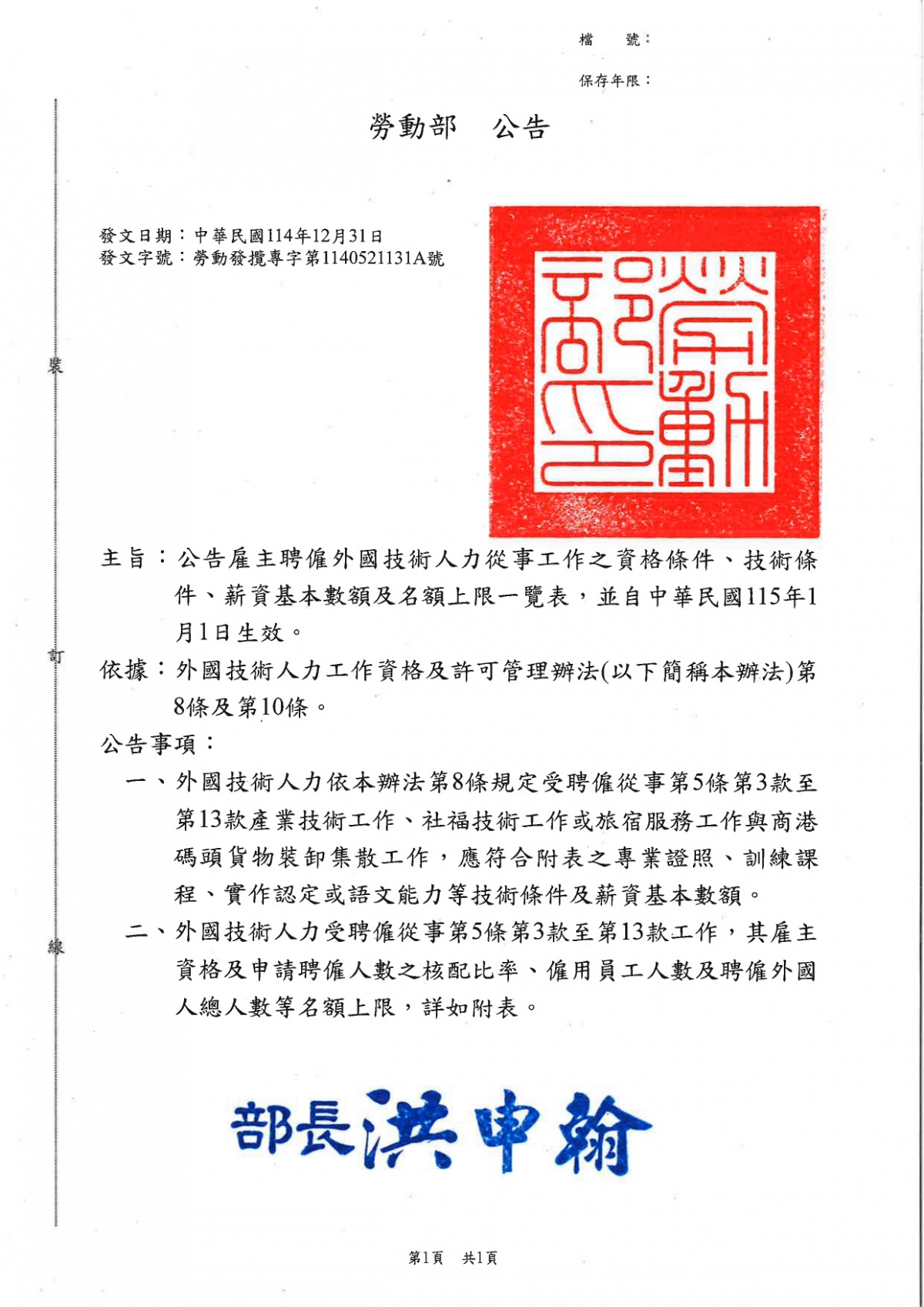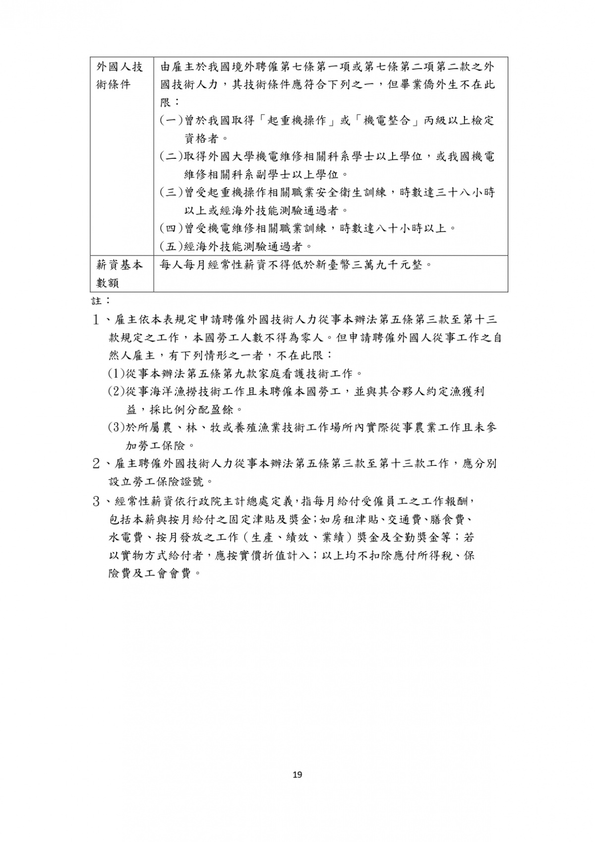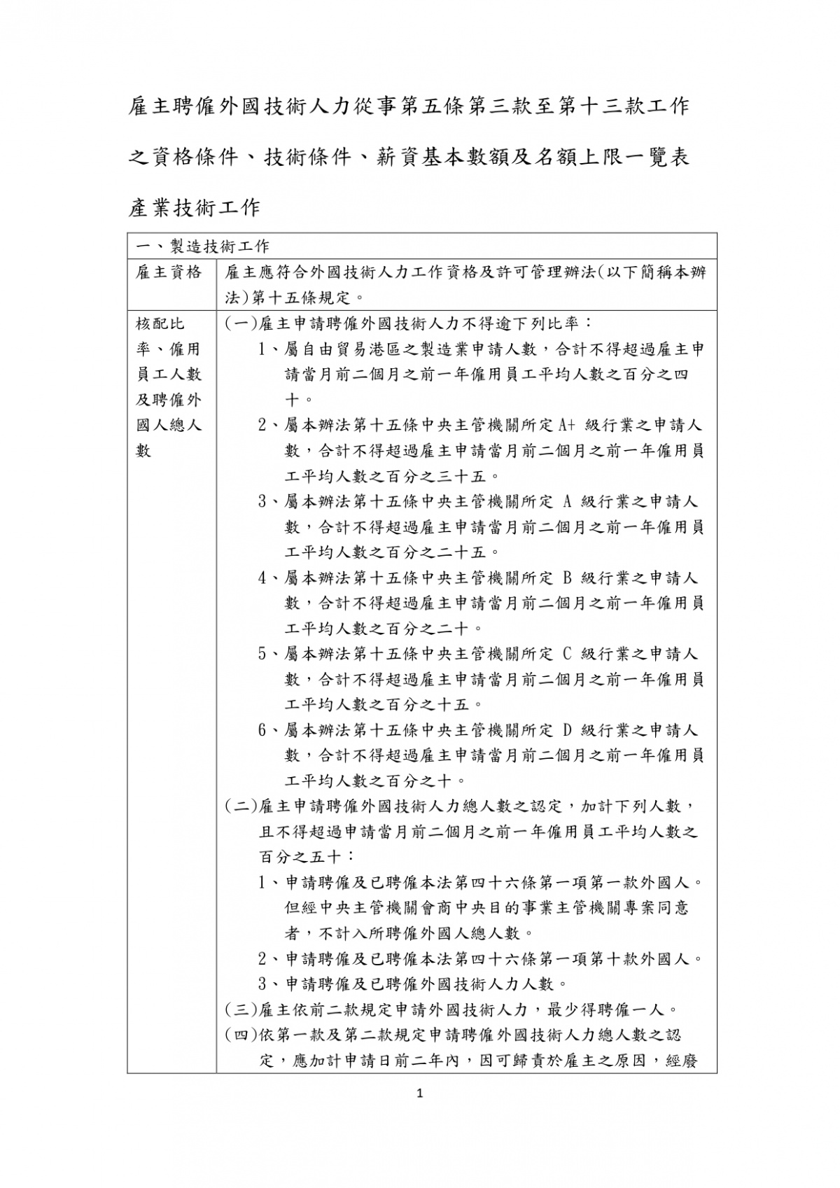 勞動部「雇主聘僱外國技術人力從事工作之資格條件、技術條件、薪資基本數額及名額上限一覽表」公告1份