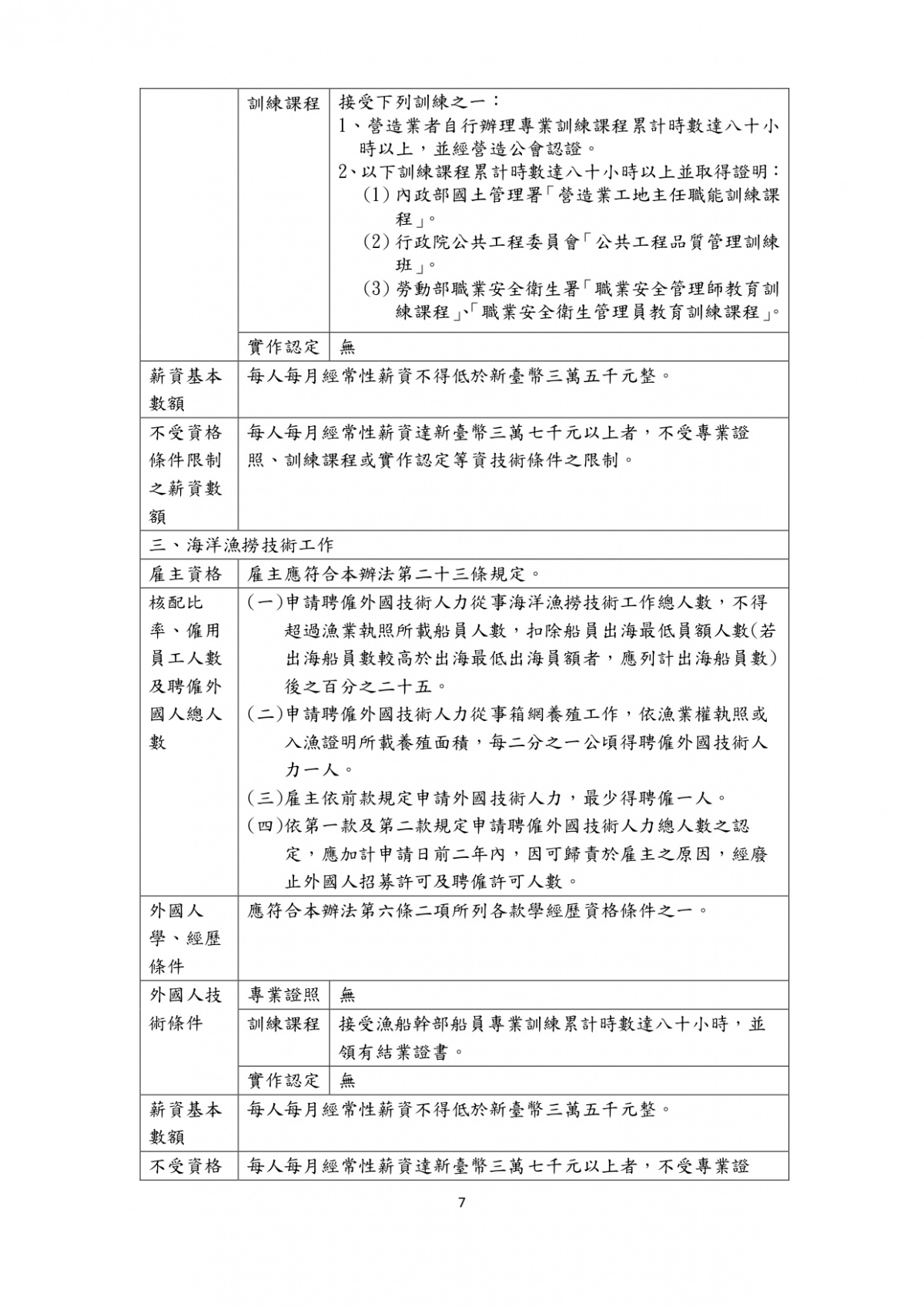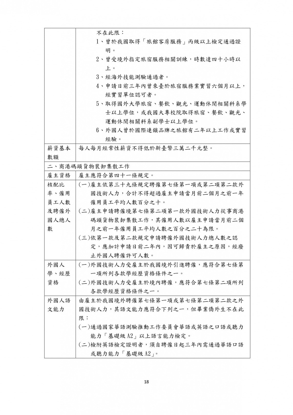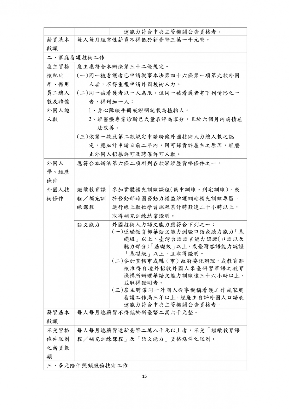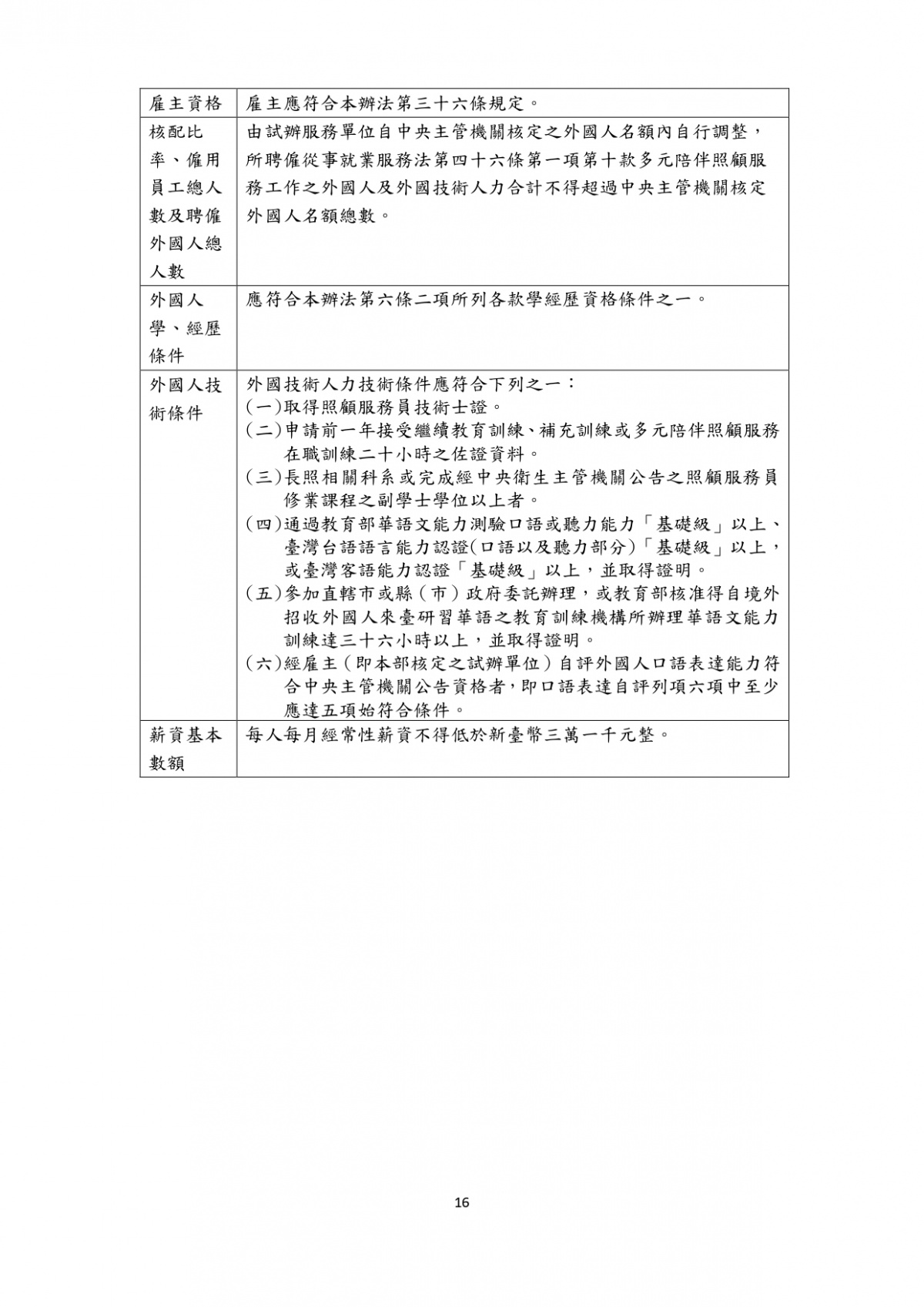 勞動部「雇主聘僱外國技術人力從事工作之資格條件、技術條件、薪資基本數額及名額上限一覽表」公告1份