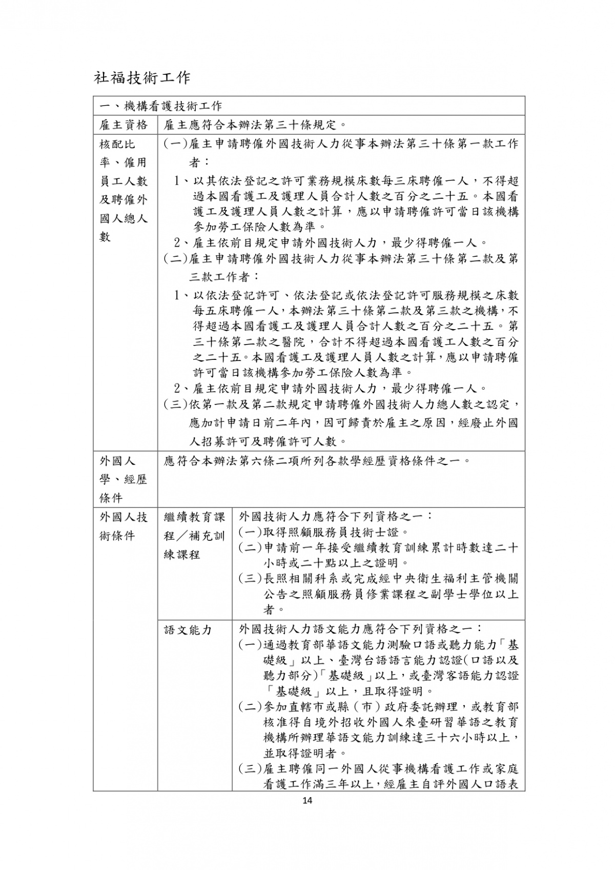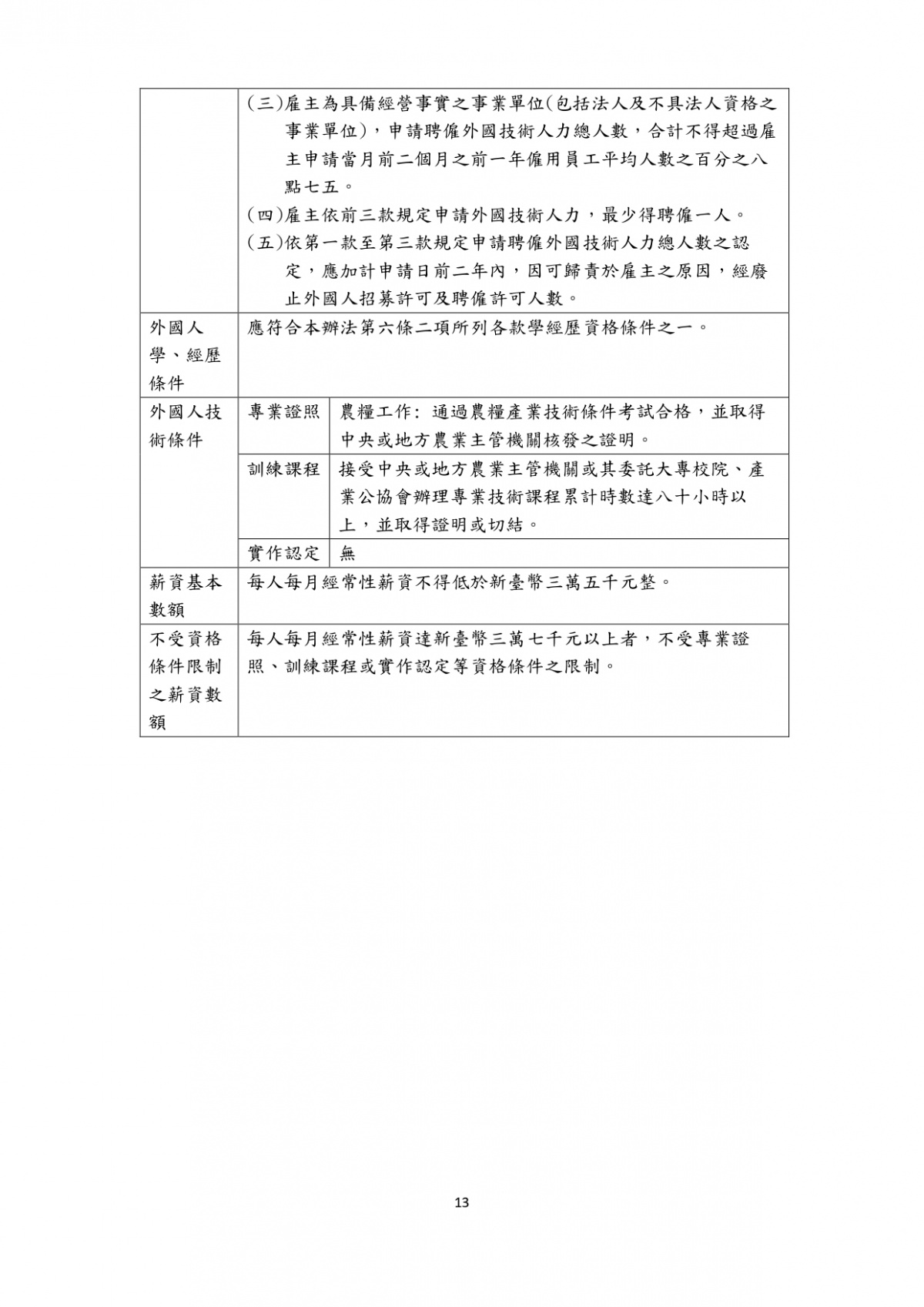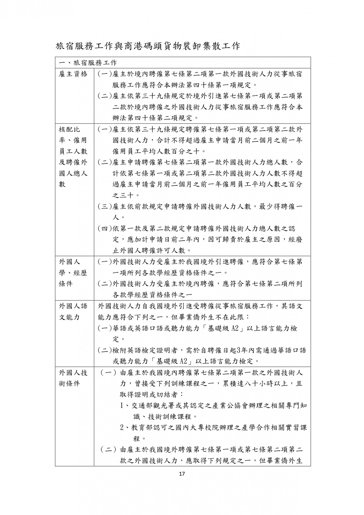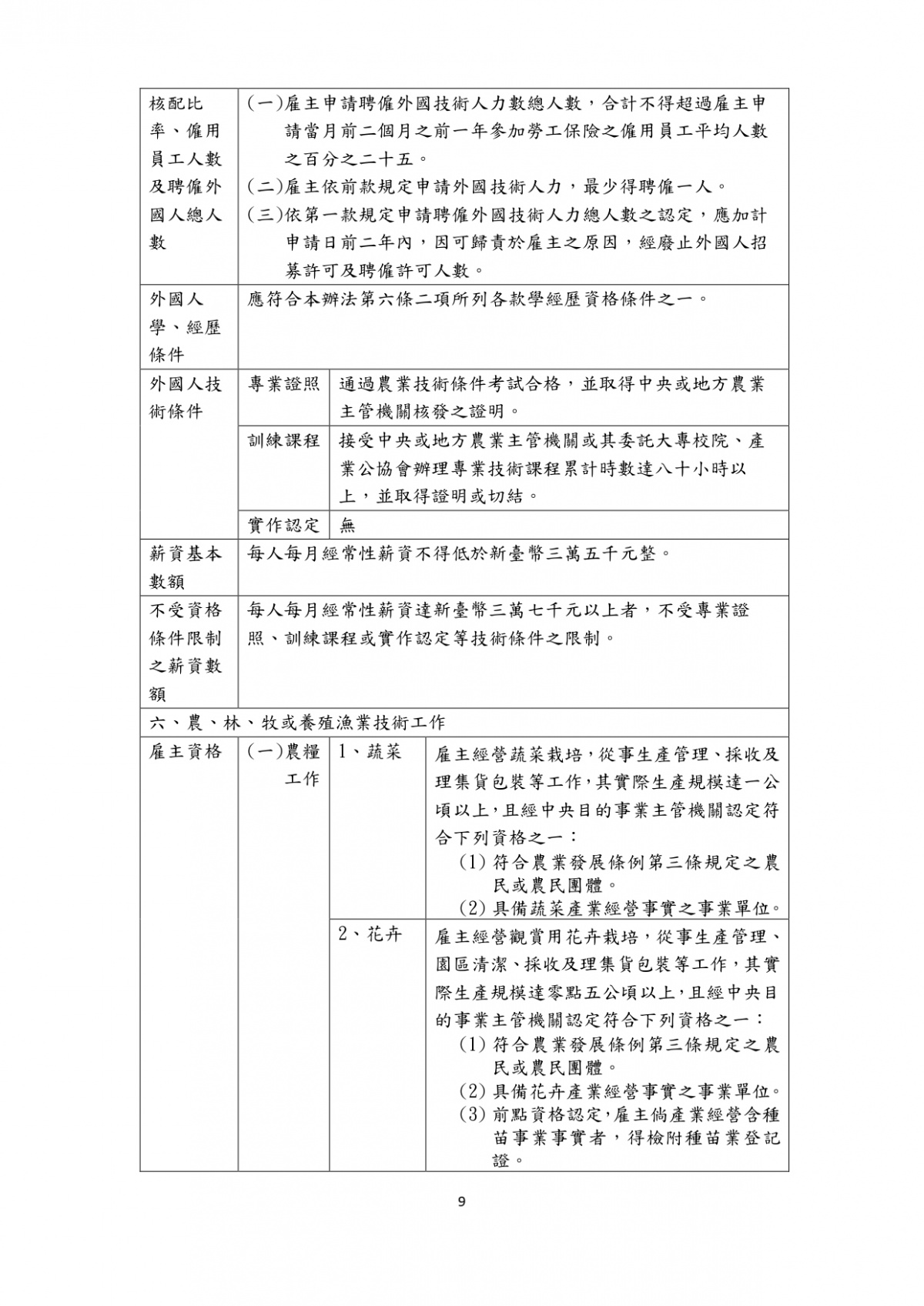 勞動部「雇主聘僱外國技術人力從事工作之資格條件、技術條件、薪資基本數額及名額上限一覽表」公告1份