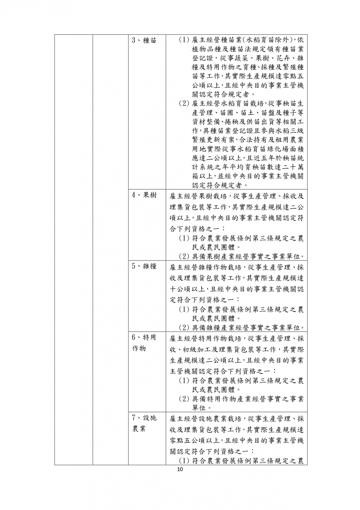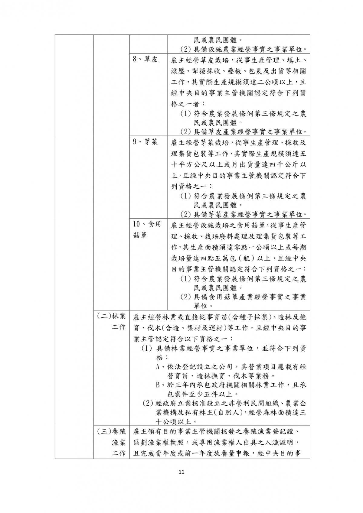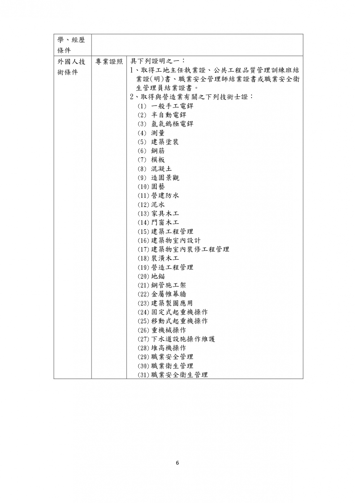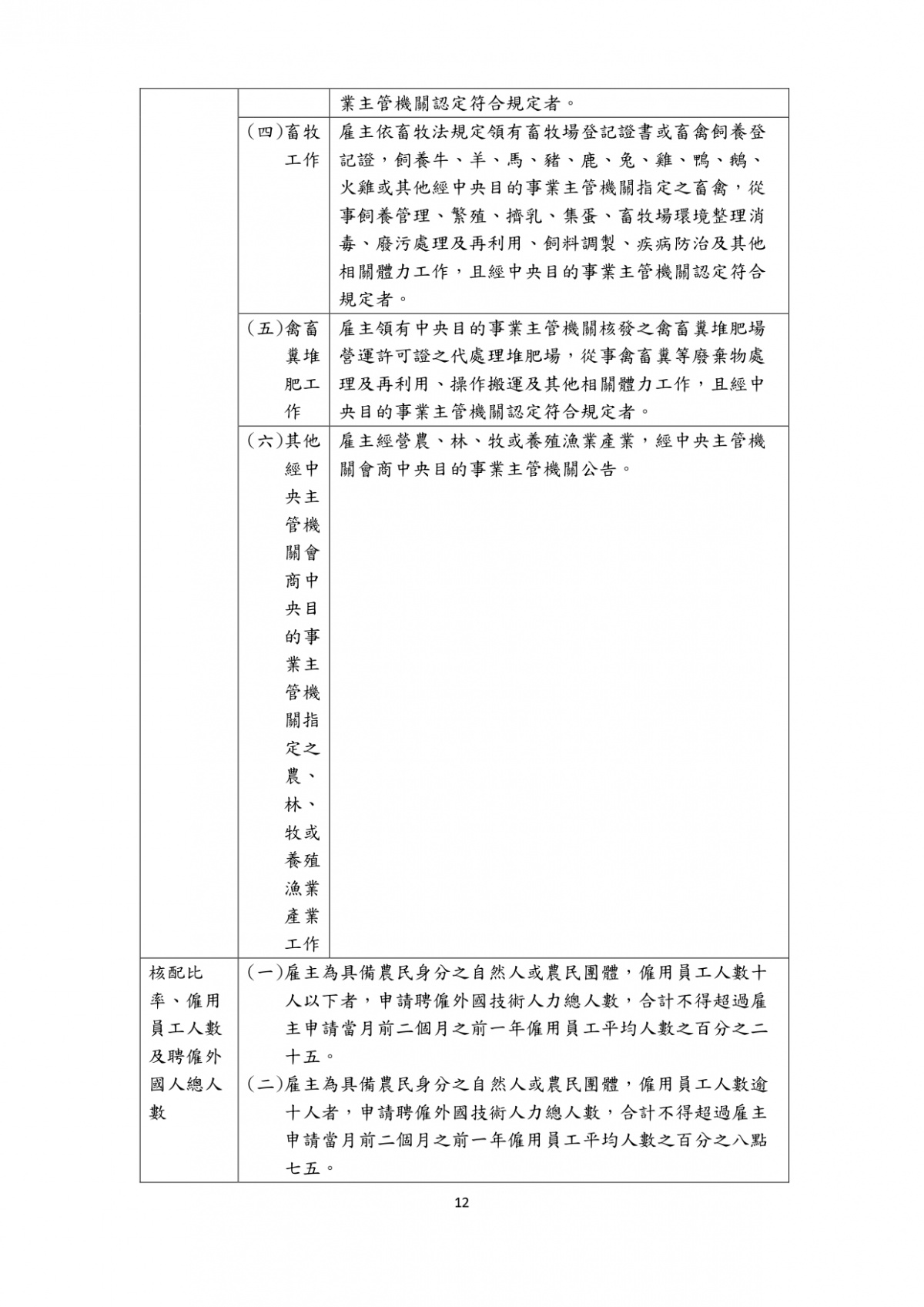 勞動部「雇主聘僱外國技術人力從事工作之資格條件、技術條件、薪資基本數額及名額上限一覽表」公告1份