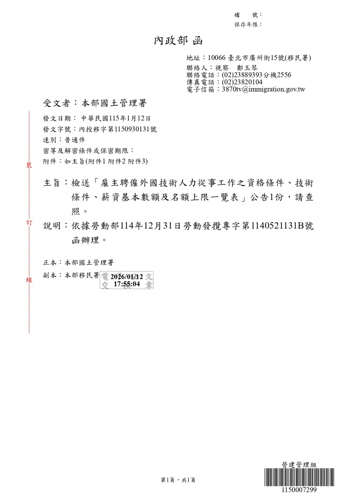 函轉勞動部「雇主聘僱外國技術人力從事工作之資格條件、技術條件、薪資基本數額及名額上限一覽表」公告1份