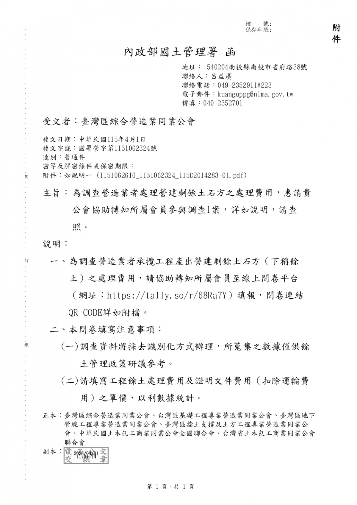 國土管理署「調查營造業者承攬工程產出營建剩餘土石方之處理費用」 2026-04-07 檔案下載 國土管理署 國署營字第1151062324號 調查營造業者承攬工程產出營建剩餘土石方之處理費用,請儘速 協助轉知所屬會員至線上問卷平台 (網址:https://tally.so/r/68Ra7Y)填報,或 掃QR CODE問卷連結填報。 本問卷填寫注意事項: (一)調查資料將採去識別化方式辦理,所蒐集之數據僅供餘土管理政策研議參考。 (二)請填寫工程餘土處理費用及證明文件費用(扣除運輸費用)之單價,以利數據統計。