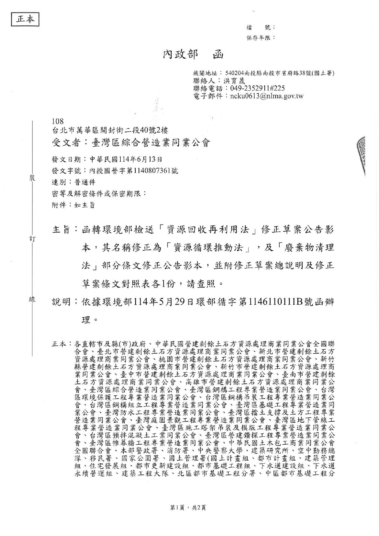 內政部函轉環境部檢送「資源回收再利用」修正草案公告影本,其名稱修正為「資源循環推動法」,及「廢棄物清理法」部分條文修正公告影本