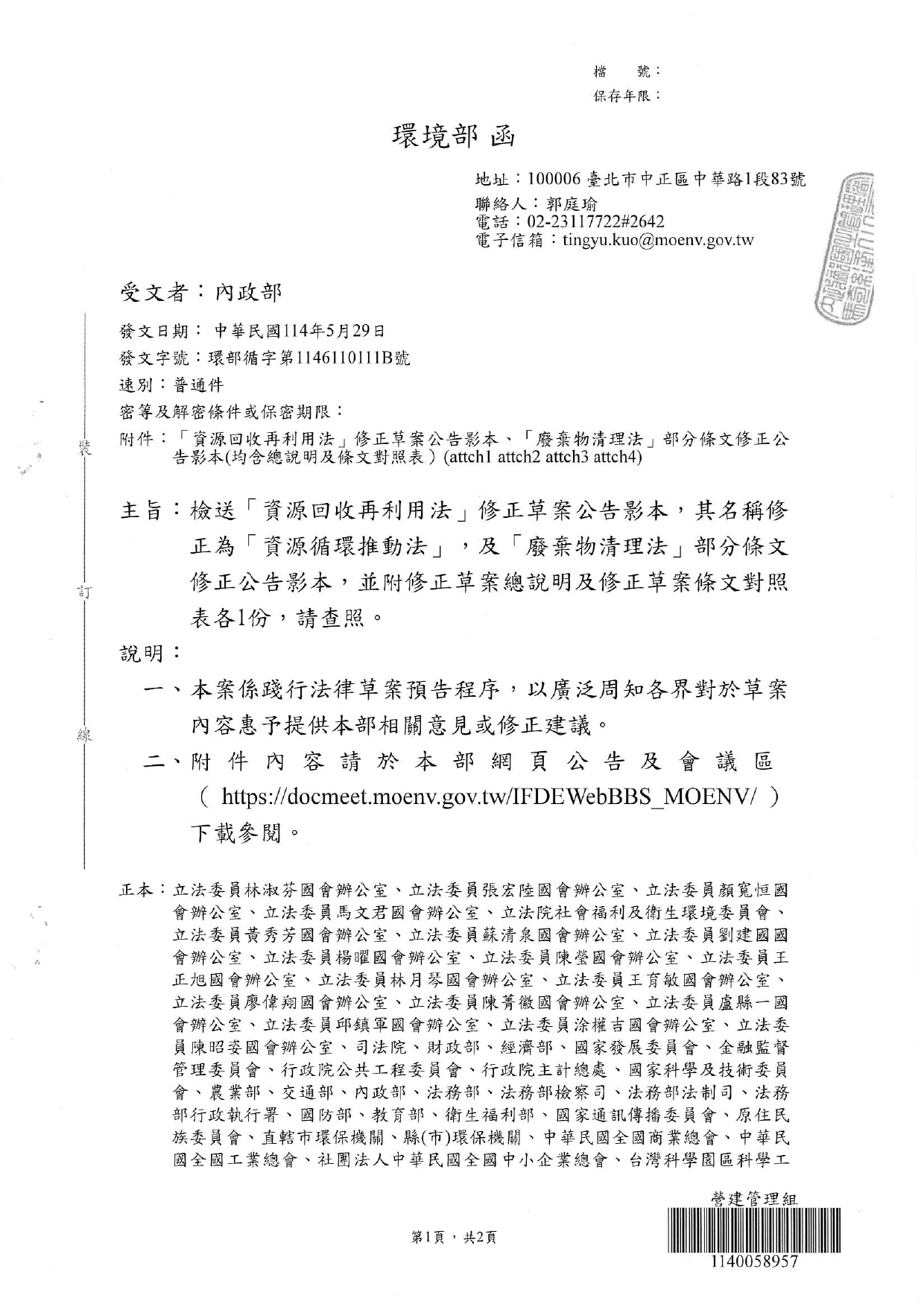 函轉環境部檢送「資源回收再利用」修正草案公告影本,其名稱修正為「資源循環推動法」,及「廢棄物清理法」部分條文修正公告影本