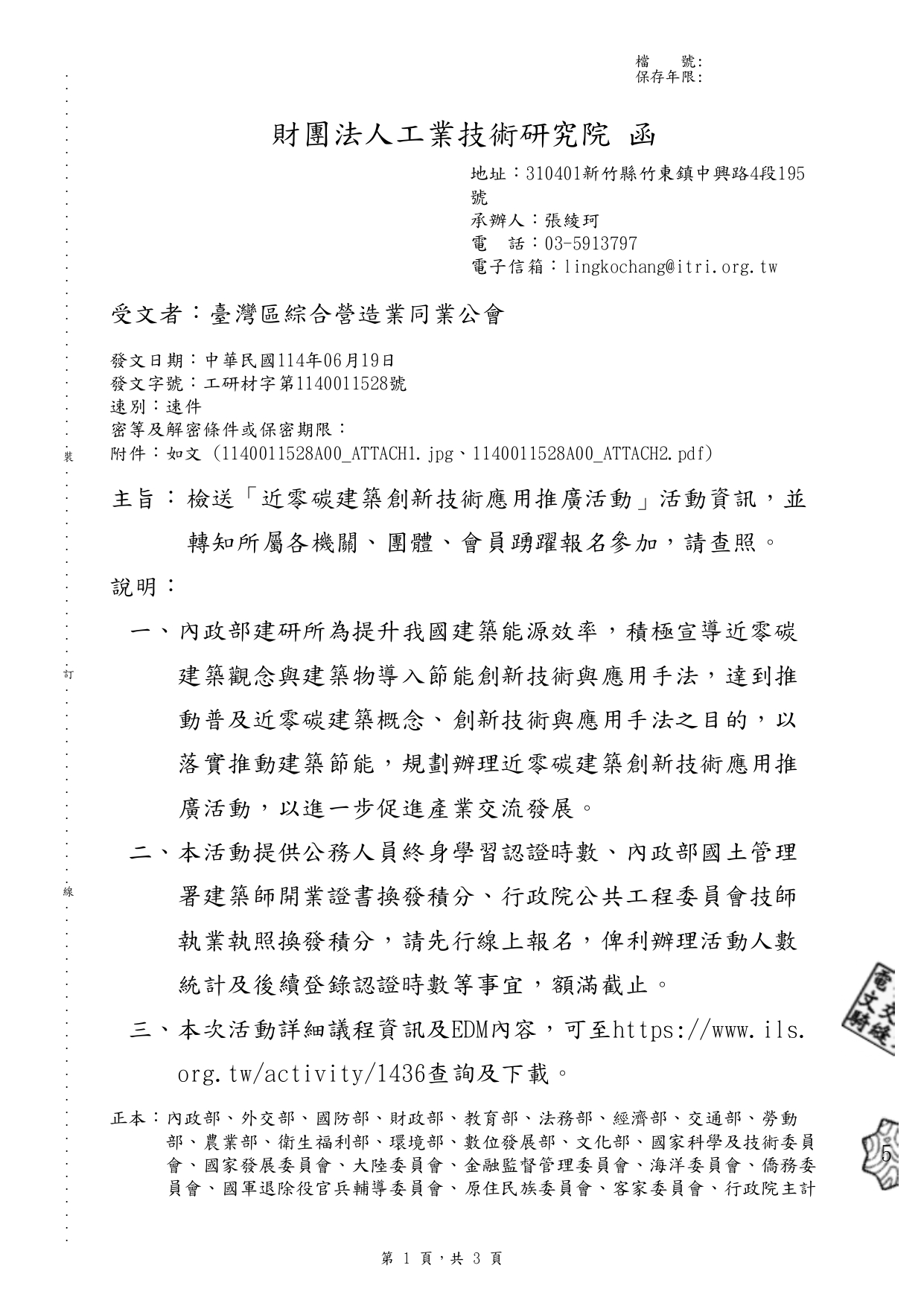 財團法人工業技術研究院 檢送「近零碳建築創新技術應用推廣活動」活動資訊