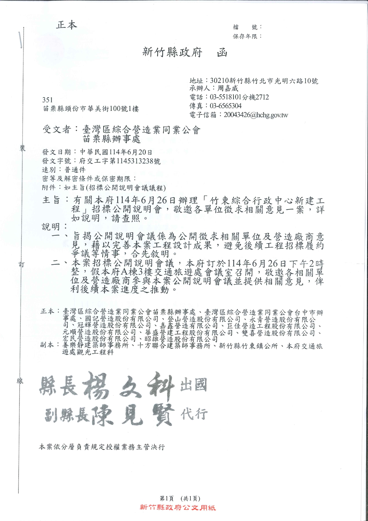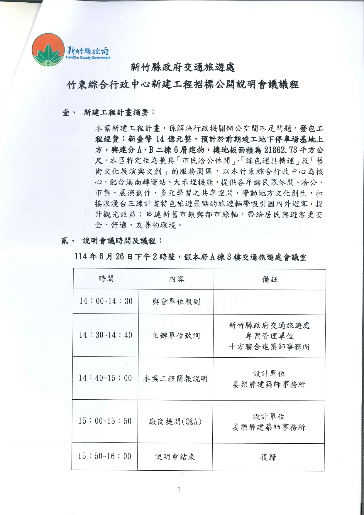 新竹縣政府114年6月26日辦理「竹東綜合行政中心新建工程」招標公開說明會