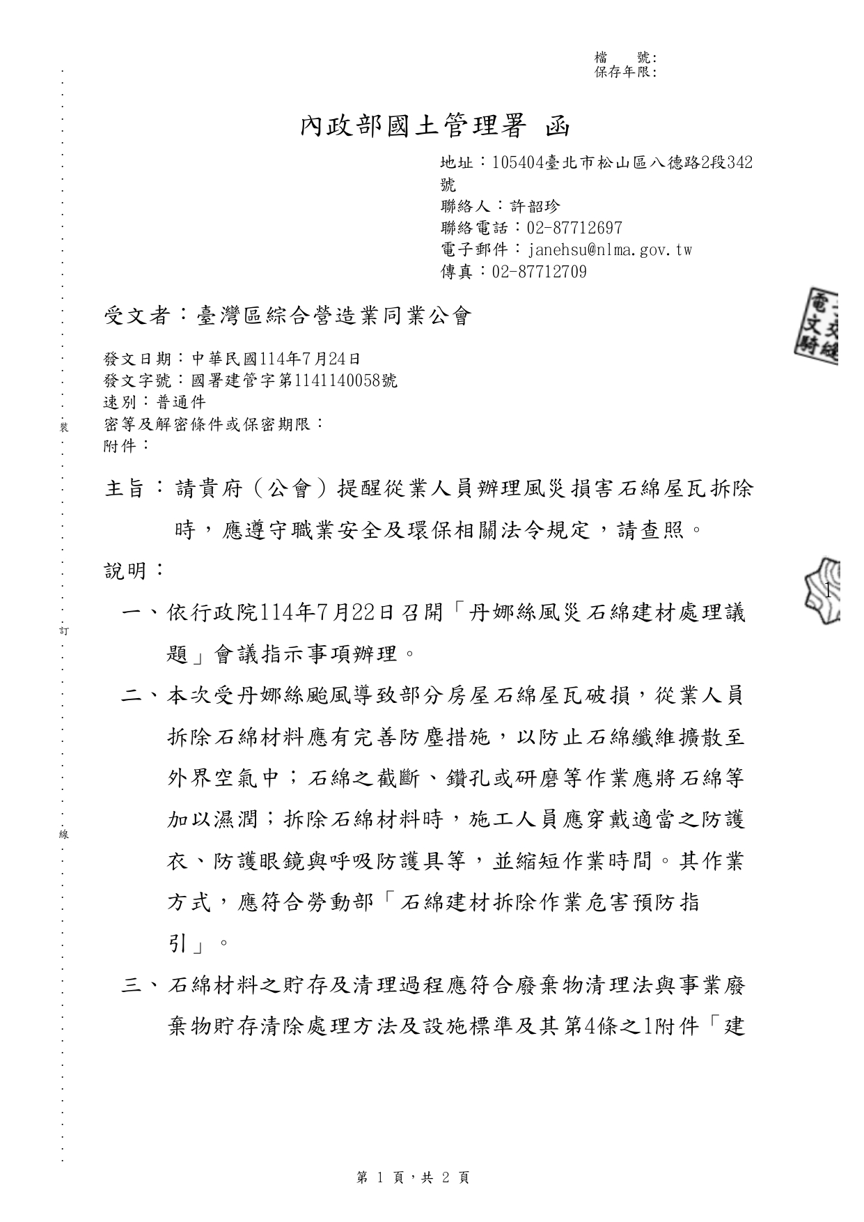 內政部國土管理署 114.7.24 國署建管字第1141140058號函