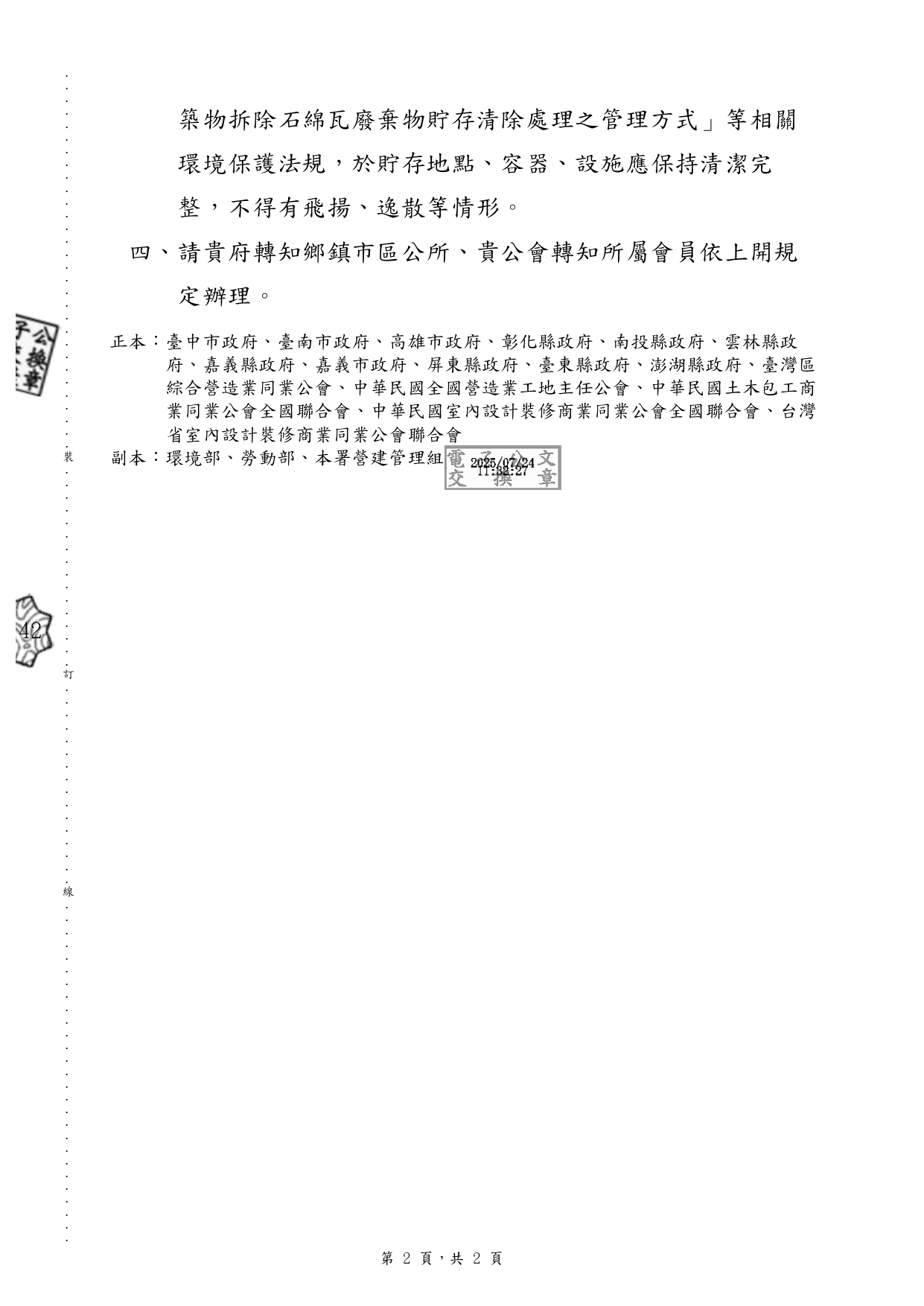 國土署有關「提醒從業人員辦理風災損害石綿屋瓦拆除時,應遵守職業安全及環保相關法令規定」