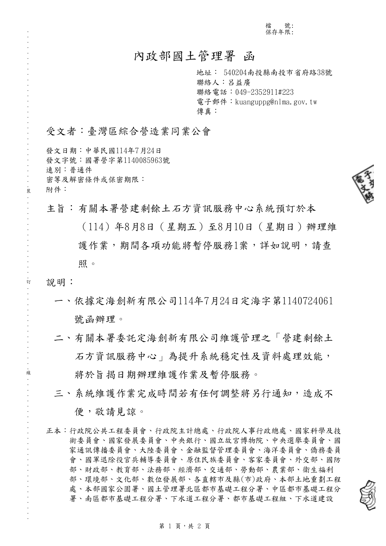 有關內政部國土管理署營建剩餘土石方資訊服務中心系統預訂於本(114)年8月8日(星期五)至8月10日(星期日)辦理維護作業,期間各項功能將暫停服務1案,詳如說明