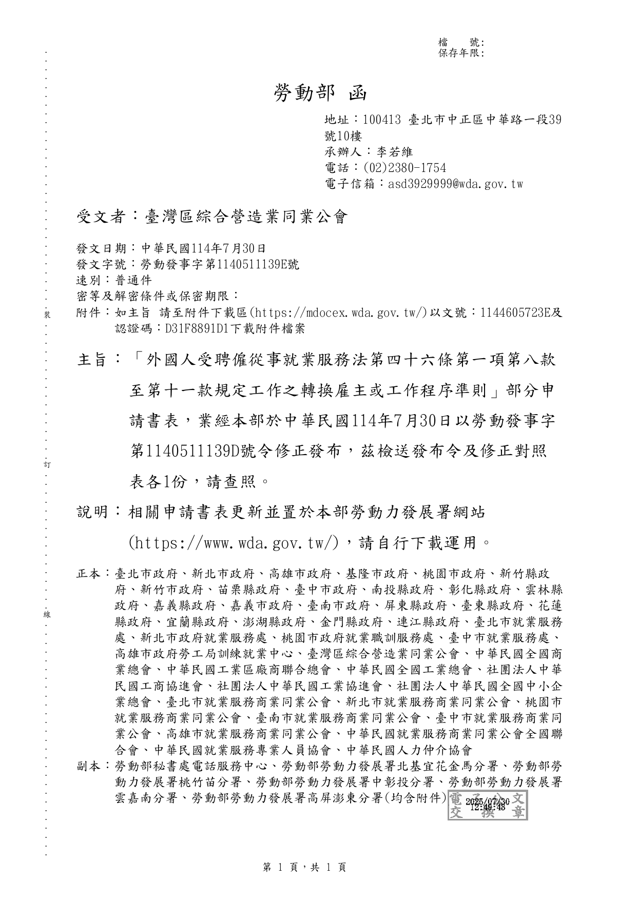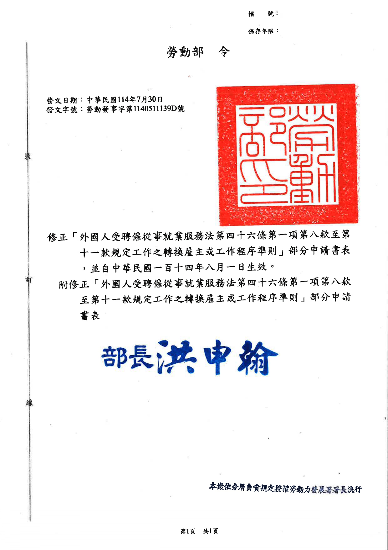 勞動部「外國人受聘僱從事就業服務法第四十六條第一項第八款至第十一款規定工作之轉換雇主或工作程序準則」 2025-08-01 勞動部114.07.30 勞動發事字第1140511139E號 「外國人受聘僱從事就業服務法第四十六條第一項第八款至第十一款規定工作之轉換雇主或工作程序準則」