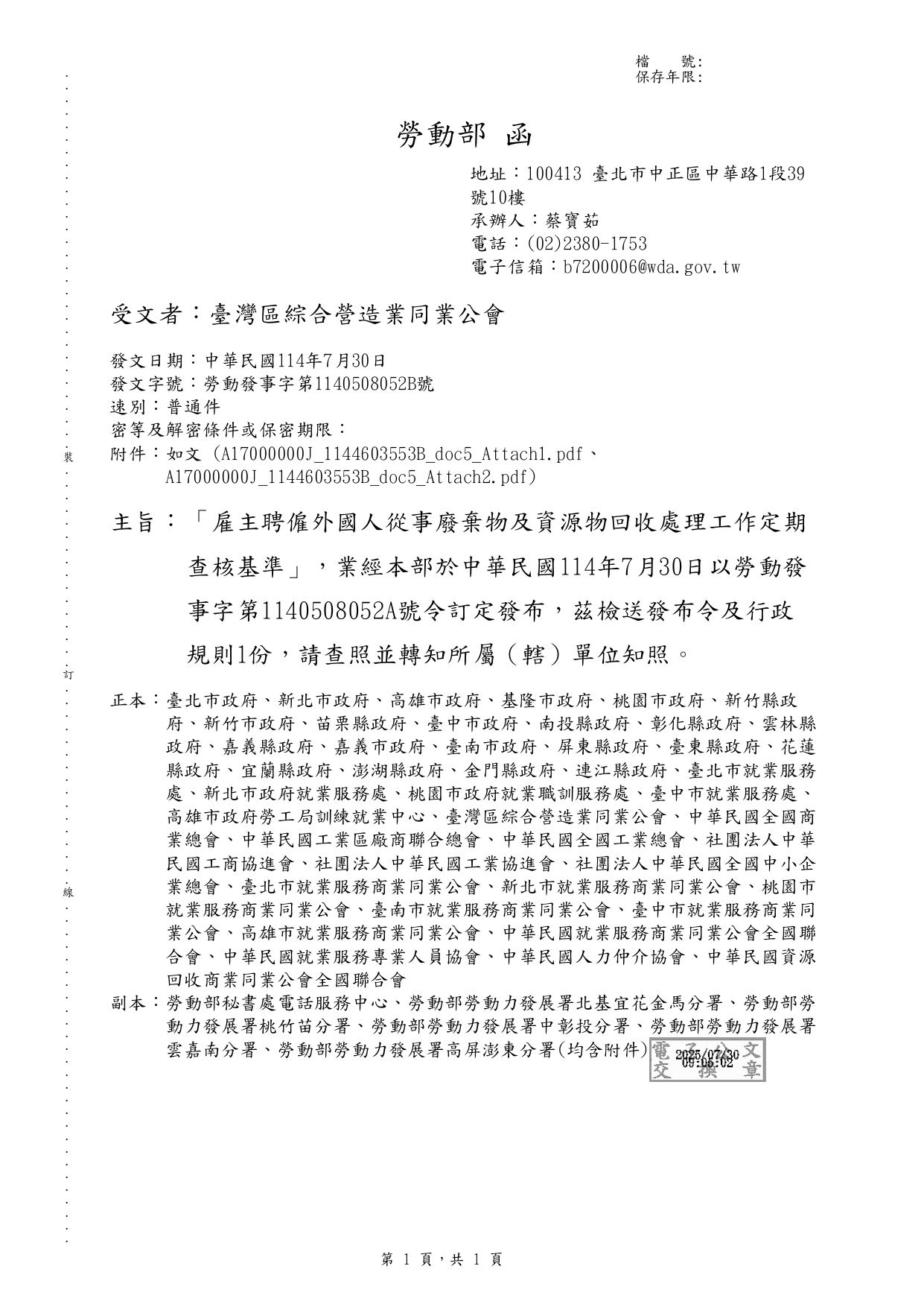 勞動部 114.7.30 勞動發事字第1140508052B號函