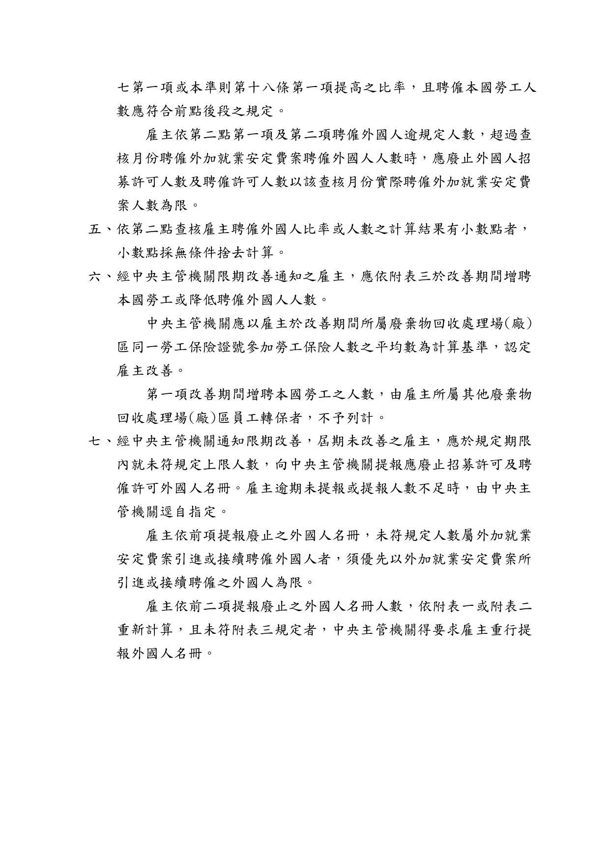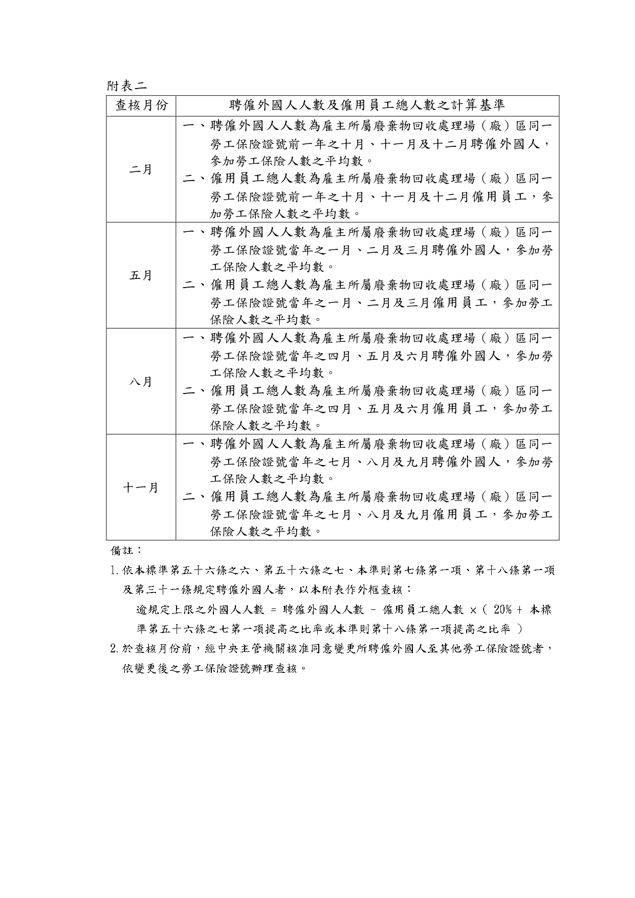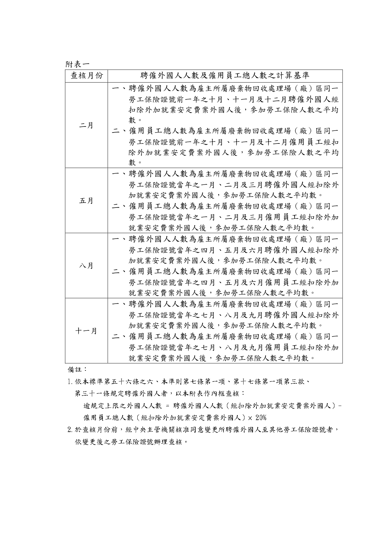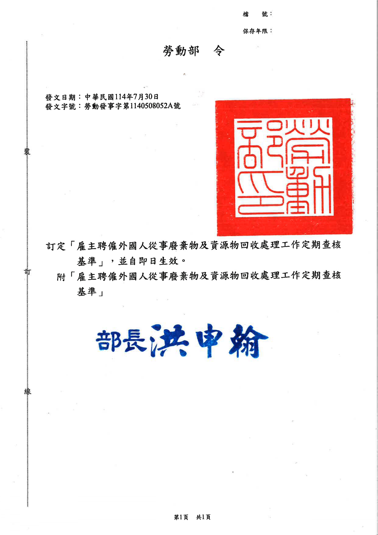 有關「雇主聘僱外國人從事廢棄物及資源物回收處理工作定期查核基準」,業經本部於中華民國114年7月30日以勞動發事字第1140508052A號令訂定發布,茲檢送發布令及行政規則1份