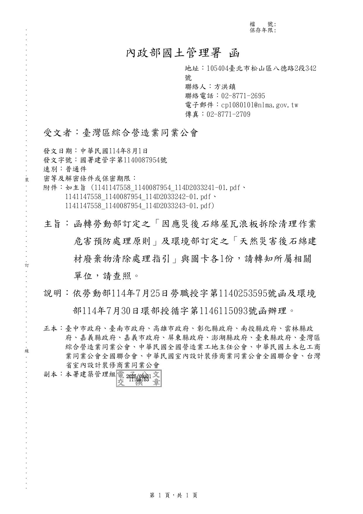 內政部國土管理署 114.8.1 國署建管字第1140087954號函