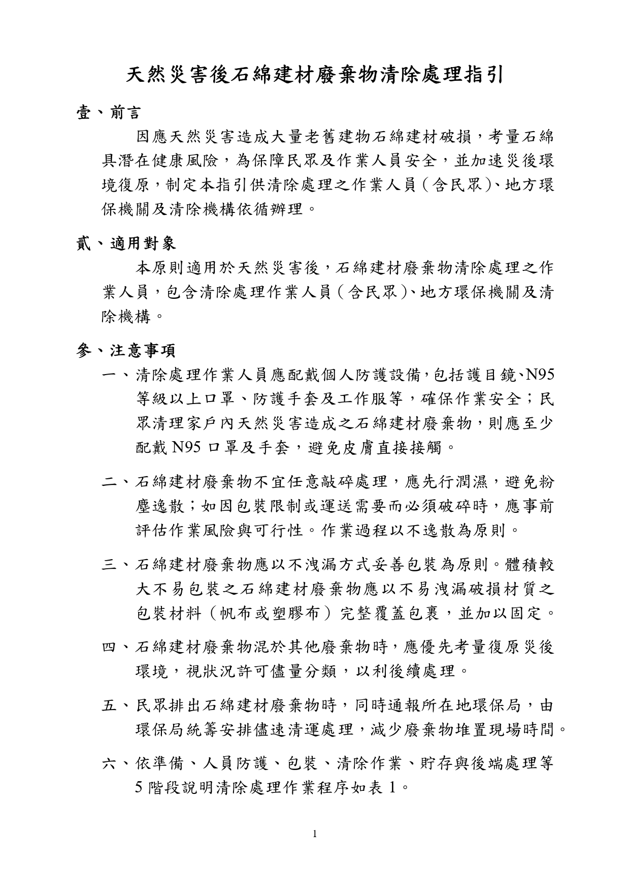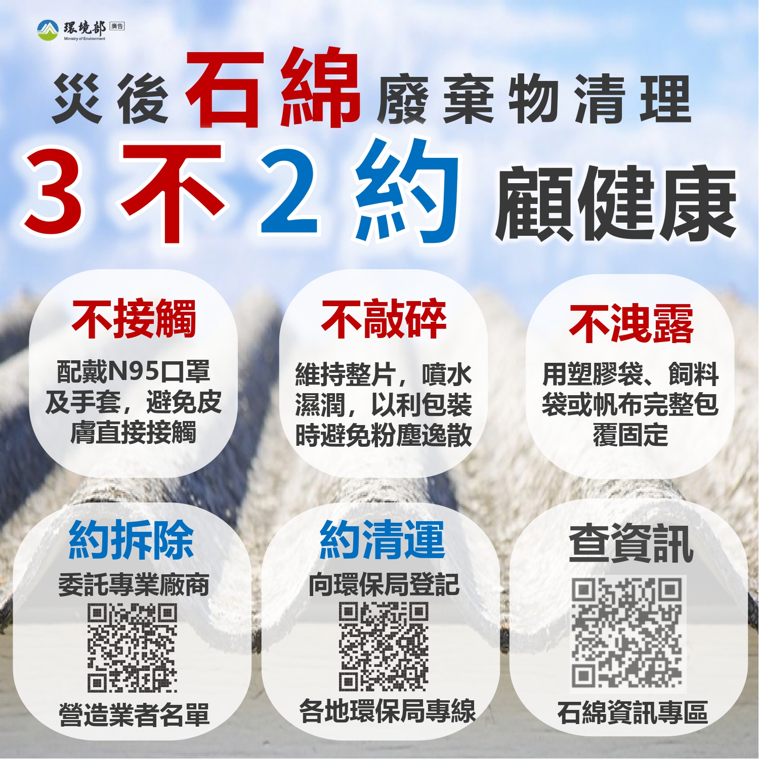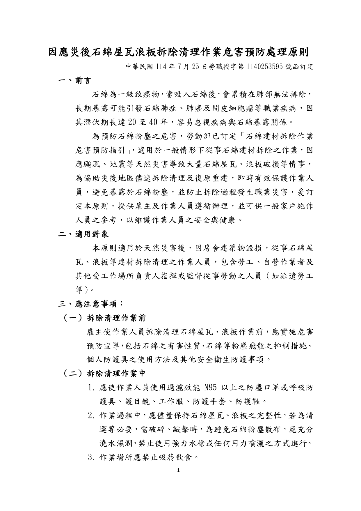 國土署函轉勞動部訂定之「因應災後石綿屋瓦浪板拆除清理作業危害預防處理原則」及環境部訂定之「天然災害後石綿建材廢棄物清除處理指引」與圖卡各1份