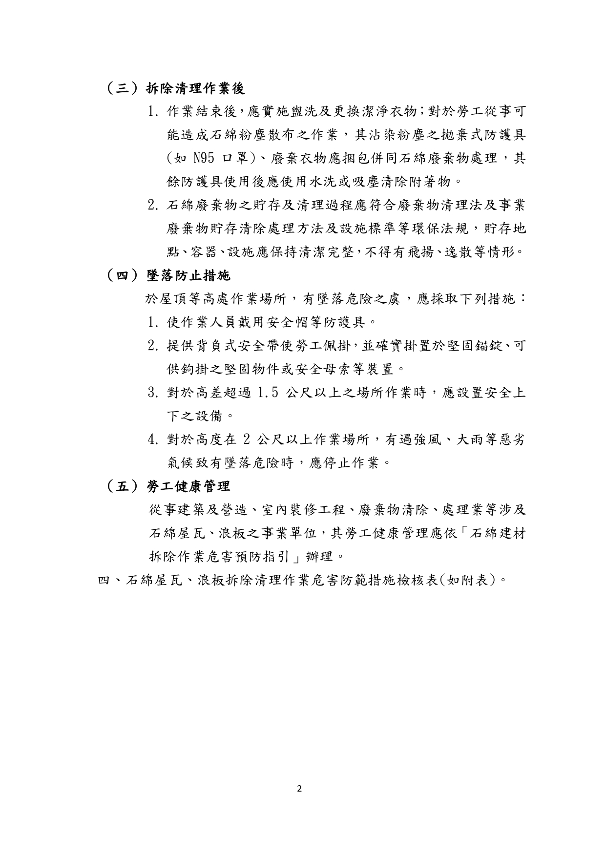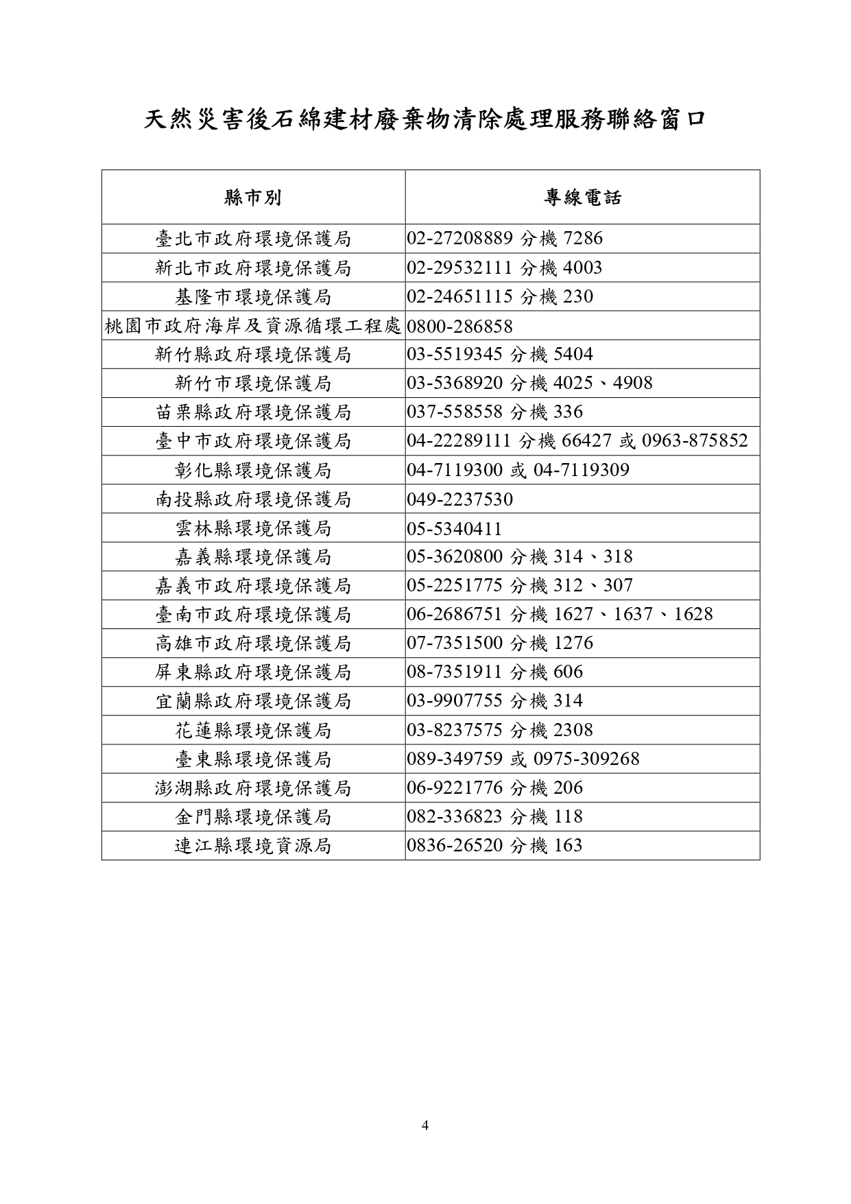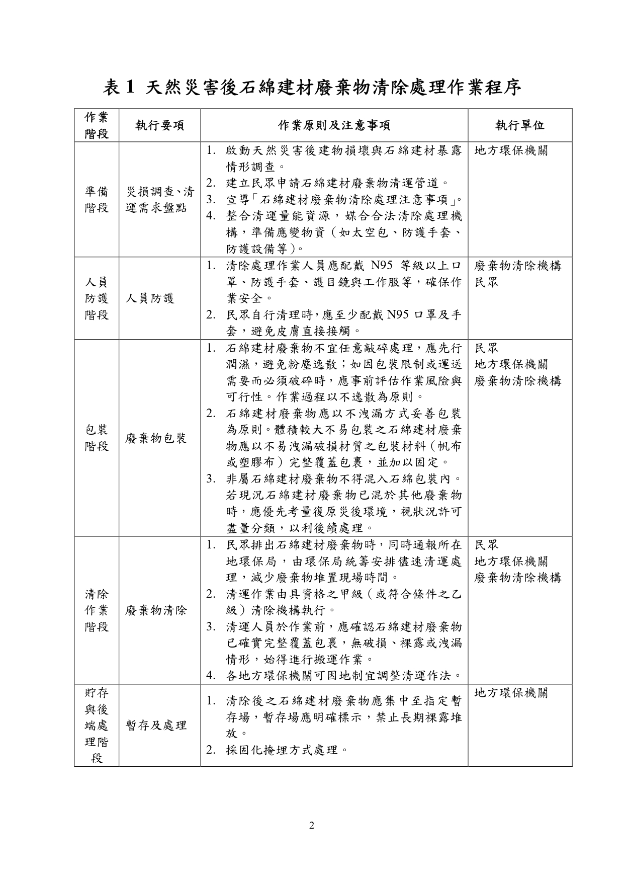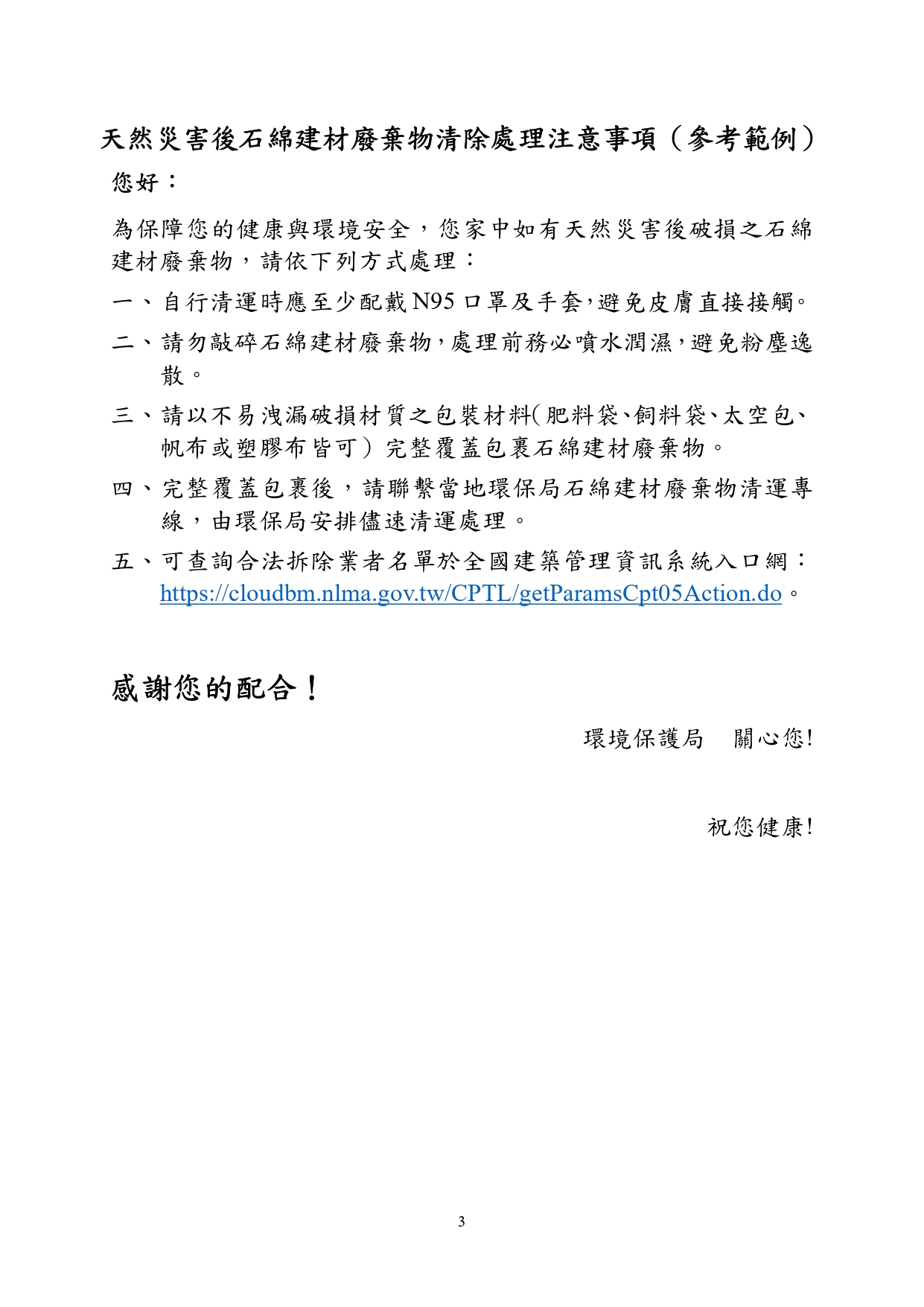 國土署函轉勞動部訂定之「因應災後石綿屋瓦浪板拆除清理作業危害預防處理原則」及環境部訂定之「天然災害後石綿建材廢棄物清除處理指引」與圖卡各1份
